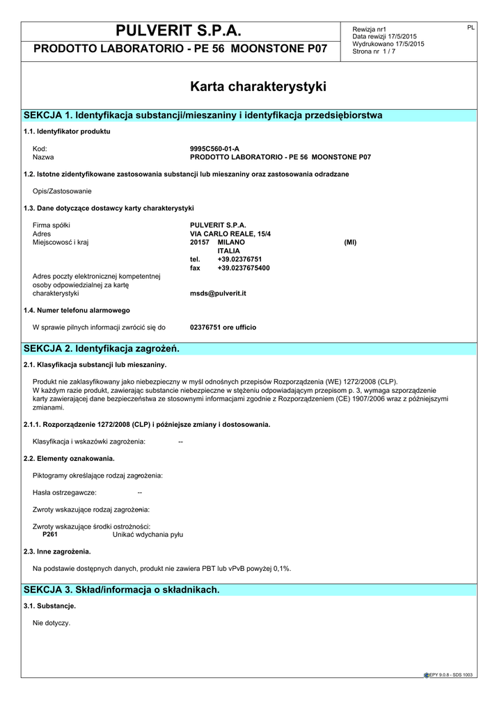 PULVERIT S.P.A. PL Rewizja nr1 Data rewizji 17/5/2015 Wydrukowano 17/5/2015 Strona nr 1 / 7 PRODOTTO LABORATORIO - PE 56 MOONSTONE P07 Karta charakterystyki SEKCJA 1. Identyfikacja substancji/mieszaniny i identyfikacja przedsiębiorstwa 1.1. Identyfikator produktu Kod: Nazwa 9995C560-01-A PRODOTTO LABORATORIO - PE 56 MOONSTONE P07 1.2. Istotne zidentyfikowane zastosowania substancji lub mieszaniny oraz zastosowania odradzane Opis/Zastosowanie 1.3. Dane dotyczące dostawcy karty charakterystyki Firma spółki Adres Miejscowosć i kraj PULVERIT S.P.A. VIA CARLO REALE, 15/4 20157 MILANO ITALIA tel. +39.02376751 fax +39.0237675400 Adres poczty elektronicznej kompetentnej osoby odpowiedzialnej za kartę charakterystyki (MI) [email protected] 1.4. Numer telefonu alarmowego W sprawie pilnych informacji zwrócić się do 02376751 ore ufficio SEKCJA 2. Identyfikacja zagrożeń. 2.1. Klasyfikacja substancji lub mieszaniny. Produkt nie zaklasyfikowany jako niebezpieczny w myśl odnośnych przepisów Rozporządzenia (WE) 1272/2008 (CLP). W każdym razie produkt, zawierając substancie niebezpieczne w stężeniu odpowiadającym przepisom p. 3, wymaga szporządzenie karty zawierającej dane bezpieczeństwa ze stosownymi informacjami zgodnie z Rozporządzeniem (CE) 1907/2006 wraz z późniejszymi zmianami. 2.1.1. Rozporządzenie 1272/2008 (CLP) i późniejsze zmiany i dostosowania. Klasyfikacja i wskazówki zagrożenia: -- 2.2. Elementy oznakowania. -Piktogramy określające rodzaj zagrożenia: Hasła ostrzegawcze: -- -Zwroty wskazujące rodzaj zagrożenia: Zwroty wskazujące środki ostrożności: P261 Unikać wdychania pyłu 2.3. Inne zagrożenia. Na podstawie dostępnych danych, produkt nie zawiera PBT lub vPvB powyżej 0,1%. SEKCJA 3. Skład/informacja o składnikach. 3.1. Substancje. Nie dotyczy. EPY 9.0.8 - SDS 1003 PULVERIT S.P.A. PRODOTTO LABORATORIO - PE 56 MOONSTONE P07 SEKCJA 3. Skład/informacja o składnikach. PL Rewizja nr1 Data rewizji 17/5/2015 Wydrukowano 17/5/2015 Strona nr 2 / 7 ... / >> 3.2. Mieszaniny. Zawiera: Identyfikacja. Stęż. %. Klasyfikacja 67/548/CEE. Klasyfikacja 1272/2008 (CLP). SIARCZAN BAROWY 58,8% - pierwiastka metalicznego CAS. 7727-43-7 13,5 - 15 WE. 231-784-4 INDEX. Nr. Rej. 01-2119491274-35 TLENEK CHROMOWY (III) Substancja o obowiązującym we Wspólnocie najwyższym dopuszc zalnym stężeniu w srodowisku pracy. 68,42% - pierwiastka metalicznego CAS. 1308-38-9 WE. 215-160-9 INDEX. Nr. Rej. 1308-38-9 1 - 1,5 Substancja o obowiązującym we Wspólnocie najwyższym dopuszc zalnym stężeniu w srodowisku pracy. Uwaga: Górna wartość zakresu nie wliczana. Pełne znaczenie zwrotów (R) i symboli zagrożenia (H) ujęto w p. 16 karty. T+ = Bardzo Toksyczny(T+), T = Toksyczny(T), Xn = Szkodliwy(Xn), C = Żracy(C), Xi = Drażniący(Xi), O = Utleniający(O), E = Wybuchowy(E), F+ = Skrajnie Łatwopalny(F+), F = Wysoce Łatwopalny(F), N = Niebezpieczny dla Środowiska(N) SEKCJA 4. Środki pierwszej pomocy. 4.1. Opis środków pierwszej pomocy. Nie są wymagane. W kazdym razie, zaleca się przestrzegać przepisów higieny pracy. 4.2. Najważniejsze ostre i opóźnione objawy oraz skutki narażenia. Nie są znane przypadki ujemnego skutkowania produktu na zdrowie. 4.3. Wskazania dotyczące wszelkiej natychmiastowej pomocy lekarskiej i szczególnego postępowania z poszkodowanym. Brak. SEKCJA 5. Postępowanie w przypadku pożaru. 5.1. Środki gaśnicze. ZALECANE ŚRODKI GAŚNICZE Zwykłe środki gaśnicze: dwutlenek węgla, piana, proszki gaśnicze i mgła chłodziwa. NIE ZALECANE ŚRODKI GAŚNICZE Żaden. 5.2. Szczególne zagrożenia związane z substancją lub mieszaniną. ZAGROŻENIA ZWIĄZANE Z EKSPOZYCJĄ NA POŻAR Unikać wdychania produktów rozkładu. Produkt jest łatwopalny, dane stężenie pyłu rozproszonego w powietrzu ze źródłem zapłonu w pobliżu może wytworzyć z powietrzem mieszaniny wybuchowe. Produkt stały, w przypadku niezamierzonego wydostania się z pojemnika, narażony na wysokie temperatury lub w kontakcie źródła zapłonu, może wywołać lub rozprzestrzenić pożar. 5.3. Informacje dla straży pożarnej. WSKAZÓWKI OGÓLNE Pojemniki chłodzić strumieniami wody, aby zapobiec rozkładowi produktu i powstaniu substancji potencjalnie szkodliwych dla zdrowia. Wyposażenie ochrony przeciwpożarowej należy stosować zawsze w komplecie. Zebrać mieszaninę gaśniczą nie odprowadzając do kanalizacji. Zanieczyszczoną wodę i pozostałości gaśnicze skierować do zniszczenia zgodnie z obowiązującymi normami. WYPOSAŻENIE OCHRONNE Stosowna odzież przeznaczona do akcji przeciwpożarowej, tj aparat powietrzny butlowy ze sprężonym powietrzem i otwartym obwodem (EN 137), odzież ognioodporna (EN469), rękawice ognioodporne (EN659) i obuwie wysokie dla strażaków (HO A29 lub A30). SEKCJA 6. Postępowanie w przypadku niezamierzonego uwolnienia do środowiska. 6.1. Indywidualne środki ostrożności, wyposażenie ochronne i procedury w sytuacjach awaryjnych. W przypadku par lub pyłu rozproszonych w powietrzu stosować ochronę dróg oddechowych. Niniejsze wskazówki odnoszą się do osób uczestniczących w obrocie substancją, jak również w przypadku sytuacji awaryjnej. 6.2. Środki ostrożności w zakresie ochrony środowiska. Unikać przedostania się produktu do kanalizacji, do wód powierzchniowych i do wód gruntowych. EPY 9.0.8 - SDS 1003 PULVERIT S.P.A. PRODOTTO LABORATORIO - PE 56 MOONSTONE P07 SEKCJA 6. Postępowanie w przypadku niezamierzonego uwolnienia do środowiska. PL Rewizja nr1 Data rewizji 17/5/2015 Wydrukowano 17/5/2015 Strona nr 3 / 7 ... / >> 6.3. Metody i materiały zapobiegające rozprzestrzenianiu się skażenia i służące do usuwania skażenia. Potraktować ziemią lub kruszywem. Zebrać większość materiału i usunąć pozostałości za pomocą strumieni wody. Likwidacja zanieczyszczonego materiału winna się odbywać zgodnie z wytycznymi zawartymi w punkcie 13. 6.4. Odniesienia do innych sekcji. Ewentualne informac