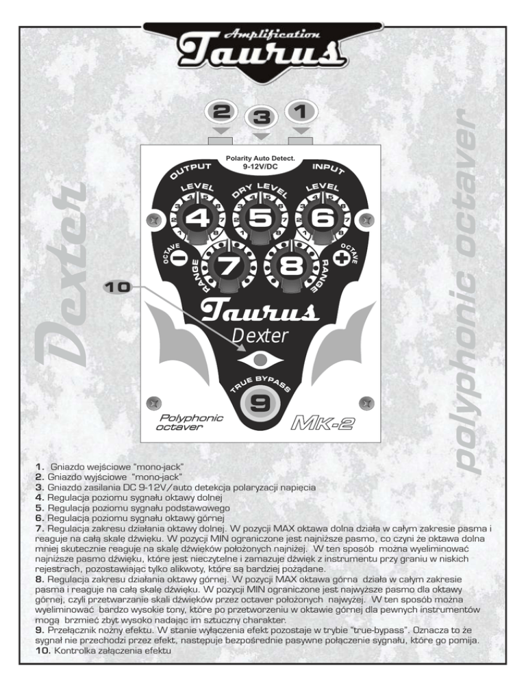4 3 5 4 6 7 2 1 3 5 4 6 1 8 3 7 2 5 6 7 2 1 8 8 Dexter Polyphonic octaver UE R BYPA S S T Dexter 9-12V/DC MK-2 polyphonic octaver Polarity Auto Detect. 1. Gniazdo wejściowe “mono-jack” 2. Gniazdo wyjściowe “mono-jack” 3. Gniazdo zasilania DC 9-12V/auto detekcja polaryzacji napięcia 4. Regulacja poziomu sygnału oktawy dolnej 5. Regulacja poziomu sygnału podstawowego 6. Regulacja poziomu sygnału oktawy górnej 7. Regulacja zakresu działania oktawy dolnej. W pozycji MAX oktawa dolna działa w całym zakresie pasma i reaguje na całą skalę dźwięku. W pozycji MIN ograniczone jest najniższe pasmo, co czyni że oktawa dolna mniej skutecznie reaguje na skalę dźwięków położonych najniżej. W ten sposób można wyeliminować najniższe pasmo dźwięku, które jest nieczytelne i zamazuje dźwięk z instrumentu przy graniu w niskich rejestrach, pozostawiając tylko alikwoty, które są bardziej pożądane. 8. Regulacja zakresu działania oktawy górnej. W pozycji MAX oktawa górna działa w całym zakresie pasma i reaguje na całą skalę dźwięku. W pozycji MIN ograniczone jest najwyższe pasmo dla oktawy górnej, czyli przetwarzanie skali dźwięków przez octaver położonych najwyżej. W ten sposób można wyeliminować bardzo wysokie tony, które po przetworzeniu w oktawie górnej dla pewnych instrumentów mogą brzmieć zbyt wysoko nadając im sztuczny charakter. 9. Przełącznik nożny efektu. W stanie wyłączenia efekt pozostaje w trybie “true-bypass”. Oznacza to że sygnałnie przechodzi przez efekt, następuje bezpośrednie pasywne połączenie sygnału, które go pomija. 10. Kontrolka załączenia efektu