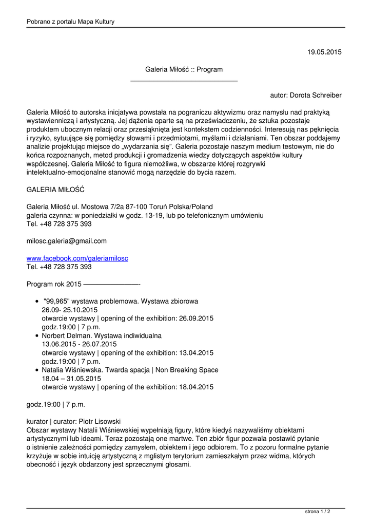 Pobrano z portalu Mapa Kultury 19.05.2015 Galeria Miłość :: Program ____________________________ autor: Dorota Schreiber Galeria Miłość to autorska inicjatywa powstała na pograniczu aktywizmu oraz namysłu nad praktyką wystawienniczą i artystyczną. Jej dążenia oparte są na przeświadczeniu, że sztuka pozostaje produktem ubocznym relacji oraz przesiąknięta jest kontekstem codzienności. Interesują nas pęknięcia i ryzyko, sytuujące się pomiędzy słowami i przedmiotami, myślami i działaniami. Ten obszar poddajemy analizie projektując miejsce do „wydarzania się”. Galeria pozostaje naszym medium testowym, nie do końca rozpoznanych, metod produkcji i gromadzenia wiedzy dotyczących aspektów kultury współczesnej. Galeria Miłość to figura niemożliwa, w obszarze której rozgrywki intelektualno-emocjonalne stanowić mogą narzędzie do bycia razem. GALERIA MIŁOŚĆ Galeria Miłość ul. Mostowa 7/2a 87-100 Toruń Polska/Poland galeria czynna: w poniedziałki w godz. 13-19, lub po telefonicznym umówieniu Tel. +48 728 375 393 [email protected] www.facebook.com/galeriamilosc Tel. +48 728 375 393 Program rok 2015 ———————— "99,965" wystawa problemowa. Wystawa zbiorowa 26.09- 25.10.2015 otwarcie wystawy | opening of the exhibition: 26.09.2015 godz.19:00 | 7 p.m. Norbert Delman. Wystawa indiwidualna 13.06.2015 - 26.07.2015 otwarcie wystawy | opening of the exhibition: 13.04.2015 godz.19:00 | 7 p.m. Natalia Wiśniewska. Twarda spacja | Non Breaking Space 18.04 – 31.05.2015 otwarcie wystawy | opening of the exhibition: 18.04.2015 godz.19:00 | 7 p.m. kurator | curator: Piotr Lisowski Obszar wystawy Natalii Wiśniewskiej wypełniają figury, które kiedyś nazywaliśmy obiektami artystycznymi lub ideami. Teraz pozostają one martwe. Ten zbiór figur pozwala postawić pytanie o istnienie zależności pomiędzy zamysłem, obiektem i jego odbiorem. To z pozoru formalne pytanie krzyżuje w sobie intuicję artystyczną z mglistym terytorium zamieszkałym przez widma, których obecność i język obdarzony jest sprzecznymi głosami. strona 1 / 2 Pobrano z portalu Mapa Kultury Fotorelacja z wernisażu Galeria Miłość to autorska inicjatywa powstała na pograniczu aktywizmu oraz namysłu nad praktyką wystawienniczą i artystyczną. Jej dążenia oparte są na przeświadczeniu, że sztuka pozostaje produktem ubocznym relacji oraz przesiąknięta jest kontekstem codzienności. Interesują nas pęknięcia i ryzyko, sytuujące się pomiędzy słowami i przedmiotami, myślami i działaniami. Ten obszar poddajemy analizie projektując miejsce do „wydarzania się”. Galeria pozostaje naszym medium testowym, nie do końca rozpoznanych, metod produkcji i gromadzenia wiedzy dotyczących aspektów kultury współczesnej. Galeria Miłość to figura niemożliwa, w obszarze której rozgrywki intelektualno-emocjonalne stanowić mogą narzędzie do bycia razem. Miłość Gallery is a private initiative founded on the borderline of activism and reflection on creating and exhibiting art. Its endeavours are based on the belief that art is a byproduct of the relationship and is imbued with the context of daily life. We are interested in gaps and a chance situated between words and objects, thoughts and actions. This area is submitted for analysis by designing a place to “the happening”. The gallery remains our test medium, not entirely recognized, of knowledge production and accumulation methods that are pertaining to the contemporary culture aspects. Miłość Gallery is an impossible figure, within which the intellectual-and-emotional games may serve as a medium of being together. ZAPRASZAMY NA ELEKTRONICZNĄ STRONĘ GALERII MIŁOŚĆ http://galeriamilosc.pl/ —– Współfinansowanie: Dofinansowano ze środków Ministra Kultury i Dziedzictwa Narodowego Partner: Kulturhauz Dom Kultury Bydgoskie Przedmieście Aklen Drukuj za grosze Generał Restauracja Ciasna strona 2 / 2
