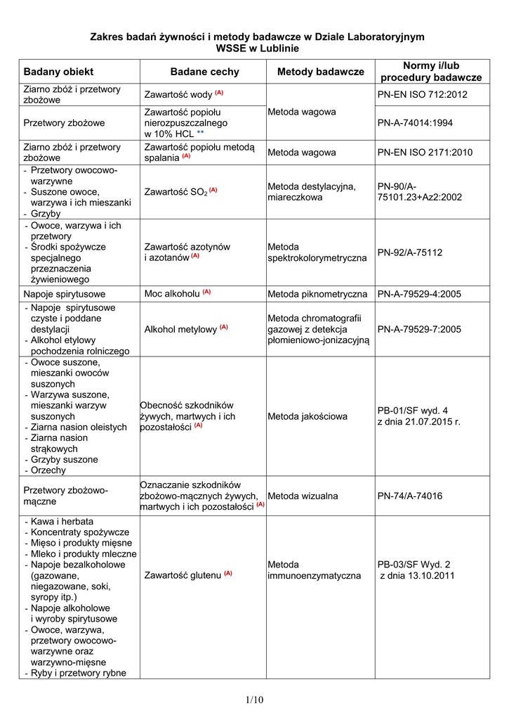Zakres badań żywności i metody badawcze w Dziale Laboratoryjnym WSSE w Lublinie Badany obiekt Ziarno zbóż i przetwory zbożowe Przetwory zbożowe Ziarno zbóż i przetwory zbożowe - Przetwory owocowowarzywne - Suszone owoce, warzywa i ich mieszanki - Grzyby - Owoce, warzywa i ich przetwory - Środki spożywcze specjalnego przeznaczenia żywieniowego Napoje spirytusowe - Napoje spirytusowe czyste i poddane destylacji - Alkohol etylowy pochodzenia rolniczego - Owoce suszone, mieszanki owoców suszonych - Warzywa suszone, mieszanki warzyw suszonych - Ziarna nasion oleistych - Ziarna nasion strąkowych - Grzyby suszone - Orzechy Przetwory zbożowomączne Badane cechy Metody badawcze Zawartość wody (A) Normy i/lub procedury badawcze PN-EN ISO 712:2012 Zawartość popiołu nierozpuszczalnego w 10% HCL ** Zawartość popiołu metodą spalania (A) Metoda wagowa Metoda wagowa PN-EN ISO 2171:2010 Zawartość SO2 (A) Metoda destylacyjna, miareczkowa PN-90/A75101.23+Az2:2002 Zawartość azotynów i azotanów (A) Metoda spektrokolorymetryczna PN-92/A-75112 Moc alkoholu (A) Metoda piknometryczna PN-A-79529-4:2005 Alkohol metylowy (A) Metoda chromatografii gazowej z detekcja PN-A-79529-7:2005 płomieniowo-jonizacyjną Obecność szkodników żywych, martwych i ich pozostałości (A) PN-A-74014:1994 Metoda jakościowa Oznaczanie szkodników zbożowo-mącznych żywych, Metoda wizualna martwych i ich pozostałości (A) Kawa i herbata Koncentraty spożywcze Mięso i produkty mięsne Mleko i produkty mleczne Napoje bezalkoholowe Zawartość glutenu (A) (gazowane, niegazowane, soki, syropy itp.) - Napoje alkoholowe i wyroby spirytusowe - Owoce, warzywa, przetwory owocowowarzywne oraz warzywno-mięsne - Ryby i przetwory rybne - Metoda immunoenzymatyczna 1/10 PB-01/SF wyd. 4 z dnia 21.07.2015 r. PN-74/A-74016 PB-03/SF Wyd. 2 z dnia 13.10.2011 - Słodycze i wyroby cukiernicze - Surowce i przetwory zielarskie, przyprawy - Środki specjalnego przeznaczenia żywieniowego - Oleje, tłuszcze zwierzęce i roślinne - Zboża i przetwory zbożowe - Żywność mrożona - Wyroby garmażeryjne Oleje i tłuszcze roślinne oraz zwierzęce Oleje i tłuszcze roślinne oraz zwierzęce Wyroby cukiernicze trwałe Sól (Chlorek sodowy) Chlorek sodu Wyroby konsumpcyjne przeznaczone dla ludzi – w tym żywność: Wędliny Wyroby garmażeryjne Napoje bezalkoholowe Pieczywo Makaron Zawartość glutenu (A) Oznaczanie zawartości związków polarnych ** Oznaczanie liczby kwasowej i kwasowości ** Oznaczanie zawartości suchej masy ** Oznaczanie zawartości tłuszczu ** Oznaczanie zawartości jodku potasowego ** Oznaczanie zawartości siarczanów ** Oznaczanie zawartości siarczanów ** Cechy organoleptyczne Metoda immunoenzymatyczna PB-03/SF Wyd. 2 z dnia 13.10.2011 Metoda wagowa PN-EN ISO 8420:2004+AC:2008 Metoda miareczkowa PN-EN ISO 660:2010 PN-A-88027:1984 Metoda wagowa PN-A-88021:1971 Metoda miareczkowajodometryczna Metoda wagowa PN-80/C-84081.34 Wytyczne PZH Wersja 1 z dn. 29.02.12 Wytyczne PZH Wersja 1 z dn. 29.02.12 (AE) - wygląd ogólny: - powierzchnia i kształt - wypełnienie osłonki - barwa - wygląd na przekroju: - barwa - struktura i konsystencja - zapach i smak - wygląd ogólny - konsystencja - barwa - zapach i smak - klarowność - barwa - zapach i smak - wygląd ogólny - kształt - skórka - miękisz - zapach i smak Cechy zewnętrzne przed i po ugotowaniu, - wygląd - barwa - zapach - konsystencja - smak (po ugotowaniu) 2/10 PN-A-82062: 1988 p. 2.2.1, 2.2.2.1-2.2.2.4, 2.2.2.6, 2.2.3, 2.2.4.12.2.4.3, 2.2.5 PN-A-82107:1996 p. 2.2.1 −2.2.3, 2.2.5 – 2.2.8 Prosty test opisowy PN-A-79033:1985 p. 3.4 – 3.5 PN-A-74108:1996 p. 2.3 – 2.6 PN-A-74130:1993 p .3.4.1-3.4.2., 3.4.3.2. Wyroby cukiernicze wygląd ogólny kształt wyrobu barwa powierzchnia (górna i dolna) - przełom - konsystencja - zapach i smak - PN-A-88032:1998 p. 4.2 – 4.8 Mleko - spożywcze - zagęszczone - wygląd barwa smak zapach konsystencja PB-13/DL wyd. 7 z dn. 21.07.2015 p. 6.6.2 Sery - twarogowe niedojrzewające - podpuszkowe dojrzewające i pleśniowe - topione - wygląd barwa smak zapach struktura konsystencja PB-13/DL wyd. 7 z dn. 21.07.2015 p. 6.6.5 Owoce suszone - wygląd barwa smak zapach konsystencja PB-13/DL wyd. 7 z dn. 21.07.2015 p. 6.6.6 Warzywa suszone - wygląd barwa smak zapach konsystencja PB-13/DL wyd. 7 z dn. 21.07.2015 p. 6.6.6 - wygląd barwa struktura konsystencja zapach i smak wygląd barwa struktura konsystencja zapach i smak wygląd ogólny barwa konsystencja zapach i smak Kasza - wygląd ogólny barwa konsystencja zapach i smak PN-64/A-74013 pkt 2.1 – 2.5 Woda mineralna - wygląd, barwa, konsystencja, zapach i smak PB-13/DL wyd. 7 z dn. 21.07.2015 p. 6.6.9 Przetwory mięsne. Konserwy Wyroby i półprodukty ciastkarskie Mąka Prosty test opisowy PB-13/DL wyd. 7 z dn. 21.07.2015 p. 6.6.18 PB-13/DL wyd. 7 z dn. 21.07.2015 p. 6.6.1 PN-64/A-74013 pkt 2.1 – 2.5 3/10 Ryby i inne zwierzęta wodne świeże i mrożone: - ryby mrożone Ryby i inne zwierzęta wodne świeże i mrożone: - ryby świeże i inne zwierzęta wodne Przetwory rybne wędzone - wygląd barwa tekstura, zapach i smak wygląd barwa tekstura zapach i smak wygląd ogólny barwa tekstura zapach i smak Przetwory ziemniaczane - określenie postaci - barwa - zapach Tłuszcze roślinne i zwierzęce oraz mieszanki tłuszczowe: - tłuszcze roślinne - wygląd barwa konsystencja zapach i smak - wygląd barwa zapach i smak wygląd barwa konsystencja zapach i smak wygląd barwa konsystencja zapach i smak wygląd konsystencja barwa klarowności roztworu zapach i smak Soki, nektary i syropy Przetwory owocowe, warzywne, grzybowe i ich mieszanki Koncentraty spożywcze Cukier PB-13/DL wyd. 7 z dn. 21.07.2015 p. 6.6.17 PB-13/DL wyd. 7 z dn. 21.07.2015 p. 6.6.17 PB-13/DL wyd. 7 z dn. 21.07.2015 p. 6.6.15 PN-A-74702-1:1998 p. 2.2 – 2.4 PB-13/DL wyd. 7 z dn. 21.07.2015 p. 6.6.10 PB-13/DL wyd. 7 z dn. 21.07.2015 p. 6.6.11 PB-13/DL wyd. 7 z dn. 21.07.2015 p. 6.6.12 Pro