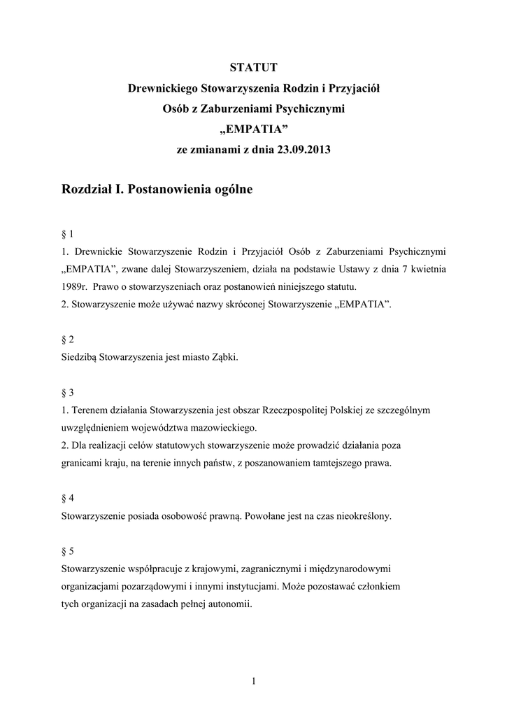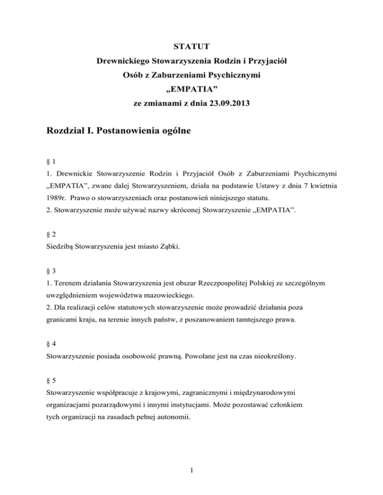 STATUT Drewnickiego Stowarzyszenia Rodzin i Przyjaciół Osób z Zaburzeniami Psychicznymi „EMPATIA” ze zmianami z dnia 23.09.2013 Rozdział I. Postanowienia ogólne §1 1. Drewnickie Stowarzyszenie Rodzin i Przyjaciół Osób z Zaburzeniami Psychicznymi „EMPATIA”, zwane dalej Stowarzyszeniem, działa na podstawie Ustawy z dnia 7 kwietnia 1989r. Prawo o stowarzyszeniach oraz postanowień niniejszego statutu. 2. Stowarzyszenie może używać nazwy skróconej Stowarzyszenie „EMPATIA”. §2 Siedzibą Stowarzyszenia jest miasto Ząbki. §3 1. Terenem działania Stowarzyszenia jest obszar Rzeczpospolitej Polskiej ze szczególnym uwzględnieniem województwa mazowieckiego. 2. Dla realizacji celów statutowych stowarzyszenie może prowadzić działania poza granicami kraju, na terenie innych państw, z poszanowaniem tamtejszego prawa. §4 Stowarzyszenie posiada osobowość prawną. Powołane jest na czas nieokreślony. §5 Stowarzyszenie współpracuje z krajowymi, zagranicznymi i międzynarodowymi organizacjami pozarządowymi i innymi instytucjami. Może pozostawać członkiem tych organizacji na zasadach pełnej autonomii. 1 §6 Stowarzyszenie opiera swoją działalność na pracy społecznej członków. Do prowadzenia swoich działań może zatrudniać pracowników, w tym własnych członków oraz powoływać biura. §7 Stowarzyszenie prowadzi swą działalność na rzecz osób chorych psychicznie, ich rodzin i opiekunów, oraz osób wymagających wsparcia psychicznego. §8 Stowarzyszenie ma prawo używania pieczęci i oznak zgodnie z obowiązującymi w tym zakresie przepisami. 2 Rozdział II. Cele i sposoby ich realizacji §9 1. Celem Stowarzyszenia jest: pomoc materialna i pozamaterialna na rzecz osób z zaburzeniami psychicznymi, ich rodzin i opiekunów ochrona i promocja zdrowia psychicznego – poprzez współpracę z psychiatryczną służbą zdrowia w kierunku rozwoju form pośrednich lecznictwa psychiatrycznego oraz działalność informacyjno-edukacyjną dla osób, rodzin i całego społeczeństwa na temat chorób i zaburzeń psychicznych, ich leczenia i zapobiegania promocja zatrudnienia i aktywizacji zawodowej osób z zaburzeniami psychicznymi upowszechniania kultury fizycznej i sportu, zgodnie z powiedzeniem „W zdrowym ciele – zdrowy duch” przeciwdziałanie stygmatyzacji, nierówności i dyskryminacji, jakiej doświadczają osoby chorujące psychicznie i ich rodziny popieranie rozwoju różnorodnych form działalności ochrony zdrowia w zakresie lecznictwa chorób psychicznych; promocja i organizacja wolontariatu; promocja twórczości osób z zaburzeniami psychicznymi 2. Stowarzyszenie realizuje swoje cele w ramach nieodpłatnej działalności pożytku publicznego, zgodnie z obowiązującymi przepisami, w szczególności poprzez: tworzenie i prowadzenie grup samopomocowych dla rodzin i opiekunów osób z zaburzeniami psychicznymi organizowanie spotkań integracyjnych, wycieczek, imprez kulturalnych, udzielanie pomocy osobom dotkniętym zaburzeniami psychicznymi w ich rehabilitacji i integracji z otoczeniem ochronę i promocję zdrowia psychicznego poprzez organizowanie i wspieranie działań szkoleniowych, kursów, seminariów, warsztatów oraz innych form upowszechniania wiedzy. promocję zatrudnienia i tworzenie miejsc pracy chronionej dla osób dotkniętych chorobą psychiczną w ramach działalności statutowej Stowarzyszenia; tworzenia mieszkań chronionych dla osób chorych psychicznie pozbawionych opieki rodzicielskiej i możliwości posiadania własnego mieszkania; 3 świadczenia różnorodnych form pomocy społecznej– w tym w miarę możliwości wsparcia finansowego i materialnego osobom chorym oraz członkom stowarzyszenia, które znalazły się w szczególnie trudnej sytuacji życiowej; promowanie aktywnych form spędzania wolnego czasu i zdrowego stylu życia tworzenie i prowadzenie placówek rehabilitacyjnych 3. Stowarzyszenie realizuje swoje cele w ramach odpłatnej działalności pożytku publicznego, zgodnie z obowiązującymi przepisami, poprzez: tworzenie i prowadzenie grup samopomocowych dla rodzin i opiekunów osób z zaburzeniami psychicznymi organizowanie spotkań integracyjnych, wycieczek, imprez kulturalnych, udzielanie pomocy osobom dotkniętym zaburzeniami psychicznymi w ich rehabilitacji i integracji z otoczeniem organizowanie i wspieranie działań szkoleniowych, kursów, seminariów, warsztatów oraz innych form upowszechniania wiedzy nt. zdrowia psychicznego; promocję zatrudnienia i tworzenie miejsc pracy chronionej dla osób dotkniętych chorobą psychiczną w ramach działalności statutowej Stowarzyszenia; tworzenia mieszkań chronionych dla osób chorych psychicznie pozbawionych opieki rodzicielskiej i możliwości posiadania własnego mieszkania; świadczenia różnorodnych form pomocy społecznej– w tym w miarę możliwości wsparcia finansowego i materialnego osobom chorym oraz członkom stowarzyszenia, które znalazły się w szczególnie trudnej sytuacji życiowej; promowanie aktywnych form spędzania wolnego czasu i zdrowego stylu życia tworzenie placówek rehabilitacyjnych 4. Przy realizacji swoich celów, w zakresie swojej działalności, stowarzyszenie współpracuje z organami władzy i administracji państwowej i samorządowej, środkami masowego przekazu i innymi podmiotami 4 Rozdział III. Członkowie Stowarzyszenia § 12 1. Członkami Stowarzyszenia mogą być pełnoletnie osoby fizyczne, zainteresowane statutową działalnością Stowarzyszenia, nie pozbawione praw publicznych, mające pełną zdolność do czynności prawnych. 2. Stowarzyszenie posiada członków: a. zwyczajnych, b. wspierających, c. honorowych. § 13 1. Członkiem zwyczajnym może być każdy obywatel Rzeczypospolitej Polskiej zainteresowany statutową działalnością Stowarzyszenia, który złożył pisemną deklarację członkowską i został przyjęty w poczet członków uchwałą Zarządu Stowarzyszenia. 3. Członkiem wspierającym S