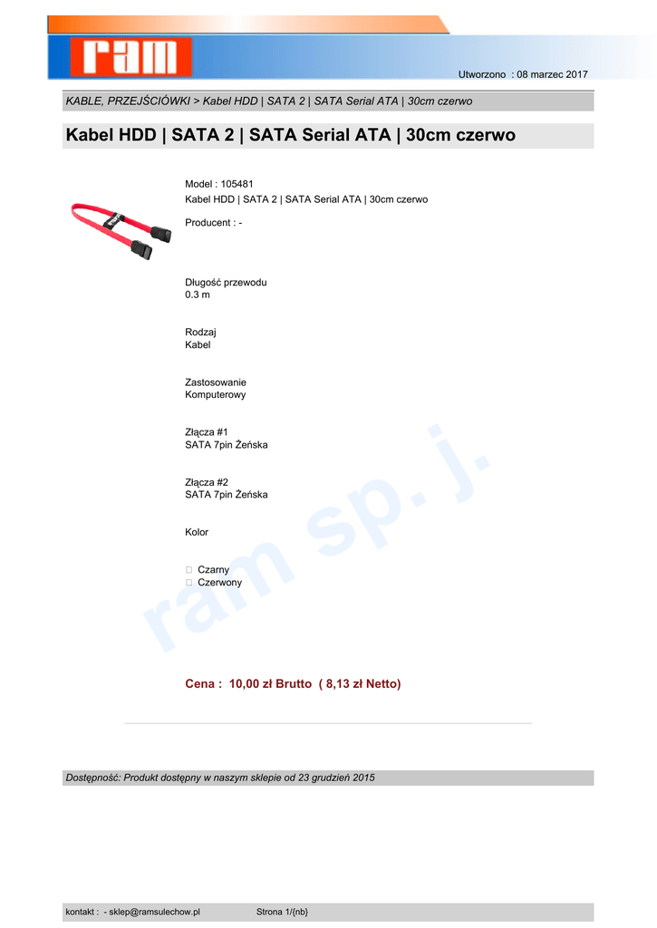 Utworzono : 08 marzec 2017 KABLE, PRZEJŚCIÓWKI > Kabel HDD | SATA 2 | SATA Serial ATA | 30cm czerwo Kabel HDD | SATA 2 | SATA Serial ATA | 30cm czerwo Model : 105481 Kabel HDD | SATA 2 | SATA Serial ATA | 30cm czerwo Producent : - Długość przewodu 0.3 m Rodzaj Kabel Zastosowanie Komputerowy . j . Złącza #1 SATA 7pin Żeńska Złącza #2 SATA 7pin Żeńska Kolor m a r � Czarny � Czerwony p s Cena : 10,00 zł Brutto ( 8,13 zł Netto) Dostępność: Produkt dostępny w naszym sklepie od 23 grudzień 2015 kontakt : - [email protected] Strona 1/{nb}
