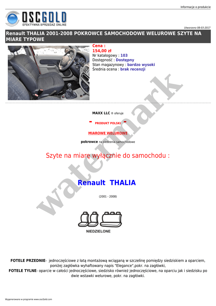Informacje o produkcie Utworzono 08-03-2017 Renault THALIA 2001-2008 POKROWCE SAMOCHODOWE WELUROWE SZYTE NA MIARE TYPOWE Cena : 154,00 zł er m ar k Nr katalogowy : 103 Dostępność : Dostępny Stan magazynowy : bardzo wysoki Średnia ocena : brak recenzji MAXX LLC ® oferuje - PRODUKT POLSKI - MIAROWE WELUROWE pokrowce na siedzenia samochodowe at Szyte na miarę wyłącznie do samochodu : Renault THALIA w (2001 - 2008) FOTELE PRZEDNIE- jednoczęściowe z łatą montażową wciąganą w szczelinę pomiędzy siedziskiem a oparciem, poniżej zagłówka wyhaftowany napis "Elegance",pokr. na zagłówki, FOTELE TYLNE- oparcie w całości jednoczęściowe, siedzisko również jednoczęściowe, na oparciu jak i siedzisku po dwie wstawki welurowe, pokr. na zagłówki. Wygenerowano w programie www.oscGold.com KOMPLET ZAWIERA - komplet pokrowców na przednie fotele - komplet pokrowców na tylną kanape - pokrowce na zagłówki - haczyki oraz inne elementy montażowe er m ar k - instrukcję montażu w at Pokrowce oferowane przez nas posiadają atest bezpieczeństwa na poduszki powietrzne AIRBAG Przemysłowego Instytutu Motoryzacji (PIMOT) w Warszawie. Posiadają one specjalne szycie po stronie poduszki powietrznej, oznaczone wszywką z napisem "airbag", dzięki czemu poduszki bez najmniejszego problemu będą mogły wystrzelić gdy zajdzie taka potrzeba. Dzięki czemu przystosowane są do samochodów zarówno z bocznymi poduszkami powietrznymi w fotelach, jak i do standardowych siedzeń. er m ar k Informacje o produkcie Pokrowce wykonane są z wysokiej jakości weluru dodatkowo laminowanego pianką poliuretanową oraz podszewką co zapobiega wykruszaniu się gąbki i ułatwia zakładanie Boczki foteli, zagłówki oraz plecy wykonane są z grubej dzianiny poliestrowej koloru ciemno grafitowego, w całości laminowanej pianką, w at w miejscach szczególnie podatnych na przetarcia dodatkowo wzmocnione podszewką. Wygenerowano w programie www.oscGold.com er m ar k at w Informacje o produkcie er m ar k Pokrowce są bardzo solidnie wykończone, otwory do regulacji foteli, lub pod zagłówki i pasy bezpieczeństwa są wycięte, obszyte i dopasowane pod każdy model indywidualnie. at Po dokładnym montażu naszych pokrowców uzyskujemy efekt praktycznie nie odróżniający się od orginalnej tapicerki co zresztą widać na powyższych zdjęciach. w W trzech wzorach: Wygenerowano w programie www.oscGold.com er m ar k at w w at er m ar k Informacje o produkcie Wygenerowano w programie www.oscGold.com er m ar k at w