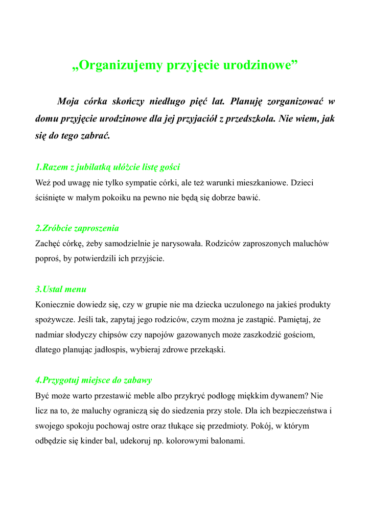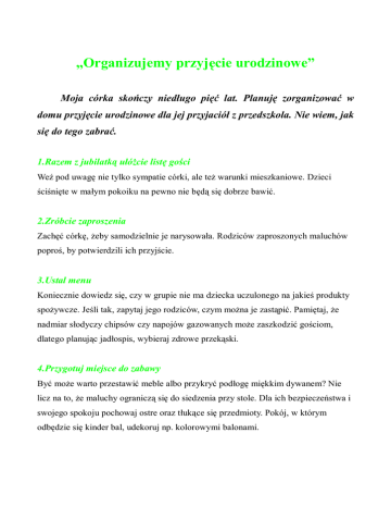 „Organizujemy przyjęcie urodzinowe” Moja córka skończy niedługo pięć lat. Planuję zorganizować w domu przyjęcie urodzinowe dla jej przyjaciół z przedszkola. Nie wiem, jak się do tego zabrać. 1.Razem z jubilatką ułóŜcie listę gości Weź pod uwagę nie tylko sympatie córki, ale teŜ warunki mieszkaniowe. Dzieci ściśnięte w małym pokoiku na pewno nie będą się dobrze bawić. 2.Zróbcie zaproszenia Zachęć córkę, Ŝeby samodzielnie je narysowała. Rodziców zaproszonych maluchów poproś, by potwierdzili ich przyjście. 3.Ustal menu Koniecznie dowiedz się, czy w grupie nie ma dziecka uczulonego na jakieś produkty spoŜywcze. Jeśli tak, zapytaj jego rodziców, czym moŜna je zastąpić. Pamiętaj, Ŝe nadmiar słodyczy chipsów czy napojów gazowanych moŜe zaszkodzić gościom, dlatego planując jadłospis, wybieraj zdrowe przekąski. 4.Przygotuj miejsce do zabawy Być moŜe warto przestawić meble albo przykryć podłogę miękkim dywanem? Nie licz na to, Ŝe maluchy ograniczą się do siedzenia przy stole. Dla ich bezpieczeństwa i swojego spokoju pochowaj ostre oraz tłukące się przedmioty. Pokój, w którym odbędzie się kinder bal, udekoruj np. kolorowymi balonami.