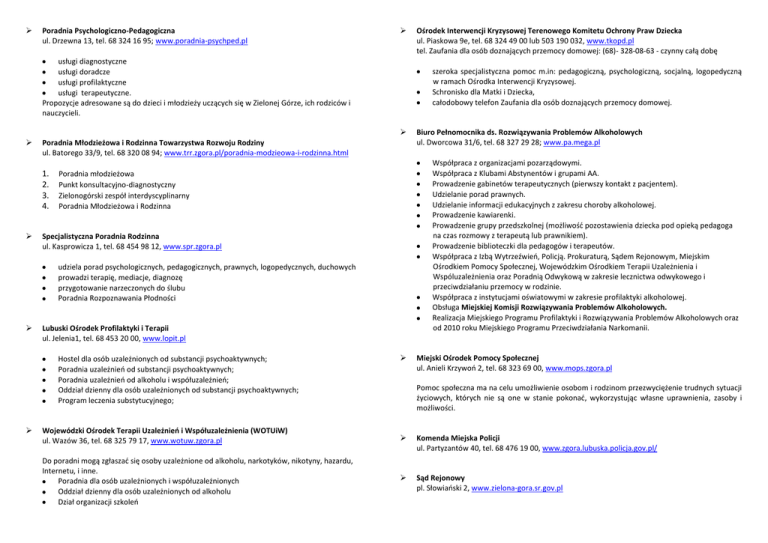 Poradnia Psychologiczno-Pedagogiczna ul. Drzewna 13, tel. 68 324 16 95; www.poradnia-psychped.pl usługi diagnostyczne usługi doradcze usługi profilaktyczne usługi terapeutyczne. Propozycje adresowane są do dzieci i młodzieży uczących się w Zielonej Górze, ich rodziców i nauczycieli. szeroka specjalistyczna pomoc m.in: pedagogiczną, psychologiczną, socjalną, logopedyczną w ramach Ośrodka Interwencji Kryzysowej. Schronisko dla Matki i Dziecka, całodobowy telefon Zaufania dla osób doznających przemocy domowej. Poradnia Młodzieżowa i Rodzinna Towarzystwa Rozwoju Rodziny ul. Batorego 33/9, tel. 68 320 08 94; www.trr.zgora.pl/poradnia-modzieowa-i-rodzinna.html 1. 2. 3. 4. Specjalistyczna Poradnia Rodzinna ul. Kasprowicza 1, tel. 68 454 98 12, www.spr.zgora.pl Lubuski Ośrodek Profilaktyki i Terapii ul. Jelenia1, tel. 68 453 20 00, www.lopit.pl Hostel dla osób uzależnionych od substancji psychoaktywnych; Poradnia uzależnień od substancji psychoaktywnych; Poradnia uzależnień od alkoholu i współuzależnień; Oddział dzienny dla osób uzależnionych od substancji psychoaktywnych; Program leczenia substytucyjnego; Biuro Pełnomocnika ds. Rozwiązywania Problemów Alkoholowych ul. Dworcowa 31/6, tel. 68 327 29 28; www.pa.mega.pl Współpraca z organizacjami pozarządowymi. Współpraca z Klubami Abstynentów i grupami AA. Prowadzenie gabinetów terapeutycznych (pierwszy kontakt z pacjentem). Udzielanie porad prawnych. Udzielanie informacji edukacyjnych z zakresu choroby alkoholowej. Prowadzenie kawiarenki. Prowadzenie grupy przedszkolnej (możliwość pozostawienia dziecka pod opieką pedagoga na czas rozmowy z terapeutą lub prawnikiem). Prowadzenie biblioteczki dla pedagogów i terapeutów. Współpraca z Izbą Wytrzeźwień, Policją. Prokuraturą, Sądem Rejonowym, Miejskim Ośrodkiem Pomocy Społecznej, Wojewódzkim Ośrodkiem Terapii Uzależnienia i Wspóluzależnienia oraz Poradnią Odwykową w zakresie lecznictwa odwykowego i przeciwdziałaniu przemocy w rodzinie. Współpraca z instytucjami oświatowymi w zakresie profilaktyki alkoholowej. Obsługa Miejskiej Komisji Rozwiązywania Problemów Alkoholowych. Realizacja Miejskiego Programu Profilaktyki i Rozwiązywania Problemów Alkoholowych oraz od 2010 roku Miejskiego Programu Przeciwdziałania Narkomanii. Poradnia młodzieżowa Punkt konsultacyjno-diagnostyczny Zielonogórski zespół interdyscyplinarny Poradnia Młodzieżowa i Rodzinna udziela porad psychologicznych, pedagogicznych, prawnych, logopedycznych, duchowych prowadzi terapię, mediacje, diagnozę przygotowanie narzeczonych do ślubu Poradnia Rozpoznawania Płodności Ośrodek Interwencji Kryzysowej Terenowego Komitetu Ochrony Praw Dziecka ul. Piaskowa 9e, tel. 68 324 49 00 lub 503 190 032, www.tkopd.pl tel. Zaufania dla osób doznających przemocy domowej: (68)- 328-08-63 - czynny całą dobę Miejski Ośrodek Pomocy Społecznej ul. Anieli Krzywoń 2, tel. 68 323 69 00, www.mops.zgora.pl Pomoc społeczna ma na celu umożliwienie osobom i rodzinom przezwyciężenie trudnych sytuacji życiowych, których nie są one w stanie pokonać, wykorzystując własne uprawnienia, zasoby i możliwości. Wojewódzki Ośrodek Terapii Uzależnień i Współuzależnienia (WOTUiW) ul. Wazów 36, tel. 68 325 79 17, www.wotuw.zgora.pl Komenda Miejska Policji ul. Partyzantów 40, tel. 68 476 19 00, www.zgora.lubuska.policja.gov.pl/ Do poradni mogą zgłaszać się osoby uzależnione od alkoholu, narkotyków, nikotyny, hazardu, Internetu, i inne. Poradnia dla osób uzależnionych i współuzależnionych Oddział dzienny dla osób uzależnionych od alkoholu Dział organizacji szkoleń Sąd Rejonowy pl. Słowiański 2, www.zielona-gora.sr.gov.pl