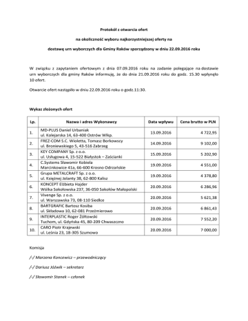 Protokół z otwarcia ofert na okoliczność wyboru najkorzystniejszej oferty na dostawę urn wyborczych dla Gminy Raków sporządzony w dniu 22.09.2016 roku W związku z zapytaniem ofertowym z dnia 07.09.2016 roku na zadanie polegające na dostawie urn wyborczych dla gminy Raków informuję, że do dnia 21.09.2016 roku do godz. 15.30 wpłynęło 10 ofert. Otwarcie ofert nastąpiło w dniu 22.09.2016 roku o godz.11:30. Wykaz złożonych ofert Lp. 1. 2. 3. 4. 5. 6. 7. 8. 9. 10. Nazwa i adres Wykonawcy MD-PLUS Daniel Urbaniak ul. Kolejarska 14, 63-400 Ostrów Wlkp. FREZ-COM S.C. Wioletta, Tomasz Borkowscy ul. Broniewskiego 5, 43-516 Zabrzeg KEY COMPANY Sp. z o.o. ul. Usługowa 4, 15-522 Białystok – Zaścianki C.Systems Sławomir Kobiela Marcinkowice 41a, 66-600 Krosno Odrzańskie Grupa METALCRAFT Sp. z o.o. ul. Księżnej Jolanty 38, 62-800 Kalisz KONCEPT Elżbieta Hajder Wólka Sokołowska 237, 36-050 Sokołów Małopolski Vivenge Sp. z o.o. ul. Warszawska 73, 08-110 Siedlce BARTGRAFIC Bartosz Kosiba ul. Składowa 10, 62-081 Przeźmierowo INTERPLASTIC Roger Żółtowski Tuchom, ul. Gdyńska 45, 80-209 Chwaszczno CARO Piotr Krajewski ul. Leśnia 23, 18-305 Szumowo Komisja /-/ Marzena Koncewicz – przewodniczący /-/ Dariusz Jóźwik – sekretarz /-/ Sławomir Stanek – członek Data wpływu Cena brutto w PLN 13.09.2016 4 722,95 14.09.2016 9 102,00 15.09.2016 5 202,90 19.09.2016 4 551,00 19.09.2016 4 378,80 20.09.2016 6 286,96 20.09.2016 5 621,38 20.09.2016 6 861,43 20.09.2016 7 552,20 20.09.2016 7 000,00