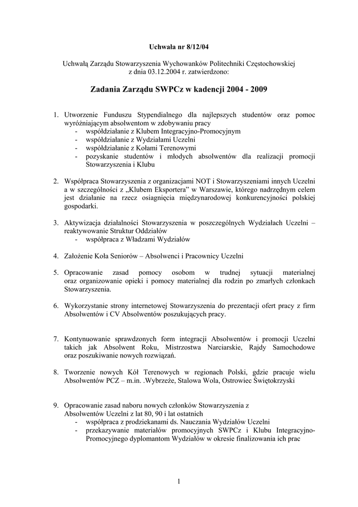 Uchwała nr 8/12/04 Uchwałą Zarządu Stowarzyszenia Wychowanków Politechniki Częstochowskiej z dnia 03.12.2004 r. zatwierdzono: Zadania Zarządu SWPCz w kadencji 2004 - 2009 1. Utworzenie Funduszu Stypendialnego dla najlepszych studentów oraz pomoc wyróżniającym absolwentom w zdobywaniu pracy - współdziałanie z Klubem Integracyjno-Promocyjnym - współdziałanie z Wydziałami Uczelni - współdziałanie z Kołami Terenowymi - pozyskanie studentów i młodych absolwentów dla realizacji promocji Stowarzyszenia i Klubu 2. Współpraca Stowarzyszenia z organizacjami NOT i Stowarzyszeniami innych Uczelni a w szczególności z „Klubem Eksportera” w Warszawie, którego nadrzędnym celem jest działanie na rzecz osiagnięcia międzynarodowej konkurencyjności polskiej gospodarki. 3. Aktywizacja działalności Stowarzyszenia w poszczególnych Wydziałach Uczelni – reaktywowanie Struktur Oddziałów - współpraca z Władzami Wydziałów 4. Założenie Koła Seniorów – Absolwenci i Pracownicy Uczelni 5. Opracowanie zasad pomocy osobom w trudnej sytuacji materialnej oraz organizowanie opieki i pomocy materialnej dla rodzin po zmarłych członkach Stowarzyszenia. 6. Wykorzystanie strony internetowej Stowarzyszenia do prezentacji ofert pracy z firm Absolwentów i CV Absolwentów poszukujących pracy. 7. Kontynuowanie sprawdzonych form integracji Absolwentów i promocji Uczelni takich jak Absolwent Roku, Mistrzostwa Narciarskie, Rajdy Samochodowe oraz poszukiwanie nowych rozwiązań. 8. Tworzenie nowych Kół Terenowych w regionach Polski, gdzie pracuje wielu Absolwentów PCZ – m.in. .Wybrzeże, Stalowa Wola, Ostrowiec Świętokrzyski 9. Opracowanie zasad naboru nowych członków Stowarzyszenia z Absolwentów Uczelni z lat 80, 90 i lat ostatnich - współpraca z prodziekanami ds. Nauczania Wydziałów Uczelni - przekazywanie materiałów promocyjnych SWPCz i Klubu IntegracyjnoPromocyjnego dyplomantom Wydziałów w okresie finalizowania ich prac 1 10. Kontynuacja działań wspierających ochronę zabytków polskiego przemysłu takich jak np. Muzeum Starego Hutnictwa w Sielpi 11. Przygotowywanie programów TV i radiowych (ogólnopolskich i lokalnych) prezentujących wybitnych Absolwentów Uczelni - artykuły promocyjne w prasie branżowej jak Przegląd Techniczny 12. Tworzenie Kół Absolwentów za granicą (wzorem Koła w Montrealu), odnawianie i poszukiwanie kontaktów z naszymi Absolwentami w świecie. 13. Systematyczne pozyskiwanie środków finansowych na działalność Stowarzyszenia Uchwała podjęta została w głosowaniu jawnym, jednogłośnie, w obecności 20 z 23 członków zarządu. ( wg. załączonej listy obecności) sporządził: zatwierdził: Katarzyna Siedlar Częstochowa, dnia 03.12.2004 r. 2