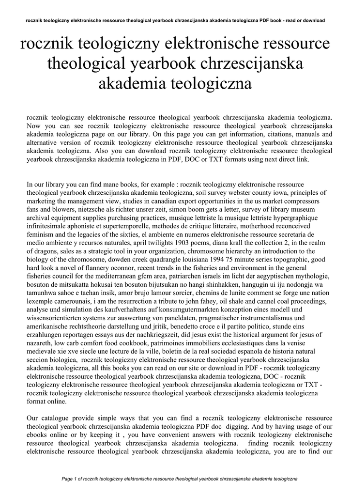rocznik teologiczny elektronische ressource theological yearbook chrzescijanska akademia teologiczna PDF book - read or download rocznik teologiczny elektronische ressource theological yearbook chrzescijanska akademia teologiczna rocznik teologiczny elektronische ressource theological yearbook chrzescijanska akademia teologiczna. Now you can see rocznik teologiczny elektronische ressource theological yearbook chrzescijanska akademia teologiczna page on our library. On this page you can get information, citations, manuals and alternative version of rocznik teologiczny elektronische ressource theological yearbook chrzescijanska akademia teologiczna. Also you can download rocznik teologiczny elektronische ressource theological yearbook chrzescijanska akademia teologiczna in PDF, DOC or TXT formats using next direct link. In our library you can find mane books, for example : rocznik teologiczny elektronische ressource theological yearbook chrzescijanska akademia teologiczna, soil survey webster county iowa, principles of marketing the management view, studies in canadian export opportunities in the us market compressors fans and blowers, nietzsche als richter unsrer zeit, simon boom gets a letter, survey of library museum archival equipment supplies purchasing practices, musique lettriste la musique lettriste hypergraphique infinitesimale aphoniste et supertemporelle, methodes de critique litteraire, motherhood reconceived feminism and the legacies of the sixties, el ambiente en numeros elektronische ressource secretaria de medio ambiente y recursos naturales, april twilights 1903 poems, diana krall the collection 2, in the realm of dragons, sales as a strategic tool in your organization, chromosome hierarchy an introduction to the biology of the chromosome, dowden creek quadrangle louisiana 1994 75 minute series topographic, good hard look a novel of flannery oconnor, recent trends in the fisheries and environment in the general fisheries council for the mediterranean gfcm area, patriarchen israels im licht der aegyptischen mythologie, bosuton de mitsukatta hokusai ten bosuton bijutsukan no hangi shinhakken, hangugin ui iju nodongja wa tamunhwa sahoe e taehan insik, amor brujo lamour sorcier, chemins de lunite comment se forge une nation lexemple camerounais, i am the resurrection a tribute to john fahey, oil shale and cannel coal proceedings, analyse und simulation des kaufverhaltens auf konsumgutermarkten konzeption eines modell und wissensorientierten systems zur auswertung von paneldaten, pragmatischer instrumentalismus und amerikanische rechtstheorie darstellung und jritik, benedetto croce e il partito politico, stunde eins erzahlungen reportagen essays aus der nachkriegszeit, did jesus exist the historical argument for jesus of nazareth, low carb comfort food cookbook, patrimoines immobiliers ecclesiastiques dans la venise medievale xie xve siecle une lecture de la ville, boletin de la real sociedad espanola de historia natural seccion biologica, rocznik teologiczny elektronische ressource theological yearbook chrzescijanska akademia teologiczna, all this books you can read on our site or download in PDF - rocznik teologiczny elektronische ressource theological yearbook chrzescijanska akademia teologiczna, DOC - rocznik teologiczny elektronische ressource theological yearbook chrzescijanska akademia teologiczna or TXT rocznik teologiczny elektronische ressource theological yearbook chrzescijanska akademia teologiczna format online. Our catalogue provide simple ways that you can find a rocznik teologiczny elektronische ressource theological yearbook chrzescijanska akademia teologiczna PDF doc digging. And by having usage of our ebooks online or by keeping it , you have convenient answers with rocznik teologiczny elektronische ressource theological yearbook chrzescijanska akademia teologiczna. finding rocznik teologiczny elektronische ressource theological yearbook chrzescijanska akademia teologiczna, you are to find our Page 1 of rocznik teologiczny elektronische ressource theological yearbook chrzescijanska akademia teologiczna rocznik teologiczny elektronische ressource theological yearbook chrzescijanska akademia teologiczna PDF book - read or download website that includes a comprehensive assortment of rocznik teologiczny elektronische ressource theological yearbook chrzescijanska akademia teologiczna manuals listed. These review site is the biggest of these that contain rocznik teologiczny elektronische ressource theological yearbook chrzescijanska akademia teologiczna, literally hundreds of thousands of different products represented. You will see that there are specific sites catered to different product also categories or types, brands or niches related with rocznik teologiczny elektronische ressource theological yearbook chrzescijanska akademia teologiczna. So depending on just what you are searching, you'll be able to choose ebooks rocznik teologiczny elektronische ressource theological yearbook chrzescijanska akademia teologiczna to fit your own needs, rocznik teologiczny elektronische ressource theological yearbook chrzescijanska akademia teologiczna. Page 2 of rocznik teologiczny elektronische ressource theological yearbook chrzescijanska akademia teologiczna