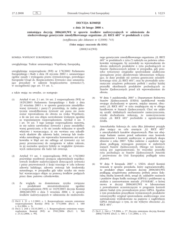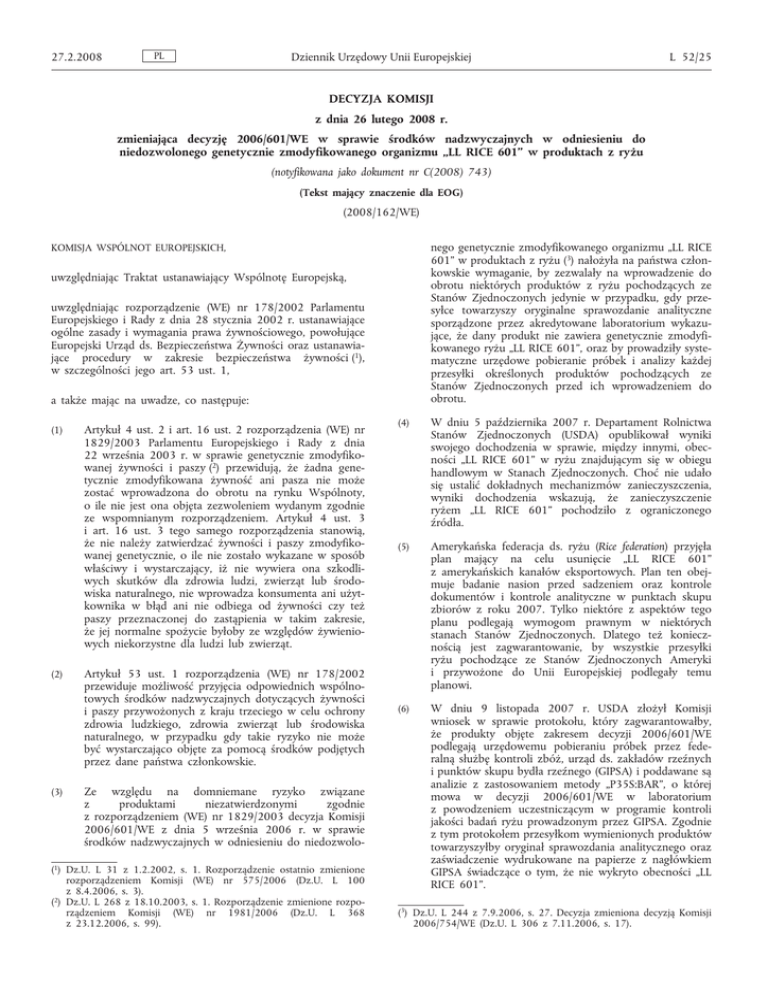 27.2.2008 PL Dziennik Urzędowy Unii Europejskiej L 52/25 DECYZJA KOMISJI z dnia 26 lutego 2008 r. zmieniająca decyzję 2006/601/WE w sprawie środków nadzwyczajnych w odniesieniu do niedozwolonego genetycznie zmodyfikowanego organizmu „LL RICE 601” w produktach z ryżu (notyfikowana jako dokument nr C(2008) 743) (Tekst mający znaczenie dla EOG) (2008/162/WE) nego genetycznie zmodyfikowanego organizmu „LL RICE 601” w produktach z ryżu (3) nałożyła na państwa członkowskie wymaganie, by zezwalały na wprowadzenie do obrotu niektórych produktów z ryżu pochodzących ze Stanów Zjednoczonych jedynie w przypadku, gdy przesyłce towarzyszy oryginalne sprawozdanie analityczne sporządzone przez akredytowane laboratorium wykazujące, że dany produkt nie zawiera genetycznie zmodyfikowanego ryżu „LL RICE 601”, oraz by prowadziły systematyczne urzędowe pobieranie próbek i analizy każdej przesyłki określonych produktów pochodzących ze Stanów Zjednoczonych przed ich wprowadzeniem do obrotu. KOMISJA WSPÓLNOT EUROPEJSKICH, uwzględniając Traktat ustanawiający Wspólnotę Europejską, uwzględniając rozporządzenie (WE) nr 178/2002 Parlamentu Europejskiego i Rady z dnia 28 stycznia 2002 r. ustanawiające ogólne zasady i wymagania prawa żywnościowego, powołujące Europejski Urząd ds. Bezpieczeństwa Żywności oraz ustanawiające procedury w zakresie bezpieczeństwa żywności (1), w szczególności jego art. 53 ust. 1, a także mając na uwadze, co następuje: (1) (2) (3) Artykuł 4 ust. 2 i art. 16 ust. 2 rozporządzenia (WE) nr 1829/2003 Parlamentu Europejskiego i Rady z dnia 22 września 2003 r. w sprawie genetycznie zmodyfikowanej żywności i paszy (2) przewidują, że żadna genetycznie zmodyfikowana żywność ani pasza nie może zostać wprowadzona do obrotu na rynku Wspólnoty, o ile nie jest ona objęta zezwoleniem wydanym zgodnie ze wspomnianym rozporządzeniem. Artykuł 4 ust. 3 i art. 16 ust. 3 tego samego rozporządzenia stanowią, że nie należy zatwierdzać żywności i paszy zmodyfikowanej genetycznie, o ile nie zostało wykazane w sposób właściwy i wystarczający, iż nie wywiera ona szkodliwych skutków dla zdrowia ludzi, zwierząt lub środowiska naturalnego, nie wprowadza konsumenta ani użytkownika w błąd ani nie odbiega od żywności czy też paszy przeznaczonej do zastąpienia w takim zakresie, że jej normalne spożycie byłoby ze względów żywieniowych niekorzystne dla ludzi lub zwierząt. Artykuł 53 ust. 1 rozporządzenia (WE) nr 178/2002 przewiduje możliwość przyjęcia odpowiednich wspólnotowych środków nadzwyczajnych dotyczących żywności i paszy przywożonych z kraju trzeciego w celu ochrony zdrowia ludzkiego, zdrowia zwierząt lub środowiska naturalnego, w przypadku gdy takie ryzyko nie może być wystarczająco objęte za pomocą środków podjętych przez dane państwa członkowskie. Ze względu na domniemane ryzyko związane z produktami niezatwierdzonymi zgodnie z rozporządzeniem (WE) nr 1829/2003 decyzja Komisji 2006/601/WE z dnia 5 września 2006 r. w sprawie środków nadzwyczajnych w odniesieniu do niedozwolo- (1) Dz.U. L 31 z 1.2.2002, s. 1. Rozporządzenie ostatnio zmienione rozporządzeniem Komisji (WE) nr 575/2006 (Dz.U. L 100 z 8.4.2006, s. 3). (2) Dz.U. L 268 z 18.10.2003, s. 1. Rozporządzenie zmienione rozporządzeniem Komisji (WE) nr 1981/2006 (Dz.U. L 368 z 23.12.2006, s. 99). (4) W dniu 5 października 2007 r. Departament Rolnictwa Stanów Zjednoczonych (USDA) opublikował wyniki swojego dochodzenia w sprawie, między innymi, obecności „LL RICE 601” w ryżu znajdującym się w obiegu handlowym w Stanach Zjednoczonych. Choć nie udało się ustalić dokładnych mechanizmów zanieczyszczenia, wyniki dochodzenia wskazują, że zanieczyszczenie ryżem „LL RICE 601” pochodziło z ograniczonego źródła. (5) Amerykańska federacja ds. ryżu (Rice federation) przyjęła plan mający na celu usunięcie „LL RICE 601” z amerykańskich kanałów eksportowych. Plan ten obejmuje badanie nasion przed sadzeniem oraz kontrole dokumentów i kontrole analityczne w punktach skupu zbiorów z roku 2007. Tylko niektóre z aspektów tego planu podlegają wymogom prawnym w niektórych stanach Stanów Zjednoczonych. Dlatego też koniecznością jest zagwarantowanie, by wszystkie przesyłki ryżu pochodzące ze Stanów Zjednoczonych Ameryki i przywożone do Unii Europejskiej podlegały temu planowi. (6) W dniu 9 listopada 2007 r. USDA złożył Komisji wniosek w sprawie protokołu, który zagwarantowałby, że produkty objęte zakresem decyzji 2006/601/WE podlegają urzędowemu pobieraniu próbek przez federalną służbę kontroli zbóż, urząd ds. zakładów rzeźnych i punktów skupu bydła rzeźnego (GIPSA) i poddawane są analizie z zastosowaniem metody „P35S:BAR”, o której mowa w decyzji 2006/601/WE w laboratorium z powodzeniem uczestniczącym w programie kontroli jakości badań ryżu prowadzonym przez GIPSA. Zgodnie z tym protokołem przesyłkom wymienionych produktów towarzyszyłby oryginał sprawozdania analitycznego oraz zaświadczenie wydrukowane na papierze z nagłówkiem GIPSA świadczące o tym, że nie wykryto obecności „LL RICE 601”. (3) Dz.U. L 244 z 7.9.2006, s. 27. Decyzja zmieniona decyzją Komisji 2006/754/WE (Dz.U. L 306 z 7.11.2006, s. 17). L 52/26 PL Dziennik Urzędowy Unii Europejskiej Zgodnie z wnioskiem dotyczącym protokołu oficjalne zaangażowanie GIPSA stanowi odpowiednią gwarancję co do jakości wykonywanych kontroli. W związku z tym obowiązkowe pobieranie próbek i przeprowadzanie analiz przez państwa członkowskie w punkcie wprowadzenia na obszar Wspólnoty nie jest już uznawane za konieczne. (7) Przeglądu środków przewidzianych niniejszą decyzją należy dokonać w ciągu sześciu miesięcy w celu oceny dalszej ich przydatności w świetle ich wpływu oraz doświadczenia praktycznego uzyskanego w zakresie obowiązujących wymogów badawczych. (8) (