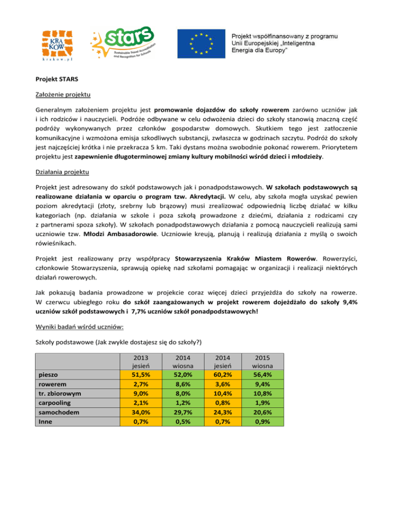 Projekt STARS Założenie projektu Generalnym założeniem projektu jest promowanie dojazdów do szkoły rowerem zarówno uczniów jak i ich rodziców i nauczycieli. Podróże odbywane w celu odwożenia dzieci do szkoły stanowią znaczną część podróży wykonywanych przez członków gospodarstw domowych. Skutkiem tego jest zatłoczenie komunikacyjne i wzmożona emisja szkodliwych substancji, zwłaszcza w godzinach szczytu. Podróż do szkoły jest najczęściej krótka i nie przekracza 5 km. Taki dystans można swobodnie pokonać rowerem. Priorytetem projektu jest zapewnienie długoterminowej zmiany kultury mobilności wśród dzieci i młodzieży. Działania projektu Projekt jest adresowany do szkół podstawowych jak i ponadpodstawowych. W szkołach podstawowych są realizowane działania w oparciu o program tzw. Akredytacji. W celu, aby szkoła mogła uzyskać pewien poziom akredytacji (złoty, srebrny lub brązowy) musi zrealizować odpowiednią liczbę działać w kilku kategoriach (np. działania w szkole i poza szkołą prowadzone z dziećmi, działania z rodzicami czy z partnerami spoza szkoły). W szkołach ponadpodstawowych działania z pomocą nauczycieli realizują sami uczniowie tzw. Młodzi Ambasadorowie. Uczniowie kreują, planują i realizują działania z myślą o swoich rówieśnikach. Projekt jest realizowany przy współpracy Stowarzyszenia Kraków Miastem Rowerów. Rowerzyści, członkowie Stowarzyszenia, sprawują opiekę nad szkołami pomagając w organizacji i realizacji niektórych działań rowerowych. Jak pokazują badania prowadzone w projekcie coraz więcej dzieci przyjeżdża do szkoły na rowerze. W czerwcu ubiegłego roku do szkół zaangażowanych w projekt rowerem dojeżdżało do szkoły 9,4% uczniów szkół podstawowych i 7,7% uczniów szkół ponadpodstawowych! Wyniki badań wśród uczniów: Szkoły podstawowe (Jak zwykle dostajesz się do szkoły?) pieszo rowerem tr. zbiorowym carpooling samochodem Inne 2013 jesień 51,5% 2,7% 9,0% 2,1% 34,0% 0,7% 2014 wiosna 52,0% 8,6% 8,0% 1,2% 29,7% 0,5% 2014 jesień 60,2% 3,6% 10,4% 0,8% 24,3% 0,7% 2015 wiosna 56,4% 9,4% 10,8% 1,9% 20,6% 0,9% Szkoły ponadpodstawowe (Jak zwykle dostajesz się do szkoły?) pieszo rowerem tr. zbiorowym motocyklem carpooling samochodem w inny sposób 2013 2014 2014 2015 jesień wiosna jesień wiosna 26,3% 25,9% 23,6% 21,8% 1,9% 7,1% 3,8% 7,7% 56,8% 53,3% 61,0% 59,5% 1,2% 0,6% 0,4% 0,7% 0,2% 0,4% 0,6% 2,1% 12,7% 12,0% 8,3% 6,4% 0,8% 0,7% 2,3% 2,0% Od początku 2013 r. projekt był realizowany w sumie w 32 krakowskich szkołach. Aktualnie projekt jest realizowany w 25 szkołach (kontynuacja lub rozpoczęcie współpracy w obecnym roku szkolnym). Aktualności projektu można śledzić na stronie www.starseurope.org/pl/news.php Dariusz Niewitała Kierownik projektu Wydział Gospodarki Komunalnej UMK