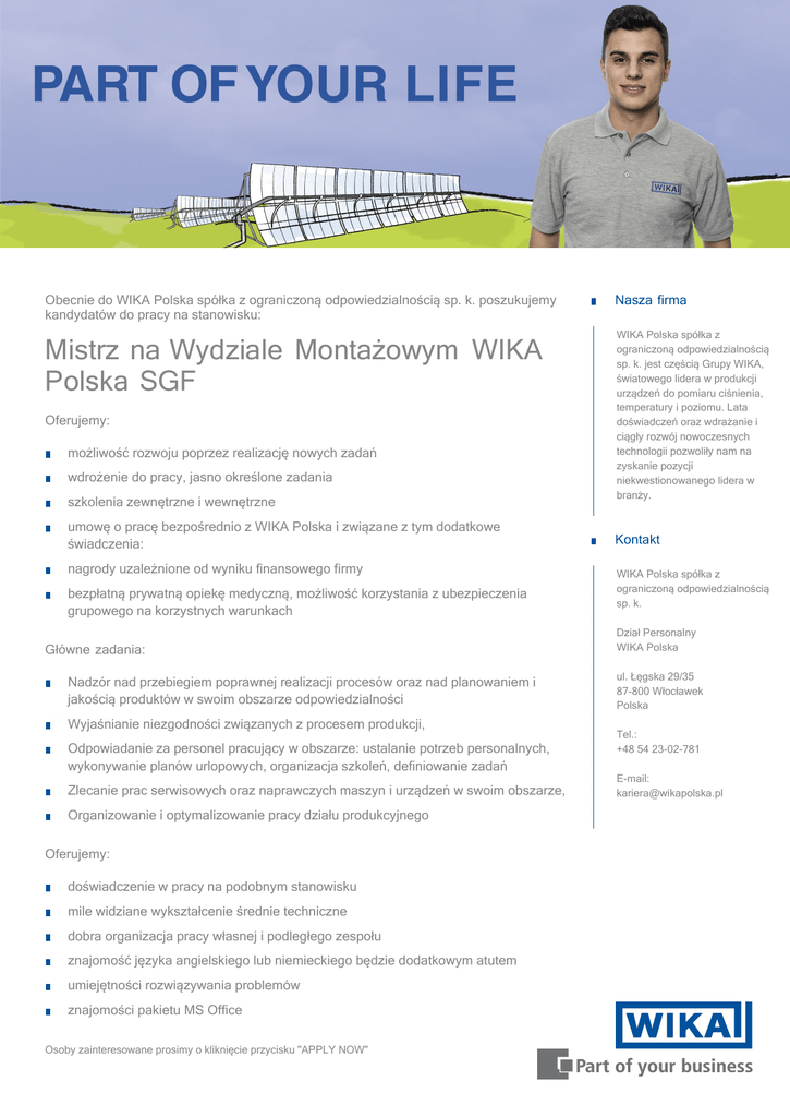 Obecnie do WIKA Polska spółka z ograniczoną odpowiedzialnością sp. k. poszukujemy kandydatów do pracy na stanowisku: Nasza firma Mistrz na Wydziale Montażowym WIKA Polska SGF WIKA Polska spółka z ograniczoną odpowiedzialnością sp. k. jest częścią Grupy WIKA, światowego lidera w produkcji urządzeń do pomiaru ciśnienia, temperatury i poziomu. Lata doświadczeń oraz wdrażanie i ciągły rozwój nowoczesnych technologii pozwoliły nam na zyskanie pozycji niekwestionowanego lidera w branży. Oferujemy: możliwość rozwoju poprzez realizację nowych zadań wdrożenie do pracy, jasno określone zadania szkolenia zewnętrzne i wewnętrzne umowę o pracę bezpośrednio z WIKA Polska i związane z tym dodatkowe świadczenia: nagrody uzależnione od wyniku finansowego firmy bezpłatną prywatną opiekę medyczną, możliwość korzystania z ubezpieczenia grupowego na korzystnych warunkach Główne zadania: Nadzór nad przebiegiem poprawnej realizacji procesów oraz nad planowaniem i jakością produktów w swoim obszarze odpowiedzialności Wyjaśnianie niezgodności związanych z procesem produkcji, Odpowiadanie za personel pracujący w obszarze: ustalanie potrzeb personalnych, wykonywanie planów urlopowych, organizacja szkoleń, definiowanie zadań Zlecanie prac serwisowych oraz naprawczych maszyn i urządzeń w swoim obszarze, Organizowanie i optymalizowanie pracy działu produkcyjnego Oferujemy: doświadczenie w pracy na podobnym stanowisku mile widziane wykształcenie średnie techniczne dobra organizacja pracy własnej i podległego zespołu znajomość języka angielskiego lub niemieckiego będzie dodatkowym atutem umiejętności rozwiązywania problemów znajomości pakietu MS Office Osoby zainteresowane prosimy o kliknięcie przycisku "APPLY NOW" Kontakt WIKA Polska spółka z ograniczoną odpowiedzialnością sp. k. Dział Personalny WIKA Polska ul. Łęgska 29/35 87-800 Włocławek Polska Tel.: +48 54 23-02-781 E-mail: [email protected]