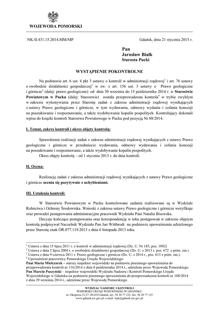 WOJEWODA POMORSKI Gdańsk, dnia 21 stycznia 2015 r. NK-II.431.15.2014.MM/MP Pan Jarosław Białk Starosta Pucki WYSTĄPIENIE POKONTROLNE Na podstawie art. 6 ust. 4 pkt 3 ustawy o kontroli w administracji rządowej1 i art. 76 ustawy o swobodzie działalności gospodarczej2 w zw. z art. 156 ust. 3 ustawy o Prawo geologiczne i górnicze3 (dalej: prawo geologiczne) od dnia 30 września do 15 października 2014 r. w Starostwie Powiatowym w Pucku (dalej: Starostwie) została przeprowadzona kontrola4 w trybie zwykłym w zakresie wykonywania przez Starostę zadań z zakresu administracji rządowej wynikających z ustawy Prawo geologiczne i górnicze, w tym wydawania, odmowy wydania i cofania koncesji na poszukiwanie i rozpoznawanie, a także wydobywanie kopalin pospolitych. Kontrolujący dokonali wpisu do książki kontroli Starostwa Powiatowego w Pucku pod pozycją Nr 88/2014. I. Temat, zakres kontroli i okres objęty kontrolą: Sprawdzenie realizacji zadań z zakresu administracji rządowej wynikających z ustawy Prawo geologiczne i górnicze w przedmiocie wydawania, odmowy wydawania i cofania koncesji na poszukiwanie i rozpoznawanie, a także wydobywanie kopalin pospolitych. Okres objęty kontrolą – od 1 stycznia 2013 r. do dnia kontroli. II. Ocena: Realizację zadań z zakresu administracji rządowej wynikających z ustawy Prawo geologiczne i górnicze ocenia się pozytywnie z uchybieniami. III. Ustalenia kontroli: W Starostwie Powiatowym w Pucku kontrolowane zadania realizowane są w Wydziale Rolnictwa i Ochrony Środowiska. Wnioski z zakresu ustawy Prawo geologiczne i górnicze weryfikuje oraz prowadzi postępowania administracyjne pracownik Wydziału Pani Natalia Bisewska. Decyzje kończące postępowania oraz korespondencję w toku postępowań w zakresie objętym kontrolą podpisywał Naczelnik Wydziału Pan Jan Wittbrodt na podstawie upoważnienia udzielonego przez Starostę znak OR.077.119.2013 z dnia 6 listopada 2013 roku. 1 Ustawa z dnia 15 lipca 2011 r. o kontroli w administracji rządowej (Dz. U. Nr 185, poz. 1092) Ustawa z dnia 2 lipca 2004 r. o swobodzie działalności gospodarczej (Dz. U. z 2013 r. poz. 672 z późn. zm.) 3 Ustawa z dnia 9 czerwca 2011 r. Prawo geologiczne i górnicze (Dz. U. z 2014 r., poz. 613 z późn. zm.). 4 Upoważnieni pracownicy Pomorskiego Urzędu Wojewódzkiego: Pani Maria Mielczarek – starszy inspektor wojewódzki na podstawie pisemnego upoważnienia do przeprowadzenia kontroli nr 116/2014 z dnia 8 października 2014 r., udzielone przez Wojewodę Pomorskiego. Pan Marcin Puszyński – inspektor wojewódzki Wydziału Nadzoru i Kontroli Pomorskiego Urzędu Wojewódzkiego w Gdańsku na podstawie pisemnego upoważnienia do przeprowadzenia kontroli nr 108/2014 z dnia 29 września 2014 r., udzielone przez Wojewodę Pomorskiego. 2 WYDZIAŁ NADZORU I KONTROLI POMORSKI URZĄD WOJEWÓDZKI W GDAŃSKU ul. Okopowa 21/27, 80-810 Gdańsk, tel.: 58 30 77 233, fax: 58 30 77 125 www.gdansk.uw.gov.pl, e-mail: [email protected] W okresie objętym kontrolą Starosta Pucki prowadził postępowania administracyjne i wydał decyzje w ilości: - 29 decyzji zatwierdzających projekty robót geologicznych, - 26 postępowań dot. przyjęcia zgłoszeń projektów robót geologicznych obejmujących wyłącznie wiercenia w celu wykorzystania ciepła Ziemi, w tym 1 decyzja sprzeciwiająca się rozpoczęciu projektowanych robót, - 17 decyzji zatwierdzających dokumentacje hydrogeologiczne, w tym 3 decyzje odmawiające zatwierdzenia, - 1 postępowanie w sprawie wymierzenia podwyższonej opłaty eksploatacyjnej, Do Starosty nie wpłynęły w kontrolowanym okresie zawiadomienia dotyczące wydobycia kopaliny na własne potrzeby, ani wnioski o wydanie nowych koncesji na wydobywanie kopalin. Starosta nie wydawał również decyzji o cofnięciu koncesji na wydobywanie kopalin pospolitych. W trakcie kontroli dokonano szczegółowej analizy akt wszystkich prowadzonych spraw. W zakresie postępowań dotyczących zatwierdzania projektów robót geologicznych ustalono: W większości decyzje Starosty spełniały wymogi ustawy Prawo geologiczne i górnicze oraz wymogi ustawy Kodeks postępowania administracyjnego (dalej Kpa). Prowadzone postępowania w celu wydania decyzji zatwierdzających projekt robót geologicznych wymagały dłuższego terminu na załatwienie niż 1 miesiąc, z uwagi na wymóg z art. 80 ust. 5 ustawy Prawo geologiczne i górnicze uzyskania opinii właściwego wójta, burmistrza lub prezydenta, który był przez Starostę każdorazowo realizowany. W uzasadnionych przypadkach Starosta występował również o uzupełnienie składanych wniosków i dokumentacji. Wśród analizowanych postępowań należy podnieść zaistniałe uchybienia związane z weryfikowaniem składanych wniosków i dotyczące udziału pełnomocnika w postępowaniu administracyjnym, wynikające ze złożonej struktury strony będącej osobą prawną działającą w formie spółki. W sprawie znak: ROŚ.6530.8.2013 wnioskodawcę reprezentował samodzielnie prokurent spółki mimo faktu, że zgodnie z informacjami ujawnionymi w Krajowym Rejestrze Sądowym spółkę tę może reprezentować jedynie prokurent wspólnie z członkiem zarządu. Wątpliwości budzi również kwestia pełnomocnictwa w sprawie ROŚ.6530.12.2013. W aktach sprawy nie ma informacji, czy osoba udzielająca pełnomocnictwa w imieniu osoby prawnej mogła samodzielnie dokonać takiej czynności. Z uwagi na fakt, że osoba prawna działa jedynie przez swoje organy nie ma pewności czy pełnomocnictwo to zostało udzielone prawidłowo, a co za tym idzie czy czynności podejmowane przez pełnomocnika są ważne. Zwrócenie uwagi czy wnioski składane do Starosty są podpisywane i opatrzone pieczątką osoby posiadającej prawidłowe upoważnienie do reprezentowania wnioskodawcy jest istotne, bowiem zgodnie z przepisami prawa wniosek podpisany przez osobę nieupoważnioną nie wywołuje skutków prawnych, a co za tym idzie organ administ