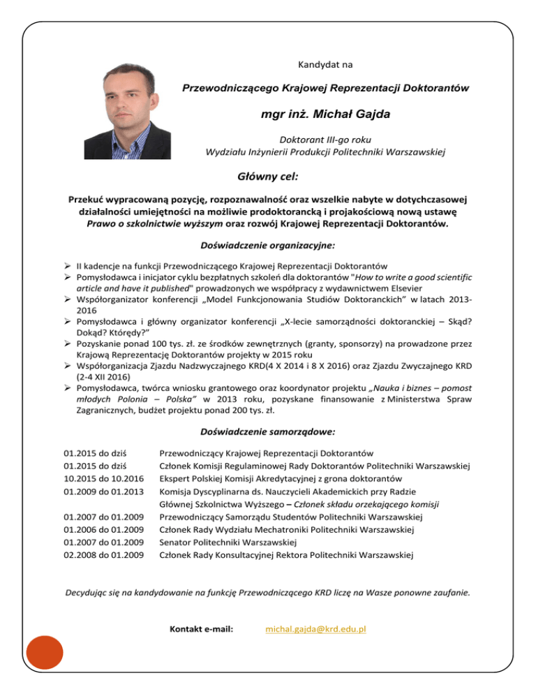 Kandydat na Przewodniczącego Krajowej Reprezentacji Doktorantów mgr inż. Michał Gajda Doktorant III-go roku Wydziału Inżynierii Produkcji Politechniki Warszawskiej Główny cel: Przekuć wypracowaną pozycję, rozpoznawalność oraz wszelkie nabyte w dotychczasowej działalności umiejętności na możliwie prodoktorancką i projakościową nową ustawę Prawo o szkolnictwie wyższym oraz rozwój Krajowej Reprezentacji Doktorantów. Doświadczenie organizacyjne: II kadencje na funkcji Przewodniczącego Krajowej Reprezentacji Doktorantów Pomysłodawca i inicjator cyklu bezpłatnych szkoleń dla doktorantów "How to write a good scientific article and have it published" prowadzonych we współpracy z wydawnictwem Elsevier Współorganizator konferencji „Model Funkcjonowania Studiów Doktoranckich” w latach 20132016 Pomysłodawca i główny organizator konferencji „X-lecie samorządności doktoranckiej – Skąd? Dokąd? Którędy?” Pozyskanie ponad 100 tys. zł. ze środków zewnętrznych (granty, sponsorzy) na prowadzone przez Krajową Reprezentację Doktorantów projekty w 2015 roku Współorganizacja Zjazdu Nadzwyczajnego KRD(4 X 2014 i 8 X 2016) oraz Zjazdu Zwyczajnego KRD (2-4 XII 2016) Pomysłodawca, twórca wniosku grantowego oraz koordynator projektu „Nauka i biznes – pomost młodych Polonia – Polska” w 2013 roku, pozyskane finansowanie z Ministerstwa Spraw Zagranicznych, budżet projektu ponad 200 tys. zł. Doświadczenie samorządowe: 01.2015 do dziś 01.2015 do dziś 10.2015 do 10.2016 01.2009 do 01.2013 01.2007 do 01.2009 01.2006 do 01.2009 01.2007 do 01.2009 02.2008 do 01.2009 Przewodniczący Krajowej Reprezentacji Doktorantów Członek Komisji Regulaminowej Rady Doktorantów Politechniki Warszawskiej Ekspert Polskiej Komisji Akredytacyjnej z grona doktorantów Komisja Dyscyplinarna ds. Nauczycieli Akademickich przy Radzie Głównej Szkolnictwa Wyższego – Członek składu orzekającego komisji Przewodniczący Samorządu Studentów Politechniki Warszawskiej Członek Rady Wydziału Mechatroniki Politechniki Warszawskiej Senator Politechniki Warszawskiej Członek Rady Konsultacyjnej Rektora Politechniki Warszawskiej Decydując się na kandydowanie na funkcję Przewodniczącego KRD liczę na Wasze ponowne zaufanie. Kontakt e-mail: [email protected]