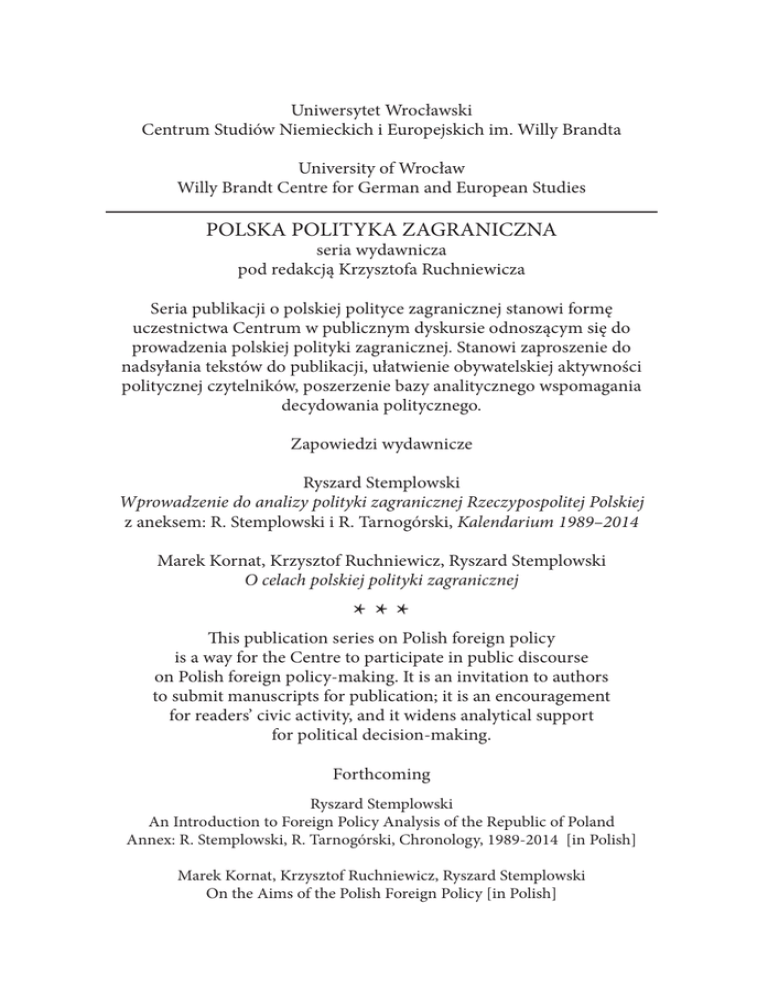Uniwersytet Wrocławski Centrum Studiów Niemieckich i Europejskich im. Willy Brandta University of Wrocław Willy Brandt Centre for German and European Studies POLSKA POLITYKA ZAGRANICZNA seria wydawnicza pod redakcją Krzysztofa Ruchniewicza Seria publikacji o polskiej polityce zagranicznej stanowi formę uczestnictwa Centrum w publicznym dyskursie odnoszącym się do prowadzenia polskiej polityki zagranicznej. Stanowi zaproszenie do nadsyłania tekstów do publikacji, ułatwienie obywatelskiej aktywności politycznej czytelników, poszerzenie bazy analitycznego wspomagania decydowania politycznego. Zapowiedzi wydawnicze Ryszard Stemplowski Wprowadzenie do analizy polityki zagranicznej Rzeczypospolitej Polskiej z aneksem: R. Stemplowski i R. Tarnogórski, Kalendarium 1989–2014 Marek Kornat, Krzysztof Ruchniewicz, Ryszard Stemplowski O celach polskiej polityki zagranicznej *** This publication series on Polish foreign policy is a way for the Centre to participate in public discourse on Polish foreign policy-making. It is an invitation to authors to submit manuscripts for publication; it is an encouragement for readers’ civic activity, and it widens analytical support for political decision-making. Forthcoming Ryszard Stemplowski An Introduction to Foreign Policy Analysis of the Republic of Poland Annex: R. Stemplowski, R. Tarnogórski, Chronology, 1989-2014 [in Polish] Marek Kornat, Krzysztof Ruchniewicz, Ryszard Stemplowski On the Aims of the Polish Foreign Policy [in Polish]