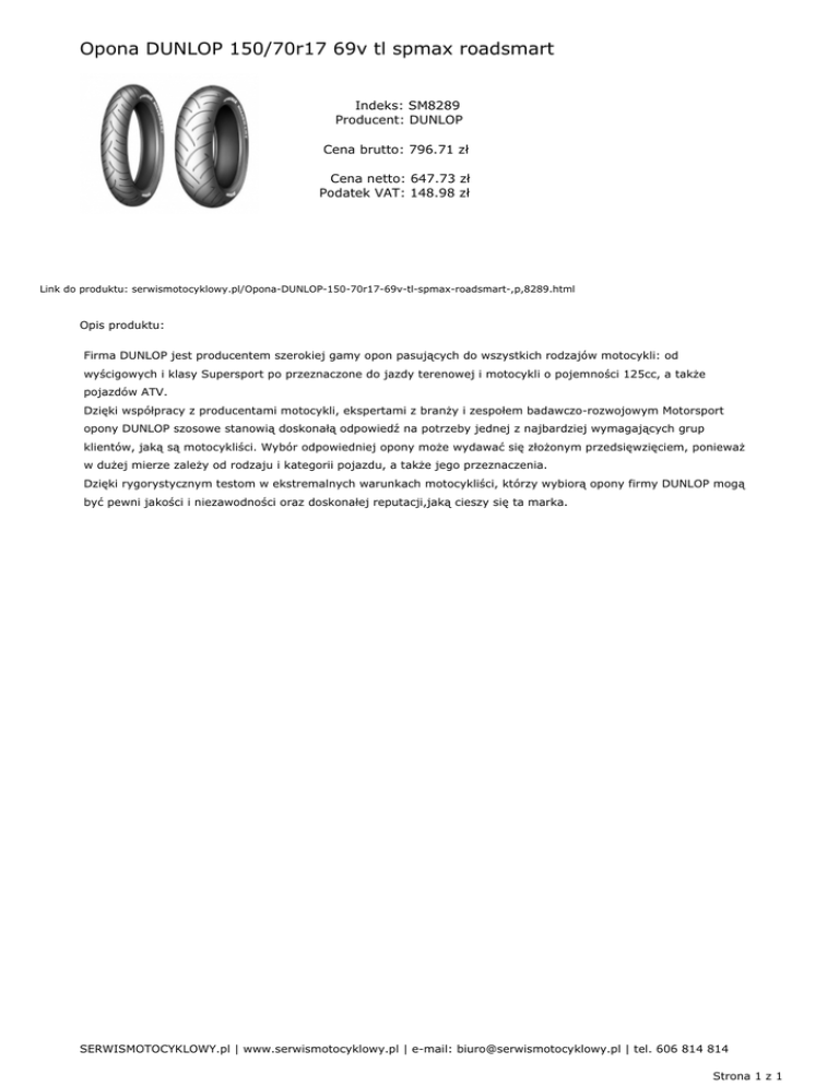 Opona DUNLOP 150/70r17 69v tl spmax roadsmart Indeks: SM8289 Producent: DUNLOP Cena brutto: 796.71 zł Cena netto: 647.73 zł Podatek VAT: 148.98 zł Link do produktu: serwismotocyklowy.pl/Opona-DUNLOP-150-70r17-69v-tl-spmax-roadsmart-,p,8289.html Opis produktu: Firma DUNLOP jest producentem szerokiej gamy opon pasujących do wszystkich rodzajów motocykli: od wyścigowych i klasy Supersport po przeznaczone do jazdy terenowej i motocykli o pojemności 125cc, a także pojazdów ATV. Dzięki współpracy z producentami motocykli, ekspertami z branży i zespołem badawczo-rozwojowym Motorsport opony DUNLOP szosowe stanowią doskonałą odpowiedź na potrzeby jednej z najbardziej wymagających grup klientów, jaką są motocykliści. Wybór odpowiedniej opony może wydawać się złożonym przedsięwzięciem, ponieważ w dużej mierze zależy od rodzaju i kategorii pojazdu, a także jego przeznaczenia. Dzięki rygorystycznym testom w ekstremalnych warunkach motocykliści, którzy wybiorą opony firmy DUNLOP mogą być pewni jakości i niezawodności oraz doskonałej reputacji,jaką cieszy się ta marka. SERWISMOTOCYKLOWY.pl | www.serwismotocyklowy.pl | e-mail: [email protected] | tel. 606 814 814 Strona 1 z 1