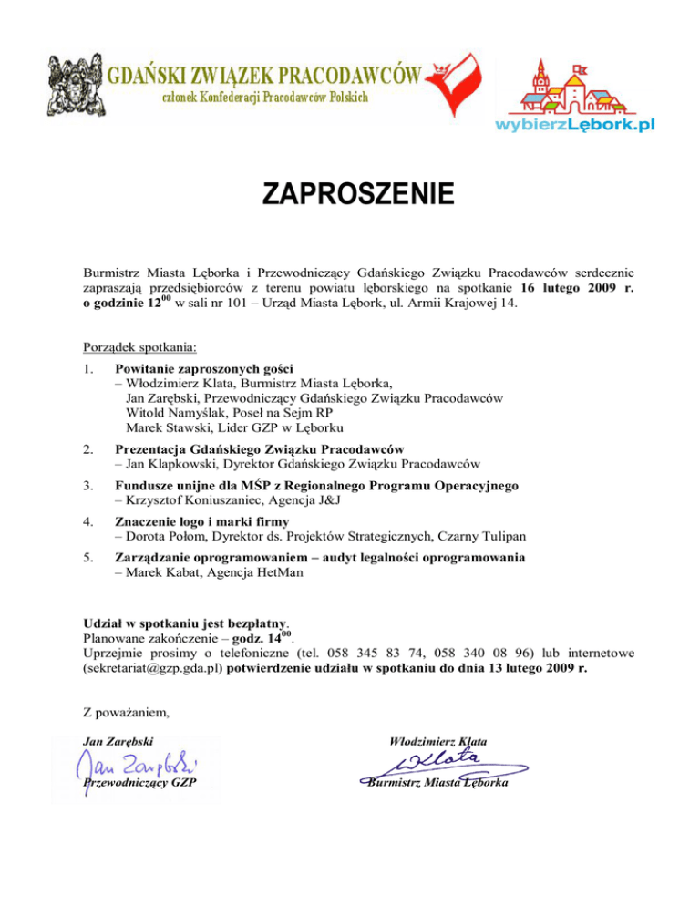 ZAPROSZENIE Burmistrz Miasta Lęborka i Przewodniczący Gdańskiego Związku Pracodawców serdecznie zapraszają przedsiębiorców z terenu powiatu lęborskiego na spotkanie 16 lutego 2009 r. o godzinie 1200 w sali nr 101 – Urząd Miasta Lębork, ul. Armii Krajowej 14. Porządek spotkania: 1. Powitanie zaproszonych gości – Włodzimierz Klata, Burmistrz Miasta Lęborka, Jan Zarębski, Przewodniczący Gdańskiego Związku Pracodawców Witold Namyślak, Poseł na Sejm RP Marek Stawski, Lider GZP w Lęborku 2. Prezentacja Gdańskiego Związku Pracodawców – Jan Klapkowski, Dyrektor Gdańskiego Związku Pracodawców 3. Fundusze unijne dla MŚP z Regionalnego Programu Operacyjnego – Krzysztof Koniuszaniec, Agencja J&J 4. Znaczenie logo i marki firmy – Dorota Połom, Dyrektor ds. Projektów Strategicznych, Czarny Tulipan 5. Zarządzanie oprogramowaniem – audyt legalności oprogramowania – Marek Kabat, Agencja HetMan Udział w spotkaniu jest bezpłatny. Planowane zakończenie – godz. 1400. Uprzejmie prosimy o telefoniczne (tel. 058 345 83 74, 058 340 08 96) lub internetowe ([email protected]) potwierdzenie udziału w spotkaniu do dnia 13 lutego 2009 r. Z poważaniem, Jan Zarębski Przewodniczący GZP Włodzimierz Klata Burmistrz Miasta Lęborka