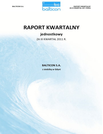BALTICON S.A. RAPORT KWARTALNY ZA III KWARTAŁ 2011 ROKU RAPORT KWARTALNY jednostkowy ZA III KWARTAŁ 2011 R. BALTICON S.A. z siedzibą w Gdyni Gdynia, 14 listopada 2011 roku BALTICON S.A. RAPORT KWARTALNY ZA III KWARTAŁ 2011 ROKU SPIS TREŚCI: LIST ZARZĄDU BALTICON S.A. DO AKCJONARIUSZY ....................................................................... 3 I. WYBRANE JEDNOSTKOWE DANE FINANSOWE ZAWIERAJĄCE PODSTAWOWE POZYCJE BILANSU I RACHUNKU ZYSKÓW I STRAT ZA OKRES OD 1 LIPCA DO 30 WRZEŚNIA 2011 R. ............................ 3 II. CZYNNIKI I ZDARZENIA MAJĄCE WPŁYW NA OSIĄGNIĘTE W III KWARTALE 2011 R. WYNIKI FINANSOWE – KOMENTARZ ZARZĄDU .......................................................................................... 5 III. STANOWISKO ZARZĄDU ODNOŚNIE MOŻLIWOŚCI ZREALIZOWANIA OPUBLIKOWANYCH PROGNOZ WYNIKÓW NA DANY ROK W ŚWIETLE WYNIKÓW ZAPREZENTOWANYCH W DANYM RAPORCIE KWARTALNYM. ............................................................................................................ 6 IV. OPIS DZIAŁAŃ, JAKIE W OKRESIE OBJĘTYM RAPORTEM PODEJMOWANE BYŁY W OBSZARZE ROZWOJU PROWADZONEJ DZIAŁALNOŚCI, W SZCZEGÓLNOŚCI POPRZEZ DZIAŁANIA NASTAWIONE NA WPROWADZENIE ROZWIĄZAŃ INNOWACYJNYCH W PRZEDSIĘBIORSTWIE ............................... 8 V. OŚWIADCZENIE ZARZĄDU DOTYCZĄCE INFORMACJI FINANSOWYCH I DANYCH PORÓWNYWALNYCH ZA III KWARTAŁ 2011 ROKU. ........................................................................ 9 Gdynia, 14 listopada 2011 roku BALTICON S.A. RAPORT KWARTALNY ZA III KWARTAŁ 2011 ROKU Gdynia, dnia 14 listopada sierpnia 2011 roku LIST ZARZĄDU BALTICON S.A. DO AKCJONARIUSZY Szanowni Państwo, Przekazujemy w Wasze ręce kolejny jednostkowy raport okresowy Balticon S.A. za okres lipiec - wrzesień. Celem podtrzymania wyznaczonych sobie, podwyższonych standardów informacyjnych przekazujemy Państwu raport okresowy uwzględniający zakres informacji przewyższający minimalne wymagania regulaminowe rynku NewConnect. Rozbudowanie pakietu przekazywanych informacji spowodowane jest pragnieniem jak najbardziej rzetelnego informowania o naszej działalności bieżącej oraz realizowanej strategii rozwoju Balticon S.A. W przedstawionym Państwu trzecim kwartale 2011 roku Balticon S.A. osiągnął przychody ze sprzedaży w wysokości prawie 13 mln zł oraz 1,07 mln zysku EBITDA. W skali całego okresu pierwszych trzech kwartałów 2011 roku osiągnięto przychody ze sprzedaży w wysokości 32,4 mln zł, co jest o 62% więcej niż w analogicznym okresie roku poprzedniego. Spółka zanotowała w okresie pierwszych 3 kwartałów 2011 roku porównywalny poziom zysku netto. Z zadowoleniem informujemy Państwa, iż realizacja celów emisyjnych przebiega bez zakłóceń i zgodnie z przyjętym planem. Pozyskane w emisji prywatnej fundusze są inwestowane w terminal przeładunkowy w jednym z najszybciej rosnących portów w Europie - Gdańsku, w rozszerzenie floty kontenerów własnych oraz w specjalistyczny serwis naprawczy. Dziękujemy za Państwa zaufanie i zapraszamy do zapoznania się z jednostkowym raportem okresowym za trzeci kwartał 2011 roku. w imieniu Zarządu, Tomasz Szmid Prezes Zarządu BALTICON S.A. I. WYBRANE JEDNOSTKOWE DANE FINANSOWE ZAWIERAJĄCE PODSTAWOWE POZYCJE BILANSU I RACHUNKU ZYSKÓW I STRAT ZA OKRES OD 1 LIPCA DO WRZEŚNIA 2011 R. Gdynia, 14 listopada 2011 roku BALTICON S.A. Jednostkowe wybrane dane finansowe z Rachunku Zysku i Strat Przychody netto ze sprzedaży RAPORT KWARTALNY ZA III KWARTAŁ 2011 ROKU III kwartał III kwartał Narastająco 3 kwartały Narastająco 3 kwartały 01.07.2011 30.09.2011 01.07.2010 30.09.2010 01.01.2011 30.09.2011 01.01.2010 30.09.2010 12 991 376,51 7 254 950,07 32 420 461,26 20 986 802,43 Zysk/strata na sprzedaży Zysk/strata na działalności operacyjnej Zysk/strata na działalności gospodarczej 1 093 944,71 567 291,99 1 948 905,83 826 450,71 759 692,31 533 849,83 1 021 264,20 722 859,27 640 126,36 485 696,54 746 243,06 558 194,84 EBITDA 1 070 328,48 677 938,94 1 755 480,81 1 096 766,03 Zysk/strata brutto 640 126,36 485 696,54 746 243,06 558 194,84 Zysk/strata netto 447 465,36 353 857,54 369 162,06 375 895,84 Amortyzacja 358 547,30 141 121,80 820 246,56 409 257,09 Wybrane dane finansowe z Bilansu Stan na dzień Stan na dzień 30.09.2011 30.09.2010 Aktywa trwałe 41 114 402,68 28 666 923,71 Rzeczowe aktywa trwałe 13 557 132,74 9 744 124,56 - - 13 852 426,44 5 504 185,52 Należności krótkoterminowe 9 248 930,12 2 742 508,58 Środki pieniężne i inne aktywa pieniężne 1 182 170,62 1 195 126,73 40 021 717,69 28 368 153,13 Zobowiązania długoterminowe 3 652 628,84 1 360 805,73 Zobowiązania krótkoterminowe 11 272 803,59 4 442 150,37 Należności długoterminowe Aktywa obrotowe Kapitał własny * Emitent został zawiązany w dniu 20 września 2010 roku Emitent został zawiązany i istnieje dopiero od września 2010 roku. Emitent w świetle prawa nie jest następcą prawnym spółki BALTICON sp. z o. o. Nie powstał na skutek połączenia, przekształcenia lub podziału spółki BALTICON sp. z o. o. . Jakkolwiek Emitent w toku swojej działalności kontynuuje działalność dotychczas prowadzoną przez spółkę BALTICON Sp. z o. o.. Emitent na skutek przeniesienia przedsiębiorstwa, praw i obowiązków ze wszystkich umów, które wcześniej łączyły BALTICON sp. z o. o. stał się faktycznym sukcesorem tej spółki. Dlatego, celem lepszego zobrazowania wyników osiągniętych przez Emitenta oraz celem umożliwienia porównania tych wyników finansowych, Emitent przedstawia dodatkowo dane dot. wyników finansowych zrealizowanych przez niego w 2011 roku skonsolidowanych z wynikami spółki BALTICON sp. z o. o, oraz dla porównania z rokiem poprzedzającym - wyniki osiągnięte przez spółkę BALTICON sp. z o. o. w drugim kwartale 2010 roku. Gdynia, 14 listopada 2011 roku BALTICON S.A. II. RAPORT KWARTALNY ZA III KWARTAŁ 2011 ROKU CZYNNIKI I ZDARZENIA MAJĄCE WPŁYW NA OSIĄGN