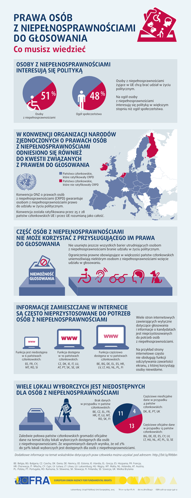 PRAWA OSÓB Z NIEPEŁNOSPRAWNOŚCIAMI DO GŁOSOWANIA. Co musisz wiedzieć. OSOBY Z NIEPEŁNOSPRAWNOŚCIAMI INTERESUJĄ SIĘ POLITYKĄ. 51 % 48 % Osoby z niepełnosprawnościami Osoby z niepełnosprawnościami żyjące w UE chcą brać udział w życiu politycznym. Na ogół osoby z niepełnosprawnościami interesują się polityką w większym stopniu niż ogół społeczeństwa. Ogół społeczeństwa W KONWENCJI ORGANIZACJI NARODÓW ZJEDNOCZONYCH O PRAWACH OSÓB Z NIEPEŁNOSPRAWNOŚCIAMI ODNIESIONO SIĘ RÓWNIEŻ DO KWESTII ZWIĄZANYCH Z PRAWEM DO GŁOSOWANIA. Państwa członkowskie, które ratyfikowały CRPD Państwa członkowskie, które nie ratyfikowały CRPD Konwencja ONZ o prawach osób z niepełnosprawnościami (CRPD) gwarantuje osobom z niepełnosprawnościami prawo do udziału w życiu politycznym. Konwencja została ratyfikowana przez 25 z 28 państw członkowskich UE i przez UE rozumianą jako całość. CZĘŚĆ OSÓB Z NIEPEŁNOSPRAWNOŚCIAMI NIE MOŻE KORZYSTAĆ Z PRZYSŁUGUJĄCEGO IM PRAWA DO GŁOSOWANIA. Nie usunięto jeszcze wszystkich barier utrudniających osobom z niepełnosprawnościami branie udziału w życiu politycznym. Ograniczenia prawne obowiązujące w większości państw członkowskich uniemożliwiają niektórym osobom z niepełnosprawnościami wzięcie udziału w głosowaniu. NIEMOŻNOŚĆ GŁOSOWANIA INFORMACJE ZAMIESZCZANE W INTERNECIE SĄ CZĘSTO NIEPRZYSTOSOWANE DO POTRZEB OSÓB Z NIEPEŁNOSPRAWNOŚCIAMI. Funkcja jest niedostępna w 6 państwach członkowskich: Funkcja dostępna w 10 państwach członkowskich: Funkcja częściowo dostępna w 12 państwach członkowskich: EE, FR, CY, MT, RO, SI CZ, DK, IE, IT, LU, AT, PT, SK, SE, UK BE, BG, DE, EL, ES, HR, LV, LT, HU, NL, PL, FI Wiele stron internetowych zawierających wytyczne dotyczące głosowania i informacje o kandydatach jest nieprzystosowanych do potrzeb osób z niepełnosprawnościami. Na przykład strony internetowe często nie obsługują funkcji odczytywania zawartości ekranu, z której korzystają osoby niewidome. WIELE LOKALI WYBORCZYCH JEST NIEDOSTĘPNYCH DLA OSÓB Z NIEPEŁNOSPRAWNOŚCIAMI. Częściowe nieoficjalne dane w przypadku 4 państw członkowskich: Brak danych w przypadku 11 państw członkowskich: DK, IE, PT, UK BE, CZ, EL, FR, HR, IT, LU, MT, RO, SK, FI Zaledwie połowa państw członkowskich gromadzi oficjalne dane na temat liczby lokali wyborczych dostępnych dla osób z niepełnosprawnościami. Ze wspomnianych danych wynika, że od 2% do 50% lokali wyborczych jest dostępnych dla osób z niepełnosprawnościami. Częściowe oficjalne dane w przypadku 13 państw członkowskich: BG, DE, EE, ES, CY, LV, LT, HU, NL, AT, PL, SI, SE Dodatkowe informacje na temat wskaźników dotyczących praw człowieka można uzyskać pod adresem: http://bit.ly/RItbbn BE: Belgia; BG: Bułgaria; CZ: Czechy; DK: Dania; DE: Niemcy; EE: Estonia; IE: Irlandia; EL: Grecja; ES: Hiszpania; FR: Francja; HR: Chorwacja; IT: Włochy; CY: Cypr; LV: Łotwa; LT: Litwa; LU: Luksemburg; HU: Węgry; MT: Malta; NL: Holandia; AT: Austria; PL: Polska; PT: Portugalia; RO: Rumunia; SI: Słowenia; SK: Słowacja; FI: Finlandia; SE: Szwecja; UK: Wielka Brytania Luksemburg: Urząd Publikacji Unii Europejskiej, 2015 TK-01-14-841-PL-N doi:10.2811/80451 ISBN 978-92-9239-546-9