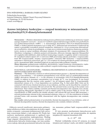 POLIMERY 2007, 52, nr 7—8 562 EWA WIŒNIEWSKA, BARBARA PABIN-SZAFKO Politechnika Szczeciñska Instytut Polimerów, Zak³ad Chemii Fizycznej Polimerów ul. Pu³askiego 10, 70-322 Szczecin e-mail: [email protected] Azowe inicjatory funkcyjne — rozpad termiczny w mieszaninach akrylonitryl/N,N-dimetyloformamid Streszczenie — Zbadano elementarn¹ reakcjê procesu polimeryzacji rodnikowej, tj. termiczny rozpad szeregu inicjatorów azowych — kwasu 4,4‘-azobis(4-cyjanowalerianowego) (ACPA) oraz pochodnych 2,2‘-azobisizobutyronitrylu (AIBN) — w mieszaninach akrylonitryl (AN)/N,N-dimetyloformamid (DMF), w funkcji stê¿enia monomeru (xM) w temp. 60 oC. Jednoznacznie stwierdzono I-rzêdowoœæ tej reakcji w przypadku wszystkich u¿ytych inicjatorów. Zale¿noœci kd = f(xM) wyznaczone doœwiadczalnie s¹ nieliniowe, ró¿ni¹ siê przebiegiem, co wi¹¿e siê ze zró¿nicowan¹ budow¹ chemiczn¹ azoinicjatorów, mo¿na je opisaæ modelem solwatacji inicjatora (I) monomerem (M) i rozpuszczalnikiem (S). Okreœlono wystêpuj¹ce w uk³adzie postacie solwatacyjne, obliczono (stosuj¹c algorytm Marquardta) ich wzglêdne sta³e stabilnoœci, sta³e szybkoœci termicznego rozpadu i wzglêdny udzia³ w mieszaninie. W warunkach ma³ych stê¿eñ AN w roztworze DMF przewa¿aj¹ solwaty podwójne z rozpuszczalnikiem SIS (rozpuszczalnik, inicjator, rozpuszczalnik) i mieszane MIS (monomer + rozpuszczalnik), natomiast w stê¿onych roztworach, gdy xM > 0,5 zwiêksza siê udzia³ podwójnych postaci solwatacyjnych z monomerem MIM, charakteryzuj¹cych siê najwy¿sz¹ sta³¹ szybkoœci rozpadu. S³owa kluczowe: polimeryzacja rodnikowa akrylonitrylu, rozpad termiczny azoinicjatorów, rzêdowoœæ reakcji rozpadu termicznego, sta³a szybkoœci rozpadu termicznego, solwatacja inicjatora. FUNCTIONAL AZO-INITIATORS — THERMAL DECOMPOSITION IN ACRYLONITRILE/N,N-DIMETHYLFORMAMIDE MIXTURES Summary — The elementary reaction in radical polymerization process i.e. thermal decomposition of series of azo-initiators — 4,4‘-azobis(4-cyanopentanoic) acid (ACPA) and 2,2‘-azobisisobutyronitrile (AIBN) derivatives (Scheme A) — in the mixtures of acrylonitrile (AN)/N,N-dimethylformamide (DMF), in relation to monomer concentration (xM) at temp. 60 oC, was investigated. It was found unambiguously that the reaction order equaled 1 for all initiators tested (Fig. 2). Experimentally determined courses of kd = f(xM) dependence are nonlinear (Fig. 3), their plots differ what can be connected with diverse chemical structures of azo-initiators, and they can be described by a model of initiator solvation by monomer (M) and solvent (S). The solvated forms occurring in the system were determined. Their relative stability constants and thermal decomposition rate constants were calculated (applying Marquardt‘s algorithm) as well as relative parts in the mixture (Table 3). At low AN concentrations in DMF solutions the double solvates with solvent SIS and mixed MIS (monomer + solvent) predominate whereas in the concentrated solutions, when xM > 0.5, the contribution of double solvated forms with monomer MIM, characterized with the highest decomposition rate constant, increases. Key words: radical polymerization of acrylonitrile, thermal decomposition of azo-initiators, order of thermal decomposition reaction, thermal decomposition rate constant, initiator solvation. Odkrycie nowych mo¿liwoœci sterowania polimeryzacj¹ rodnikow¹ a tak¿e niewyjaœnione do koñca zagadnienia zwi¹zanie z procesem polimeryzacji by³y powodem wznowienia badañ w tym zakresie [1]. Prosty ³añcuchowy mechanizm polimeryzacji w ogólnych zarysach poznano i powszechnie zaakceptowano. Wed³ug niego etapami elementarnymi s¹: inicjowanie, wzrost i zakoñczenie ³añcucha kinetycznego, zaœ inne podstawowe reakcje, takie jak przeniesienie ³añcucha (na inicja- tor, monomer, polimer b¹dŸ rozpuszczalnik) s¹ pomijane. W tym prostym mechanizmie ³añcuchowym szybkoœæ polimeryzacji Rp jest proporcjonalna do stê¿enia inicjatora [I] i stê¿enia monomeru [M] Rp = K •[I]0,5 • [M] (1) Wartoœæ wyk³adnika równa 0,5 oznacza, ¿e rozpad inicjatora jest reakcj¹ I rzêdu, zaœ sta³oœæ wspó³czynnika POLIMERY 2007, 52, nr 7—8 K — jego niezale¿noœæ od stê¿eñ monomeru i inicjatora, a wiêc brak efektu rozcieñczenia; jest to prawid³owoœæ kinetyczna [2]. Jednak¿e, w polimeryzacji rodnikowej — procesie z³o¿onym — mo¿liwy jest wp³yw rozpuszczalnika na ka¿d¹ z reakcji elementarnych, ponadto doœwiadczalna weryfikacja wniosków z zale¿noœci (1) spowodowa³a, ¿e dopiero stosunkowo niedawno zrozumiano z³o¿onoœæ etapu inicjowania i doceniono jego wp³yw na strukturê polimeru [3]. Pocz¹tkowo uwa¿ano, ¿e rodzaj rozpuszczalnika nie wp³ywa na ten proces lub jest na tyle nieznaczny, ¿e mo¿na go pomin¹æ [4]. W wielu przypadkach stwierdzono jednak, ¿e efekt rozpuszczalnika jest silny na tyle, by staæ siê przyczyn¹ zale¿noœci ca³kowitej sta³ej szybkoœci reakcji od œrodowiska i nie powinien byæ zaniedbywany [5—12]. Jednym z etapów inicjowania jest rozpad termiczny inicjatora. Zale¿noœæ sta³ej szybkoœci rozpadu ró¿nych inicjatorów od sk³adu mieszaniny reakcyjnej by³a przedmiotem badañ opisanych przez nas w tej publikacji i w wielu poprzednich [13, 14]. Poniewa¿ efekt stê¿eniowy nie wi¹¿e siê z w³¹czeniem cz¹steczek rozpuszczalnika lub ich fragmentów w ³añcuch polimerowy, to analizie poddano czynniki inne ni¿ udzia³ rozpuszczalnika jako reagenta. Solwatowanie inicjatora w rozpuszczalniku lub w mieszaninie rozpuszczalnik/monomer nastêpuje w wyniku oddzia³ywañ miêdzycz¹steczkowych substancji rozpuszczanej i rozpuszczalnika. W konsekwencji cz¹steczki inicjatora s¹ selektywnie solwatowane przez sk³adniki roztworu. Koncepcja opisu badanego procesu za pomoc¹ teorii solwatacji inicjatora monomerem i rozpuszczalnikiem uwzglêdnia wp³yw sk³adu mieszaniny reakcyjnej na przebieg rozp