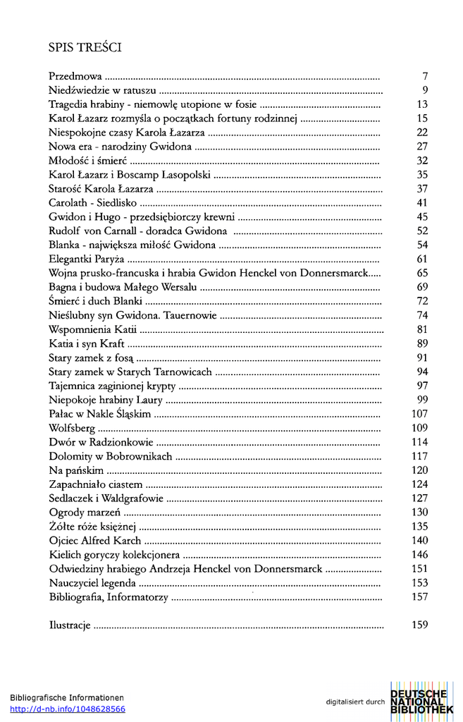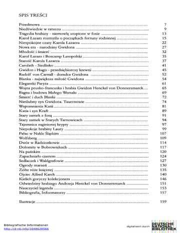 SPIS TREŚCI Przedmowa Niedźwiedzie w ratuszu Tragedia hrabiny - niemowlę utopione w fosie Karol Łazarz rozmyśla o początkach fortuny rodzinnej Niespokojne czasy Karola Łazarza Nowa era - narodziny Gwidona Młodość i śmierć Karol Łazarz i Boscamp Lasopolski Starość Karola Łazarza Carolath - Siedlisko Gwidon i Hugo - przedsiębiorczy krewni Rudolf von Carnall - doradca Gwidona Blanka - największa miłość Gwidona Elegantki Paryża Wojna prusko-francuska i hrabia Gwidon Henckel von Donnersmarck Bagna i budowa Małego Wersalu Śmierć i duch Blanki Nieślubny syn Gwidona. Tauernowie Wspomnienia Katii Katia i syn Kraft Stary zamek z fosą Stary zamek w Starych Tarnowicach Tajemnica zaginionej krypty Niepokoje hrabiny Laury Pałac w Nakle Śląskim Wolfsberg Dwór w Radzionkowie Dolomity w Bobrownikach Na pańskim Zapachniało ciastem Sedlaczek i Waldgrafowie Ogrody marzeń Żółte róże księżnej Ojciec Alfred Karch Kielich goryczy kolekcjonera Odwiedziny hrabiego Andrzeja Henckel von Donnersmarck Nauczyciel legenda Bibliografia, Informatorzy 7 9 13 15 22 27 32 35 37 41 45 52 54 61 65 69 72 74 81 89 91 94 97 99 107 109 114 117 120 124 127 130 135 140 146 151 153 157 Ilustracje 159 http://d-nb.info/1048628566