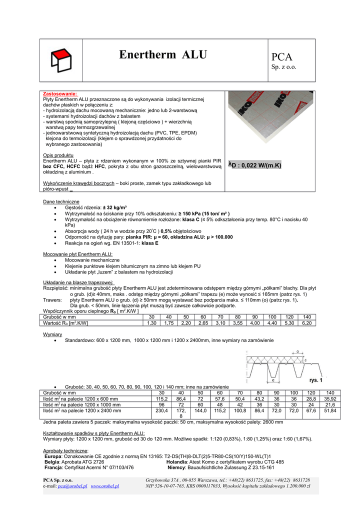 Enertherm ALU PCA Sp. z o.o. Zastosowanie: Płyty Enertherm ALU przeznaczone są do wykonywania izolacji termicznej dachów płaskich w połączeniu z: - hydroizolacją dachu mocowaną mechanicznie: jedno lub 2-warstwową - systemami hydroizolacji dachów z balastem - warstwą spodnią samoprzylepną ( klejoną częściowo ) + wierzchnią warstwą papy termozgrzewalnej - jednowarstwową syntetyczną hydroizolacją dachu (PVC, TPE, EPDM) klejona do termoizolacji (klejem o sprawdzonej przydatności do wybranego zastosowania) Opis produktu Enertherm ALU – płyta z rdzeniem wykonanym w 100% ze sztywnej pianki PIR bez CFC, HCFC bądź HFC, pokryta z obu stron gazoszczelną, wielowarstwową okładziną z aluminium . λD : 0,022 W/(m.K) Wykończenie krawędzi bocznych – boki proste, zamek typu zakładkowego lub pióro-wpust Dane techniczne Gęstość rdzenia: ± 32 kg/m³ Wytrzymałość na ściskanie przy 10% odkształceniu: ≥ 150 kPa (15 ton/ m² ) Wytrzymałość na obciążenie równomiernie rozłożone: klasa C (≤ 5% odkształcenia przy temp. 80°C i nacisku 40 kPa) Absorpcja wody ( 24 h w wodzie przy 20ºC ) 0,5% objętościowo Odporność na dyfuzję pary: pianka PIR: μ = 60, okładzina ALU: μ > 100.000 Reakcja na ogień wg. EN 13501-1: klasa E Mocowanie płyt Enertherm ALU: Mocowanie mechaniczne Klejenie punktowe klejem bitumicznym na zimno lub klejem PU Układanie płyt „luzem” z balastem na hydroizolacji Układanie na blasze trapezowej: Rozpiętość: minimalna grubość płyty Enertherm ALU jest zdeterminowana odstępem między górnymi „półkami” blachy. Dla płyt o grub. (d)≥ 40mm, maks . odstęp między górnymi „półkami” trapezu (e) może wynosić ≤ 165mm (patrz rys. 1) Trawers: płyty Enertherm ALU o grub. (d) ≥ 50mm mogą wystawać bez podparcia maks. ≤ 110mm (o) (patrz rys. 1). Dla grub. < 50mm, linie łączenia płyt muszą być zawsze całkowicie podparte. Wspólczynnik oporu cieplnego RD [ m2.K/W ] Grubość w mm 30 40 50 60 70 80 90 100 120 140 Wartość RD [m2.K/W] 1,30 1,75 2,20 2,65 3,10 3,55 4,00 4,40 5,30 6,20 Wymiary Standardowo: 600 x 1200 mm, 1000 x 1200 mm i 1200 x 2400mm, inne wymiary na zamówienie Grubość: 30, 40, 50, 60, 70, 80, 90, 100, 120 i 140 mm; inne na zamówienie Grubość w mm 30 40 50 60 70 80 90 Ilość m2 na palecie 1200 x 600 mm 115,2 86,4 72 57,6 50,4 43,2 36 Ilość m2 na palecie 1200 x 1000 mm 96 72 60 48 42 36 30 Ilość m2 na palecie 1200 x 2400 mm 230,4 172, 144,0 115,2 100,8 86,4 72,0 8 Jedna paleta zawiera 5 paczek: maksymalna wysokość paczki: 50 cm, maksymalna wysokość palety: 2600 mm 100 36 30 72,0 120 28,8 24 67,6 Kształtowanie spadków s płyty Enertherm ALU: Wymiary płyty: 1200 x 1200 mm, grubość od 30 do 120 mm. Możliwe spadki: 1:120 (0,83%), 1:80 (1,25%) oraz 1:60 (1,67%). Aprobaty techniczne: Europa: Oznakowanie CE zgodnie z normą EN 13165: T2-DS(TH)8-DLT(2)5-TR80-CS(10/Y)150-WL(T)1 Belgia: Aprobata ATG 2726 Holandia: Atest Komo z certyfikatem wyrobu CTG 485 Francja: Certyfikat Acermi N° 07/103/476 Niemcy: Bauaufsichtliche Zulassung Z 23.15-161 PCA Sp. z o.o. e-mail: [email protected] www.orobel.pl Grzybowska 37A , 00-855 Warszawa, tel.: +48(22) 8631725, fax: +48(22) 8631728 NIP 526-10-07-765, KRS 0000117033, Wysokość kapitału zakładowego 1.200.000 zł 140 35,92 21,6 51,84