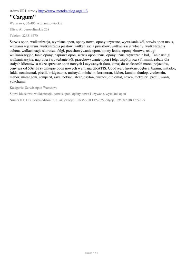 Adres URL strony http://www.motokatalog.org/113 "Cargum" Warszawa, 02-495, woj. mazowieckie Ulica: Al. Jerozolimskie 228 Telefon: 226316770 Serwis opon, wulkanizacja, wymiana opon, opony nowe, opony używane, wyważanie kół, serwis opon ursus, wulkanizacja ursus, wulkanizacja piastów, wulkanizacja pruszków, wulkanizacja włochy, wulkanizacja ochota, wulkanizacja skorosze, felgi, przechowywanie opon, opony letnie, opony zimowe, uslugi wulkanizacyjne, tanie opony, naprawa opon, serwis opon ursus, opony ursus, wywazanie kol,. Tanie usługi wulkanizacyjne, naprawa i wyważanie kół, przechowywanie opon i felg, współpraca z firmami, rabaty dla stałych klientów, a także sprzedaż opon nowych i używanych (lato, zima) do wiekszości marek pojazdów, ceny juz od 50zł. Przy zakupie opon nowych wymiana GRATIS. Goodyear, firestone, dębica, barum, matador, fulda, continental, pirelli, bridgestone, uniroyal, michelin, kormoran, kleber, kumho, dunlop, vredestein, mabor, marangoni, semperit, sava, nokian, alcar, dayton, eurotec, diplomat, nexen, metzeler , profil, wanli, yokohama. Kategorie: Serwis opon Warszawa Słowa kluczowe: wulkanizacja, serwis opon, opony nowe i używane, wymiana opon Numer ID: 113, liczba odsłon: 211, aktywacja: 19/03/2010 13:52:25, edycja: 19/03/2010 13:52:25 Strona 1 / 1