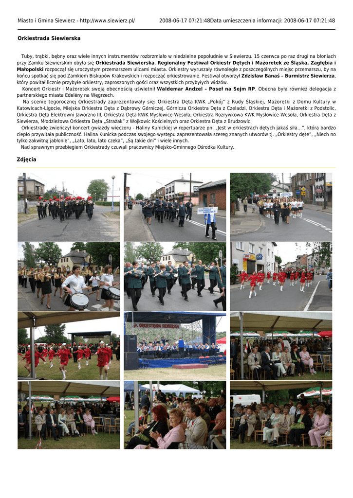 Miasto i Gmina Siewierz - http://www.siewierz.pl/ 2008-06-17 07:21:48Data umieszczenia informacji: 2008-06-17 07:21:48 Orkiestrada Siewierska Tuby, trąbki, bębny oraz wiele innych instrumentów rozbrzmiało w niedzielne popołudnie w Siewierzu. 15 czerwca po raz drugi na błoniach przy Zamku Siewierskim obyła się Orkiestrada Siewierska. Regionalny Festiwal Orkiestr Dętych i Mażoretek ze Śląska, Zagłębia i Małopolski rozpoczął się uroczystym przemarszem ulicami miasta. Orkiestry wyruszały równolegle z poszczególnych miejsc przemarszu, by na końcu spotkać się pod Zamkiem Biskupów Krakowskich i rozpocząć orkiestrowanie. Festiwal otworzył Zdzisław Banaś – Burmistrz Siewierza, który powitał licznie przybyłe orkiestry, zaproszonych gości oraz wszystkich przybyłych widzów. Koncert Orkiestr i Mażoretek swoją obecnością uświetnił Waldemar Andzel – Poseł na Sejm RP. Obecna była również delegacja z partnerskiego miasta Edelény na Węgrzech. Na scenie tegorocznej Orkiestrady zaprezentowały się: Orkiestra Dęta KWK „Pokój” z Rudy Śląskiej, Mażoretki z Domu Kultury w Katowicach-Ligocie, Miejska Orkiestra Dęta z Dąbrowy Górniczej, Górnicza Orkiestra Dęta z Czeladzi, Orkiestra Dęta i Mażoretki z Podstolic, Orkiestra Dęta Elektrowni Jaworzno III, Orkiestra Dęta KWK Mysłowice-Wesoła, Orkiestra Rozrywkowa KWK Mysłowice-Wesoła, Orkiestra Dęta z Siewierza, Młodzieżowa Orkiestra Dęta „Strażak” z Wojkowic Kościelnych oraz Orkiestra Dęta z Brudzowic. Orkiestradę zwieńczył koncert gwiazdy wieczoru - Haliny Kunickiej w repertuarze pn. „Jest w orkiestrach dętych jakaś siła…”, którą bardzo ciepło przywitała publiczność. Halina Kunicka podczas swojego występu zaprezentowała szereg znanych utworów tj. „Orkiestry dęte”, „Niech no tylko zakwitną jabłonie”, „Lato, lato, lato czeka”, „Są takie dni” i wiele innych. Nad sprawnym przebiegiem Orkiestrady czuwali pracownicy Miejsko-Gminnego Ośrodka Kultury. Zdjęcia Pliki multimedialne [320x240 - 39,00 MB] Informacja: Pliki multimedialne zostały zapisane w formacie AVI (MPEG4). Urząd Miasta i Gminy Siewierz, 42-470 Siewierz, ul. Żwirki i WIgury 16, tel. 32 64 99 400, e-mail: [email protected] Burmistrz Miasta i Gminy Siewierz mgr Zdzisław Banaś