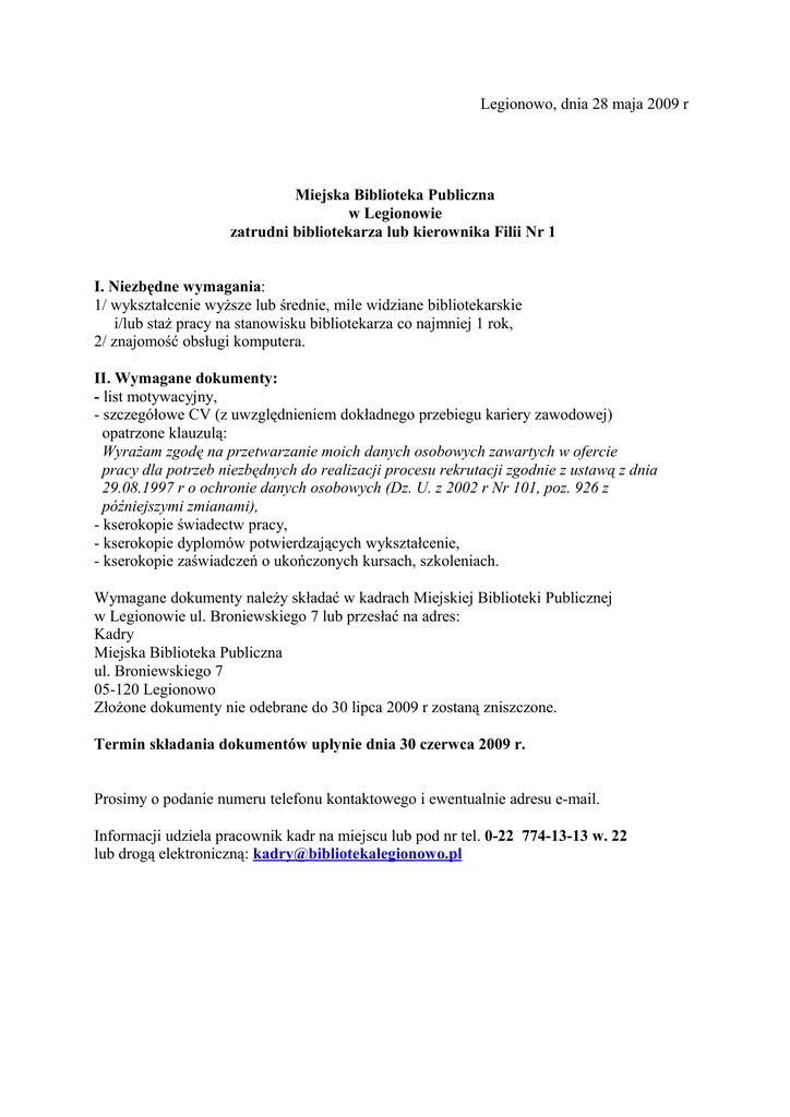 Legionowo, dnia 28 maja 2009 r Miejska Biblioteka Publiczna w Legionowie zatrudni bibliotekarza lub kierownika Filii Nr 1 I. Niezbędne wymagania: 1/ wykształcenie wyższe lub średnie, mile widziane bibliotekarskie i/lub staż pracy na stanowisku bibliotekarza co najmniej 1 rok, 2/ znajomość obsługi komputera. II. Wymagane dokumenty: - list motywacyjny, - szczegółowe CV (z uwzględnieniem dokładnego przebiegu kariery zawodowej) opatrzone klauzulą: Wyrażam zgodę na przetwarzanie moich danych osobowych zawartych w ofercie pracy dla potrzeb niezbędnych do realizacji procesu rekrutacji zgodnie z ustawą z dnia 29.08.1997 r o ochronie danych osobowych (Dz. U. z 2002 r Nr 101, poz. 926 z późniejszymi zmianami), - kserokopie świadectw pracy, - kserokopie dyplomów potwierdzających wykształcenie, - kserokopie zaświadczeń o ukończonych kursach, szkoleniach. Wymagane dokumenty należy składać w kadrach Miejskiej Biblioteki Publicznej w Legionowie ul. Broniewskiego 7 lub przesłać na adres: Kadry Miejska Biblioteka Publiczna ul. Broniewskiego 7 05-120 Legionowo Złożone dokumenty nie odebrane do 30 lipca 2009 r zostaną zniszczone. Termin składania dokumentów upłynie dnia 30 czerwca 2009 r. Prosimy o podanie numeru telefonu kontaktowego i ewentualnie adresu e-mail. Informacji udziela pracownik kadr na miejscu lub pod nr tel. 0-22 774-13-13 w. 22 lub drogą elektroniczną: [email protected]