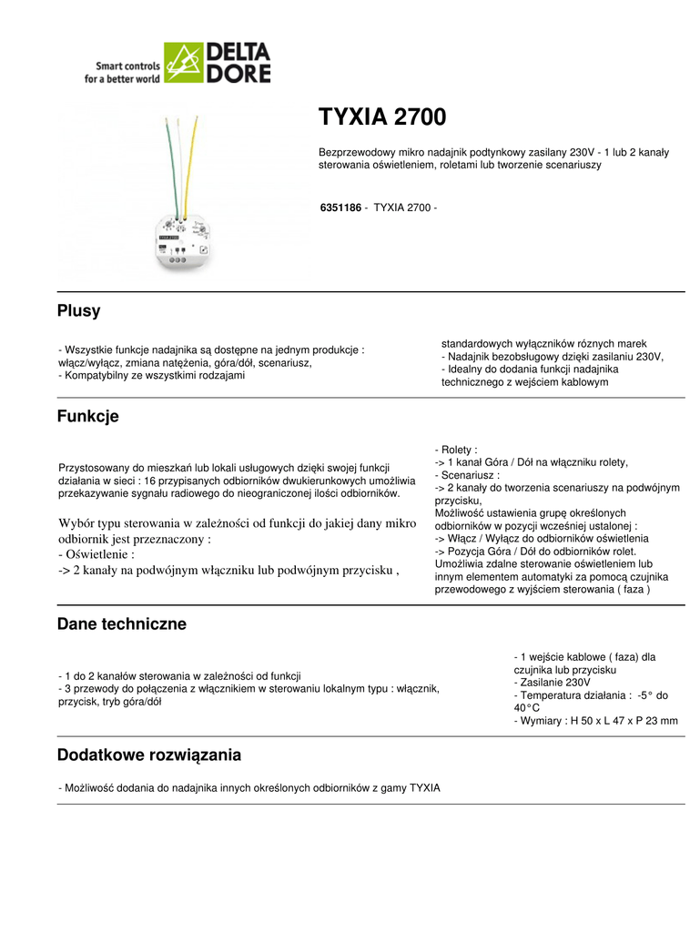 TYXIA 2700 Bezprzewodowy mikro nadajnik podtynkowy zasilany 230V - 1 lub 2 kanały sterowania oświetleniem, roletami lub tworzenie scenariuszy 6351186 - TYXIA 2700 - Plusy standardowych wyłączników róznych marek - Nadajnik bezobsługowy dzięki zasilaniu 230V, - Idealny do dodania funkcji nadajnika technicznego z wejściem kablowym - Wszystkie funkcje nadajnika są dostępne na jednym produkcje : włącz/wyłącz, zmiana natężenia, góra/dół, scenariusz, - Kompatybilny ze wszystkimi rodzajami Funkcje Przystosowany do mieszkań lub lokali usługowych dzięki swojej funkcji działania w sieci : 16 przypisanych odbiorników dwukierunkowych umożliwia przekazywanie sygnału radiowego do nieograniczonej ilości odbiorników. Wybór typu sterowania w zależności od funkcji do jakiej dany mikro odbiornik jest przeznaczony : - Oświetlenie : -> 2 kanały na podwójnym włączniku lub podwójnym przycisku , - Rolety : -> 1 kanał Góra / Dół na włączniku rolety, - Scenariusz : -> 2 kanały do tworzenia scenariuszy na podwójnym przycisku, Możliwość ustawienia grupę określonych odbiorników w pozycji wcześniej ustalonej : -> Włącz / Wyłącz do odbiorników oświetlenia -> Pozycja Góra / Dół do odbiorników rolet. Umożliwia zdalne sterowanie oświetleniem lub innym elementem automatyki za pomocą czujnika przewodowego z wyjściem sterowania ( faza ) Dane techniczne - 1 do 2 kanałów sterowania w zależności od funkcji - 3 przewody do połączenia z włącznikiem w sterowaniu lokalnym typu : włącznik, przycisk, tryb góra/dół Dodatkowe rozwiązania - Możliwość dodania do nadajnika innych określonych odbiorników z gamy TYXIA - 1 wejście kablowe ( faza) dla czujnika lub przycisku - Zasilanie 230V - Temperatura działania : -5° do 40°C - Wymiary : H 50 x L 47 x P 23 mm Schemat techniczny