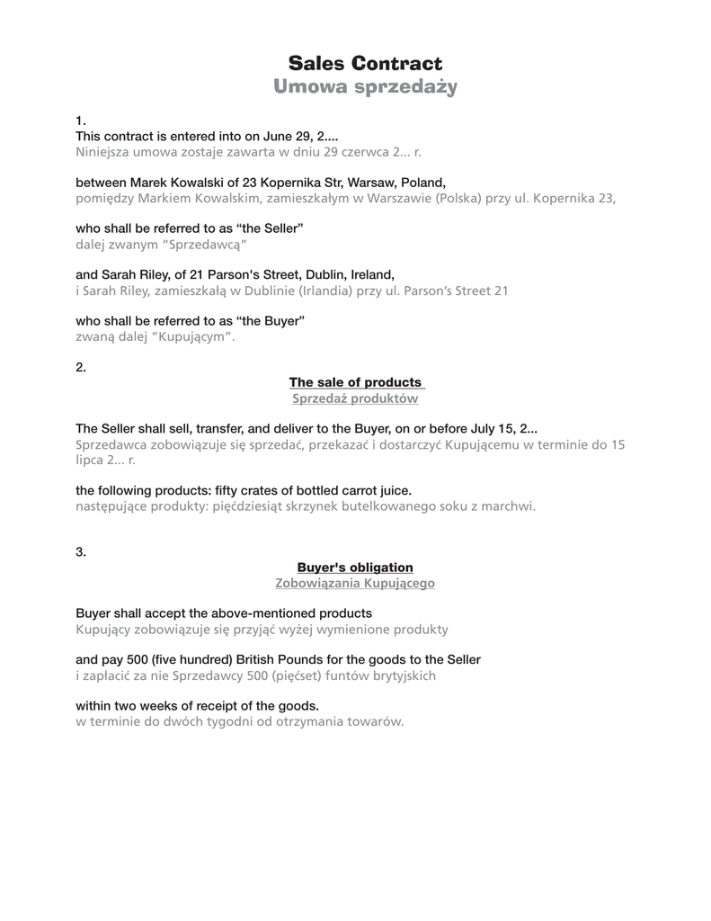 Sales Contract Umowa sprzedaży 1. This contract is entered into on June 29, 2.... Niniejsza umowa zostaje zawarta w dniu 29 czerwca 2... r. between Marek Kowalski of 23 Kopernika Str, Warsaw, Poland, pomiędzy Markiem Kowalskim, zamieszkałym w Warszawie (Polska) przy ul. Kopernika 23, who shall be referred to as “the Seller” dalej zwanym “Sprzedawcą” and Sarah Riley, of 21 Parson's Street, Dublin, Ireland, i Sarah Riley, zamieszkałą w Dublinie (Irlandia) przy ul. Parson’s Street 21 who shall be referred to as “the Buyer” zwaną dalej “Kupującym”. 2. The sale of products Sprzedaż produktów The Seller shall sell, transfer, and deliver to the Buyer, on or before July 15, 2... Sprzedawca zobowiązuje się sprzedać, przekazać i dostarczyć Kupującemu w terminie do 15 lipca 2... r. the following products: fifty crates of bottled carrot juice. następujące produkty: pięćdziesiąt skrzynek butelkowanego soku z marchwi. 3. Buyer's obligation Zobowiązania Kupującego Buyer shall accept the above-mentioned products Kupujący zobowiązuje się przyjąć wyżej wymienione produkty and pay 500 (five hundred) British Pounds for the goods to the Seller i zapłacić za nie Sprzedawcy 500 (pięćset) funtów brytyjskich within two weeks of receipt of the goods. w terminie do dwóch tygodni od otrzymania towarów. Details and Explanations Szczegóły i wyjaśnienia 1. The first section describes the type of contract and the parties involved. Pierwsza część opisuje rodzaj umowy i jej strony. Sometimes, extra personal information such as ID numbers may be needed. Niekiedy mogą być potrzebne dodatkowe informacje, takie jak numery dowodu tożsamości. 2. The description of the basic terms of the transaction. Opis podstawowych warunków transakcji. 3. Any extra commitments of the Buyer. Wszelkie dodatkowe zobowiązania Kupującego. Note: Uwaga: A real contract will be much longer. Prawdziwa umowa będzie znacznie dłuższa. Template Szablon Sales Contract Umowa sprzedaży 1. This contract is entered into on 1. _________ Niniejsza umowa zostaje zawarta w dniu _________ between 2. _________ of 3. _________ _________, ________ pomiędzy _________ zamieszkałym w _________ _________, ________ who shall be referred to as “the Seller” który w dalszej części umowy zwany będzie “Sprzedawcą” and 4. _________, of 5. _________, _________, _________ i ________, zamieszkałą/łym w _________, _________, _________ who shall be referred to as “the Buyer” zwaną dalej “Kupującym”. 2. The sale of products Sprzedaż produktów The Seller shall sell, transfer, and deliver to the buyer, on or before 6. _________ Sprzedawca zobowiązuje się sprzedać, przekazać i dostarczyć Kupującemu w terminie do ______________. the following products: 7. _________ . następujące produkty: _________ . 3. Buyer's obligation Zobowiązania Kupującego Buyer shall accept the above-mentioned products Kupujący zobowiązuje się przyjąć wyżej wymienione produkty and pay 8. _________ for the goods to the Seller i zapłacić za nie Sprzedawcy ___________ within 9. ________ of receipt of the goods. w terminie do ______ od otrzymania towarów. Options for the template Opcje do szablonu 1. date data 2. name of seller imię i nazwisko sprzedającego 3. seller's address (street, city, country) adres sprzedającego (ulica, miasto, kraj) 4. name of buyer imię i nazwisko kupującego 5. buyer's address adres kupującego (ulica, miasto, kraj) 6. date of transaction data transakcji 7. description of goods opis towarów 8. transaction amount kwota transakcji 9. payment deadline termin płatności