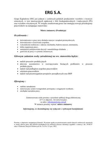 ERG S.A. Grupa Kapitałowa ERG jest jednym z czołowych polskich producentów wyrobów z tworzyw sztucznych, w tym innowacyjnych opakowań z folii biodegradowalnych i tradycyjnych (PE) oraz wyrobów wtryskowych. W związku zrealizowaną przez nas strategią rozwoju poszukujemy pracowników na następujące stanowisko: Mistrz zmianowy (Produkcja) Oczekiwania : doświadczenie w pracy przy obsłudze maszyn i urządzeń przemysłowych, doświadczenie w kierowaniu zespołem, wykształcenie techniczne z zakresu: mechanika, budowa maszyn, automatyka, dobra organizacja pracy , umiejętność podejmowania decyzji i samodzielnego działania , gotowość do pracy w systemie zmianowym. Głównym zadaniem osoby zatrudnionej na ww. stanowisku będzie: nadzór procesów produkcyjnych aktywne uczestnictwo w rozwiązywaniu bieżących problemów produkcyjnym, nadzór nad podległym zespołem pracowników szkolenia pracowników nadzór nad przestrzeganiem przepisów porządkowych oraz BHP w procesie Oferujemy : stabilne zatrudnienie motywacyjny system wynagrodzeń, powiązany z osiąganymi wynikami, niezbędne narzędzia pracy. Zainteresowane osoby prosimy o przesłanie aplikacji drogą elektroniczną (CV ze zdjęciem , list motywacyjny) na adres: [email protected] W temacie prosimy wpisać: mistrz zmianowy Informujemy, że skontaktujemy się wyłącznie z wybranymi kandydatami. Prosimy o dopisanie następującej klauzuli: Wyrażam zgodę na przetwarzanie moich danych osobowych zawartych w mojej ofercie pracy dla potrzeb niezbędnych do realizacji procesu rekrutacji (zgodnie z ustawą z dn. 29.08.97 roku o Ochronie Danych Osobowych Dz. Ust Nr 133 poz. 883)