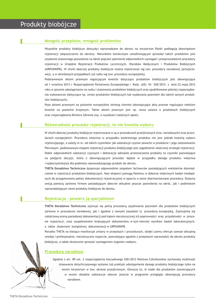 Produkty biobójcze Mnogość przepisów, mnogość problemów Wszystkie produkty biobójcze (biocydy) wprowadzane do obrotu na terytorium Polski podlegają obowiązkowi rejestracji (dopuszczenia do obrotu). Warunkiem koniecznym umożliwiającym sprzedaż takich produktów jest uzyskanie stosownego pozwolenia na obrót poprzez spełnienie odpowiednich wymagań i przeprowadzenie procedury rejestracji w Urzędzie Rejestracji Produktów Leczniczych, Wyrobów Medycznych i Produktów Biobójczych (URPLWMiPB). W chwili obecnej produkty biobójcze można rejestrować wg tzw. procedury narodowej (przejściowej), a w określonych przypadkach już tylko wg tzw. procedury europejskiej. Podstawowym aktem prawnym regulującym kwestie dotyczące produktów biobójczych jest obowiązujące od 1 września 2013 r. Rozporządzenie Parlamentu Europejskiego i Rady (UE) Nr 528/2012 z dnia 22 maja 2012 roku w sprawie udostępniania na rynku i stosowania produktów biobójczych oraz opublikowane później rozporządzenia wykonawcze (dotyczące np. zmian produktów biobójczych lub wydawania pozwoleń dla takich samych produktów biobójczych). Poza aktami prawnymi na poziomie europejskim istnieją również obowiązujące akty prawne regulujące niektóre kwestie na poziomie krajowym. Takim aktem prawnym jest np. nowa ustawa o produktach biobójczych oraz rozporządzenia Ministra Zdrowia (np. o wysokości należnych opłat). Różnorodność procedur rejestracji, to nie kwestia wyboru W chwili obecnej produkty biobójcze rejestrowane w są w procedurach przejściowych (tzw. narodowych) oraz procedurach europejskich. Procedura właściwa w przypadku konkretnego produktu nie jest jednak kwestią wyboru rejestrującego, a zależy m in. od takich czynników jak substancje czynne zawarte w produkcie i jego zastosowanie. Pierwszym, podstawowym etapem rejestracji produktu biobójczego jest uzgodnienie właściwej strategii rejestracji. Dobór odpowiednich substancji czynnych i deklaracja odnośnie przeznaczenia produktu to czynniki pozwalające na podjęcie decyzji, która z obowiązujących procedur będzie w przypadku danego produktu właściwa i najkorzystniejsza dla podmiotu wprowadzającego produkt do obrotu. THETA Doradztwo Techniczne dysponuje odpowiednim zespołem fachowców posiadających wieloletnie doświadczenie w rejestracji produktów biobójczych. Nasi eksperci pomogą Państwu w doborze właściwych badań niezbędnych do przygotowania pełnej dokumentacji rejestracyjnej w oparciu o nowe zharmonizowane procedury. Służymy swoją pomocą zarówno firmom posiadającym obecnie aktualne jeszcze pozwolenia na obrót, jak i podmiotom wprowadzającym nowe produkty biobójcze do obrotu. Rejestracja - powierz ją specjalistom THETA Doradztwo Techniczne zajmuje się pełną procedurą uzyskiwania pozwoleń dla produktów biobójczych zarówno w procedurze narodowej, jak i zgodnie z nowymi zasadami tj. procedurą europejską. Zajmujemy się całościową oceną posiadanej dokumentacji pod kątem merytorycznej ich poprawności oraz przydatności w procesie rejestracji, oraz uzupełnieniem brakujących dokumentów, w tym również wyników badań laboratoryjnych, a także złożeniem kompletnej dokumentacji w URPLWMiPB. Ponadto THETA na bieżąco monitoruje zmiany w przepisach i procedurach, dzięki czemu oferuje zawsze aktualną wiedzę i profesjonalne, merytoryczne wsparcie, pozwalające zgodnie z przepisami wprowadzić do obrotu produkty biobójcze, a także skutecznie sprostać wymaganiom organów nadzoru. Procedura narodowa Zgodnie z art. 89 ust. 2 rozporządzenia biocydowego 528/2012 Państwa Członkowskie zachowały możliwość stosowania dotychczasowego systemu lub praktyki udostępniania danego produktu biobójczego tylko na swoim terytorium w tzw. okresie przejściowym. Oznacza to, iż nadal dla produktów zawierających w swoim składzie substancje obecne jeszcze w programie przeglądu obowiązują procedury narodowe. THETA Doradztwo Techniczne Produkty biobójcze W ramach naszych usług oferujemy (procedura narodowa): Doradztwo bieżące w zakresie doboru substancji czynnych, weryfikację substancji aktywnych i określenie ich statusu w programie przeglądu. Pomoc w wyborze odpowiedniej metodologii badań skuteczności produktu biobójczego, odpowiedniej do określonej grupy produktowej. Przygotowanie wniosku o akceptację nieznormalizowanej metodyki badań skuteczności. Przygotowanie etykiety produktu biobójczego. Pomoc techniczna i merytoryczna przy przeprowadzeniu laboratoryjnych badań skuteczności produktu biobójczego. Ocena merytoryczna i formalna dokumentacji, a w szczególności analiza wyników badań skuteczności pod kątem spełnienia wymagań niezbędnych do otrzymania pozwolenia na obrót produktem biobójczym na terenie RP. Opracowanie karty charakterystyki produktu (MSDS). Skompletowanie, uzupełnienie i złożenie dokumentacji do URPLWMiPB. Reprezentowanie podmiotu odpowiedzialnego przed URPLWMiPB. Monitorowanie przebiegu procesu rejestracji produktu biobójczego. Pomoc w opracowaniu dokumentacji w zakresie zmian w pozwoleniu. Doradztwo dotyczące zachowania zgodności z art. 95 rozporządzenia 528/2012. Odpowiedzi na zapytania i protokoły inspekcji. Doradztwo bieżące w zakresie wprowadzania produktów biobójczych do obrotu. Fachowe tłumaczenia przysięgłe dokumentów rejestracyjnych z większości języków europejskich m.in. z języka angielskiego, niemieckiego, włoskiego, francuskiego, czeskiego, rosyjskiego i innych. Procedura europejska: Rozporządzenie nr 528/2012 zapewnia wdrożenie wymogów prawnych w tym samym czasie i w ujednolicony sposób w całej Unii. Wnioski o uzyskanie pozwolenia na wprowadzenie do obrotu można składać w rożnym czasie w zależności od produktu i jego statusu; inaczej dla produktów już istniejących na rynku (czyli takich, które posiadają obecnie aktualne pozwolenie na obrót), a inaczej dla produktów nowych, które będą wprowadz