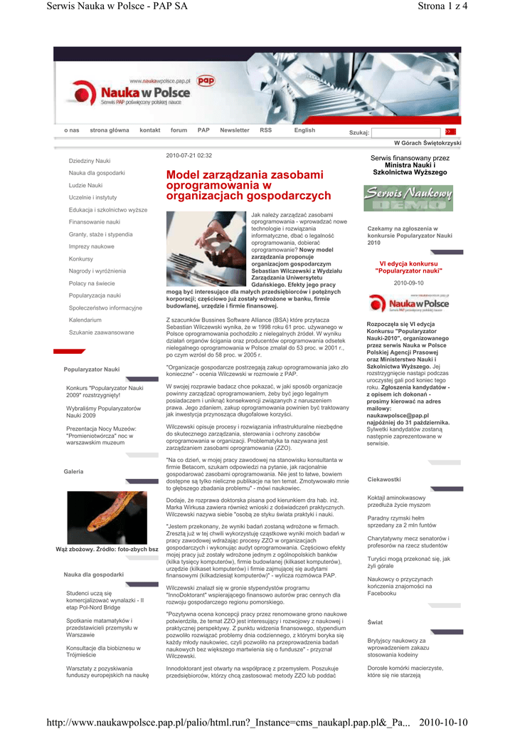 Serwis Nauka w Polsce - PAP SA o nas strona główna kontakt forum Strona 1 z 4 PAP Newsletter RSS English Szukaj: W Górach Świętokrzyskich znaleziono najsta Dziedziny Nauki Nauka dla gospodarki Ludzie Nauki Uczelnie i instytuty Edukacja i szkolnictwo wyższe Finansowanie nauki Granty, staże i stypendia Imprezy naukowe Konkursy Nagrody i wyróżnienia Polacy na świecie Popularyzacja nauki Społeczeństwo informacyjne Kalendarium Szukanie zaawansowane Popularyzator Nauki Konkurs "Popularyzator Nauki 2009" rozstrzygnięty! Wybraliśmy Popularyzatorów Nauki 2009 Prezentacja Nocy Muzeów: "Promieniotwórcza" noc w warszawskim muzeum Galeria 2010-07-21 02:32 Model zarządzania zasobami oprogramowania w organizacjach gospodarczych Jak należy zarządzać zasobami oprogramowania - wprowadzać nowe technologie i rozwiązania informatyczne, dbać o legalność oprogramowania, dobierać oprogramowanie? Nowy model zarządzania proponuje organizacjom gospodarczym Sebastian Wilczewski z Wydziału Zarządzania Uniwersytetu Gdańskiego. Efekty jego pracy mogą być interesujące dla małych przedsiębiorców i potężnych korporacji; częściowo już zostały wdrożone w banku, firmie budowlanej, urzędzie i firmie finansowej. Z szacunków Bussines Software Alliance (BSA) które przytacza Sebastian Wilczewski wynika, że w 1998 roku 61 proc. używanego w Polsce oprogramowania pochodziło z nielegalnych źródeł. W wyniku działań organów ścigania oraz producentów oprogramowania odsetek nielegalnego oprogramowania w Polsce zmalał do 53 proc. w 2001 r., po czym wzrósł do 58 proc. w 2005 r. "Organizacje gospodarcze postrzegają zakup oprogramowania jako zło konieczne" - ocenia Wilczewski w rozmowie z PAP. W swojej rozprawie badacz chce pokazać, w jaki sposób organizacje powinny zarządzać oprogramowaniem, żeby być jego legalnym posiadaczem i uniknąć konsekwencji związanych z naruszeniem prawa. Jego zdaniem, zakup oprogramowania powinien być traktowany jak inwestycja przynosząca długofalowe korzyści. Wilczewski opisuje procesy i rozwiązania infrastrukturalne niezbędne do skutecznego zarządzania, sterowania i ochrony zasobów oprogramowania w organizacji. Problematyka ta nazywana jest zarządzaniem zasobami oprogramowania (ZZO). "Na co dzień, w mojej pracy zawodowej na stanowisku konsultanta w firmie Betacom, szukam odpowiedzi na pytanie, jak racjonalnie gospodarować zasobami oprogramowania. Nie jest to łatwe, bowiem dostępne są tylko nieliczne publikacje na ten temat. Zmotywowało mnie to głębszego zbadania problemu" - mówi naukowiec. Dodaje, że rozprawa doktorska pisana pod kierunkiem dra hab. inż. Marka Wirkusa zawiera również wnioski z doświadczeń praktycznych. Wilczewski nazywa siebie "osobą ze styku świata praktyki i nauki. Wąż zbożowy. Źródło: foto-zbych bsz Nauka dla gospodarki Studenci uczą się komercjalizować wynalazki - II etap Pol-Nord Bridge "Jestem przekonany, że wyniki badań zostaną wdrożone w firmach. Zresztą już w tej chwili wykorzystuję cząstkowe wyniki moich badań w pracy zawodowej wdrażając procesy ZZO w organizacjach gospodarczych i wykonując audyt oprogramowania. Częściowo efekty mojej pracy już zostały wdrożone jednym z ogólnopolskich banków (kilka tysięcy komputerów), firmie budowlanej (kilkaset komputerów), urzędzie (kilkaset komputerów) i firmie zajmującej się audytami finansowymi (kilkadziesiąt komputerów)" - wylicza rozmówca PAP. Wilczewski znalazł się w gronie stypendystów programu "InnoDoktorant" wspierającego finansowo autorów prac cennych dla rozwoju gospodarczego regionu pomorskiego. Konsultacje dla biobiznesu w Trójmieście "Pozytywna ocena koncepcji pracy przez renomowane grono naukowe potwierdziła, że temat ZZO jest interesujący i rozwojowy z naukowej i praktycznej perspektywy. Z punktu widzenia finansowego, stypendium pozwoliło rozwiązać problemy dnia codziennego, z którymi boryka się każdy młody naukowiec, czyli pozwoliło na przeprowadzenia badań naukowych bez większego martwienia się o fundusze" - przyznał Wilczewski. Warsztaty z pozyskiwania funduszy europejskich na naukę Innodoktorant jest otwarty na współpracę z przemysłem. Poszukuje przedsiębiorców, którzy chcą zastosować metody ZZO lub poddać Spotkanie matamatyków i przedstawicieli przemysłu w Warszawie Serwis finansowany przez Ministra Nauki i Szkolnictwa Wyższego Czekamy na zgłoszenia w konkursie Popularyzator Nauki 2010 VI edycja konkursu "Popularyzator nauki" 2010-09-10 Rozpoczęła się VI edycja Konkursu "Popularyzator Nauki-2010", organizowanego przez serwis Nauka w Polsce Polskiej Agencji Prasowej oraz Ministerstwo Nauki i Szkolnictwa Wyższego. Jej rozstrzygnięcie nastąpi podczas uroczystej gali pod koniec tego roku. Zgłoszenia kandydatów z opisem ich dokonań prosimy kierować na adres mailowy: [email protected] najpóźniej do 31 października. Sylwetki kandydatów zostaną następnie zaprezentowane w serwisie. Ciekawostki Koktajl aminokwasowy przedłuża życie myszom Paradny rzymski hełm sprzedany za 2 mln funtów Charytatywny mecz senatorów i profesorów na rzecz studentów Turyści mogą przekonać się, jak żyli górale Naukowcy o przyczynach kończenia znajomości na Facebooku Świat Brytyjscy naukowcy za wprowadzeniem zakazu stosowania kodeiny Dorosłe komórki macierzyste, które się nie starzeją http://www.naukawpolsce.pap.pl/palio/html.run?_Instance=cms_naukapl.pap.pl&_Pa... 2010-10-10 Serwis Nauka w Polsce - PAP SA Tieto Poland rozpoczyna współpracę z Politechniką Wrocławską Nauka dla Europy Strona 2 z 4 audytowi i optymalizacji już funkcjonujące w ich organizacjach systemy, w tym narzędzia, procesy i kompetencje ludzi. "Opracowanie i wdrożenie ZZO ma pozwolić organizacjom w sposób bardziej optymalny: wprowadzać nowe technologie i rozwiązania informatyczne, dobierać oprogramowanie do potrzeb organizacji, racjonalizować całkowite koszty posiadania op