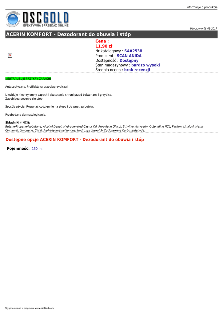 Informacje o produkcie Utworzono 08-03-2017 ACERIN KOMFORT - Dezodorant do obuwia i stóp Cena : 11,90 zł Nr katalogowy : SAA2538 Producent : SCAN ANIDA Dostępność : Dostępny Stan magazynowy : bardzo wysoki Średnia ocena : brak recenzji NEUTRALIZUJE PRZYKRY ZAPACH! Antyseptyczny. Profilaktyka przeciwgrzybicza! Likwiduje nieprzyjemny zapach i skutecznie chroni przed bakteriami i grzybicą. Zapobiega poceniu się stóp. Sposób użycia: Rozpylać codziennie na stopy i do wnętrza butów. Przebadany dermatologicznie. Składniki (INCI): Butane/Propane/Isobutane, Alcohol Denat, Hydrogenated Castor Oil, Propylene Glycol, Ethylhexylglycerin, Octenidine HCL, Parfum, Linalool, Hexyl Cinnamal, Limonene, Citral, Alpha-Isomethyl Ionone, Hydroxyisohexyl 3- Cyclohexene Carboxaldehyde. Dostępne opcje ACERIN KOMFORT - Dezodorant do obuwia i stóp Pojemność: 150 ml. Wygenerowano w programie www.oscGold.com