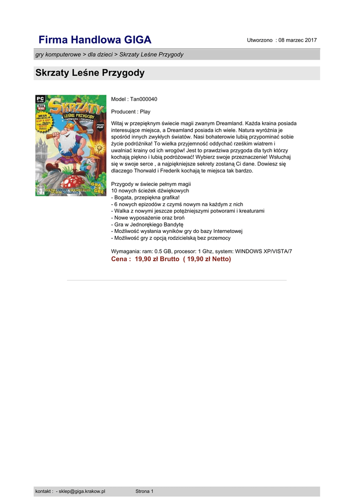 Firma Handlowa GIGA Utworzono : 08 marzec 2017 gry komputerowe > dla dzieci > Skrzaty Leśne Przygody Skrzaty Leśne Przygody Model : Tan000040 Producent : Play Witaj w przepięknym świecie magii zwanym Dreamland. Każda kraina posiada interesujące miejsca, a Dreamland posiada ich wiele. Natura wyróżnia je spośród innych zwykłych światów. Nasi bohaterowie lubią przypominać sobie życie podróżnika! To wielka przyjemność oddychać rześkim wiatrem i uwalniać krainy od ich wrogów! Jest to prawdziwa przygoda dla tych którzy kochają piękno i lubią podróżować! Wybierz swoje przeznaczenie! Wsłuchaj się w swoje serce , a najpiękniejsze sekrety zostaną Ci dane. Dowiesz się dlaczego Thorwald i Frederik kochają te miejsca tak bardzo. Przygody w świecie pełnym magii 10 nowych ścieżek dźwiękowych - Bogata, przepiękna grafika! - 6 nowych epizodów z czymś nowym na każdym z nich - Walka z nowymi jeszcze potężniejszymi potworami i kreaturami - Nowe wyposażenie oraz broń - Gra w Jednorękiego Bandytę - Możliwość wysłania wyników gry do bazy Internetowej - Możliwość gry z opcją rodzicielską bez przemocy Wymagania: ram: 0.5 GB, procesor: 1 Ghz, system: WINDOWS XP/VISTA/7 Cena : 19,90 zł Brutto ( 19,90 zł Netto) kontakt : - [email protected] Strona 1