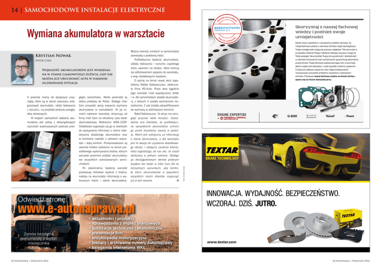 Wymiana akumulatora w warsztacie Inter Cars Większość akumulatorów jest wymieniana w stanie całkowitego zużycia, gdy nie można już uruchomić auta w najmniej oczekiwanej sytuacji A przecież mamy do dyspozycji przyrządy, które są w stanie zawczasu zdiagnozować akumulator, układ ładowania i rozruchu, na przykład podczas przeglądów okresowych. W krajach zachodnich badanie akumulatora jest jedną z obowiązkowych czynności wykonywanych podczas prze- glądu samochodu. Warto przenieść tę dobrą praktykę do Polski. Dlatego Inter Cars prowadzi akcję wsparcia wymiany akumulatora w warsztatach. W jej ramach wybrane warsztaty otrzymują od firmy Inter Cars na określony czas tester akumulatorowy Midtronics MDX-335P. Dodatkowo wyposaża się go w zawieszki do wpisywania informacji o stanie naładowania zbadanego akumulatora oraz w kontrolne naklejki z adresem warsztatu i datą kontroli. Przeprowadzane są również krótkie szkolenia na temat prawidłowego wykonywania testów, którym warsztat powinien poddać akumulatory we wszystkich serwisowanych samochodach. Po zakończeniu badania warsztat przekazuje klientowi wydruk z testera, nakleja na akumulator informację o wykonanym teście i stanie akumulatora. FRANKFURT 2016 Ha Zamów bezpłatną prenumeratę e-wydań miesięcznika Autonaprawa Autonaprawa | Wrzesień 2016 .0, stois ko D5 2 Każdy nowo napotkany i rozwiązany problem sprawia, że Twoja fachowa wiedza w zakresie silników staje się bogatsza. Twoje umiejętności stają się szersze i głębsze. Tak samo jak w przypadku Federal-Mogul. Właśnie dlatego wszyscy mogą na Tobie polegać. Na przykład Twoja skrupulatność i dokładność w zakresie honowania tulei cylindrowych gwarantują optymalną pracę silnika. Twoja fachowa wiedza pomaga nam zrozumieć, jakich części potrzebujesz i w jaki sposób możemy zapewnić Ci jeszcze większe wsparcie, byś mógł profesjonalnie rozwiązywać wszystkie problemy związane z naprawami silników. Ponieważ nasza fachowa wiedza na temat silnika… opiera się na Twoim doświadczeniu. INNOWACJA. INNOWACJA. WYDAJNOŚĆ. WYDAJNOŚĆ.BEZPIECZEŃSTWO. BEZPIECZEŃSTWO. DZIŚ. WYDAJNOŚĆ. WCZORAJ. BEZPIECZEŃSTWO. WCZORAJ. DZIŚ.JUTRO. JUTRO. INNOWACJA. www.e-autonaprawa.pl WCZORAJ. DZIŚ. JUTRO. Odwiedź stronę: la 3 Skorzystaj z naszej fachowej wiedzy i podnieś swoje umiejętności Fot. Inter Cars Krystian Nowak Można również umieścić w samochodzie zawieszkę o podobnej treści. Profilaktyczne badanie akumulatora, układu ładowania i rozruchu zapobiega wielu awariom na drodze, które kończą się odholowaniem pojazdu do warsztatu, a więc dodatkowymi kosztami. O opinię na temat nowej akcji zapytaliśmy Rafała Sobieszczuka, właściciela firmy RS-Auto. Przez dwa tygodnie jego warsztat miał wypożyczony tester i w 36 samochodach zbadał akumulatory, z których 4 zostały wymienione niezwłocznie, 2 zaś zostały zakwalifikowane do wymiany w późniejszym terminie. Rafał Sobieszczuk: Ta akcja ma sens, gdyż przynosi wiele korzyści. Uświadamia ona klientowi, że profilaktyczne sprawdzenie akumulatora uchroni go przed kosztowna awarią w podróży. Klient jest wdzięczny za informację o stanie akumulatora, a dla warsztatu jest to okazja do uzyskania dodatkowego obrotu i zdobycia zaufania klienta, który wyjeżdżając od nas wie, że został obsłużony w pełnym zakresie. Dlatego po dwutygodniowym okresie próbnym kupiłem ten tester w Inter Cars SA na korzystnych warunkach, aby kontrolę stanu akumulatorów w pojazdach wszystkich moich klientów rozpocząć już w tym sezonie. n ź nas na targ ied ac dw h O 14 | SAMOCHODOWE INSTALACJE ELEKTRYCZNE • aktualności i produkty • sprawozdania z imprez branżowych • publikacje techniczne i ekonomiczne • prezentacje firm • encyklopedia motoryzacyjna www.textar.com • bieżący i archiwalne numery Autonaprawy • księgarnia internetowa WKŁ www.textar.com INNOWACJA.WYDAJNOŚĆ. WYDAJNOŚĆ.BEZPIECZEŃSTWO. BEZPIECZEŃSTWO. www.textar.com INNOWACJA. WCZORAJ.DZIŚ. DZIŚ.JUTRO. JUTRO. WCZORAJ. www.textar.com www.textar.com Autonaprawa | Wrzesień 2016