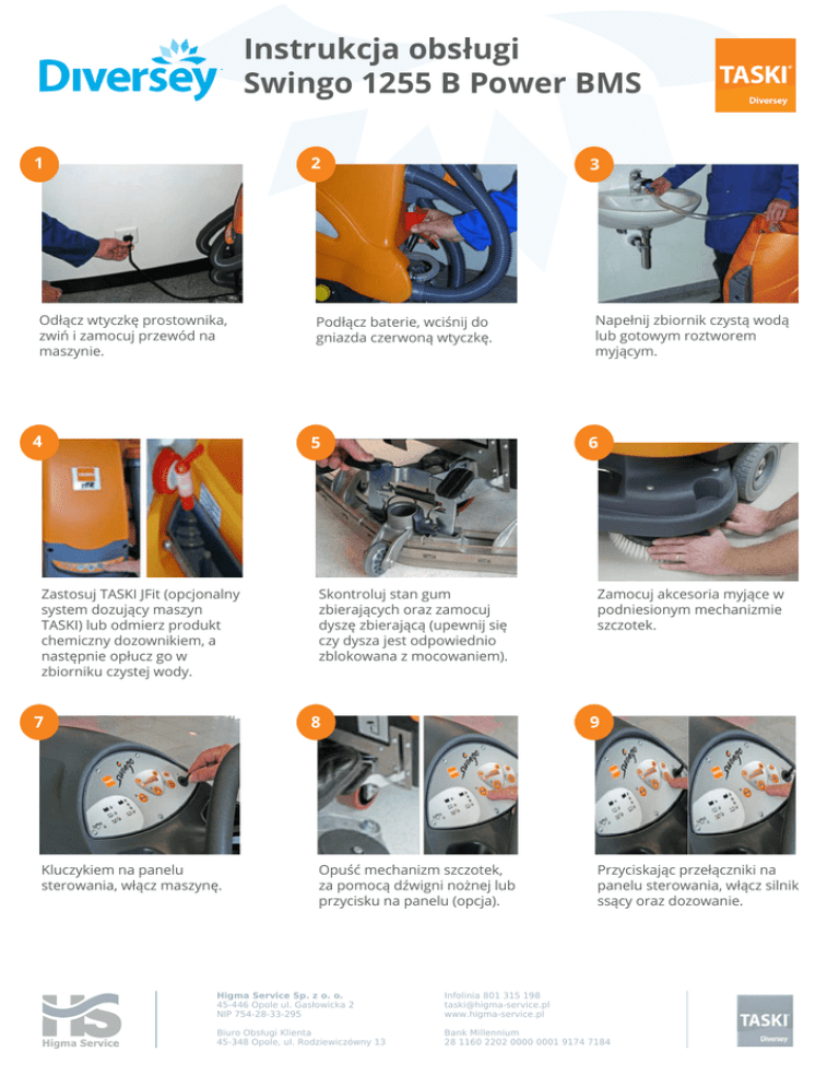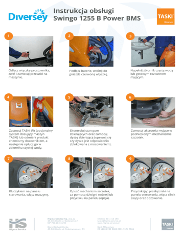 Instrukcja obsługi Swingo 1255 B Power BMS 1 2 Odłącz wtyczkę prostownika, zwiń i zamocuj przewód na maszynie. 4 TASKI Diversey 3 Podłącz baterie, wciśnij do gniazda czerwoną wtyczkę. Napełnij zbiornik czystą wodą lub gotowym roztworem myjącym. Oferta wynajmu maszyny TASKI Swingo 455B BMS dla FHU 5 6 VIGOR Oferta numer TSK0180714 z dnia 29-07-2014 Zastosuj TASKI TASKI JFit JFit (opcjonalny (opcjonalny Zastosuj system dozujący maszyn system dozujący maszyn TASKI) lub lub odmierz odmierz produkt produkt TASKI) chemiczny dozownikiem, chemiczny dozownikiem, a anastępnie następnieopłucz opłuczgogoww zbiorniku czystej wody. zbiorniku czystej wody. 7 Skontroluj stan stan gum gum Skontroluj zbierających oraz zamocuj zbierających oraz zamocuj dyszę zbierającą (upewnij się dyszę zbierającą (upewnij się czy dysza jest odpowiednio czy dysza jest odpowiednio zblokowana zz mocowaniem). mocowaniem). zblokowana 8 Kluczykiem na na panelu panelu Kluczykiem sterowania, włącz włącz maszynę. maszynę. sterowania, Zamocuj akcesoria akcesoria myjące myjące w w Zamocuj podniesionym mechanizmie podniesionym mechanizmie szczotek. szczotek. 9 Opuść mechanizm mechanizm szczotek, szczotek, Opuść za pomocą pomocą dźwigni dźwigni nożnej nożnej lub lub za przycisku na na panelu panelu (opcja). (opcja). przycisku Przyciskając przełączniki przełączniki na na Przyciskając panelu sterowania, sterowania, włącz włącz silnik silnik panelu ssący oraz oraz dozowanie. dozowanie. ssący Higma Service Sp. z o. o. 45-446 Opole ul. Gasłowicka 2 NIP 754-28-33-295 Infolinia 801 315 198 [email protected] www.higma-service.pl Biuro Obsługi Klienta 45-348 Opole, ul. Rodziewiczówny 13 Bank Millennium 28 1160 2202 0000 0001 9174 7184 Instrukcja obsługi Swingo 1255 B Power BMS 10 11 13 Diversey 12 Opuść dyszę zbierającą za pomocą dźwigni nożnej. Ustaw ilość dozowania roztworu (dźwignią lub przyciskami na panelu w zależności od modelu maszyny). TASKI Umyj powierzchnię. Oferta wynajmu maszyny TASKI Swingo 455B BMS dla FHU 14 15 VIGOR Oferta numer TSK0180714 z dnia 29-07-2014 Kluczykiem na panelu sterowania, wyłącz maszynę. 16 Opróżnij zbiornik wody i wypłucz go. Opróżnij zbiornik z roztworem i także gogo wypłucz. z roztworem i także wypłucz. 17 Opłucz zestaw filtra I pływaka pod bieżącą wodą. Zdejmij filtr w komplecie z pływakiem, przekręcając żółtą obudowę filtra, przeciwnie do wskazówek zegara. 18 Oczyść filtr roztworu roboczego. Zdejmij akcesoria, oczyść i pozostaw do wyschnięcia. Higma Service Sp. z o. o. 45-446 Opole ul. Gasłowicka 2 NIP 754-28-33-295 Infolinia 801 315 198 [email protected] www.higma-service.pl Biuro Obsługi Klienta 45-348 Opole, ul. Rodziewiczówny 13 Bank Millennium 28 1160 2202 0000 0001 9174 7184 swingo 755 E Instrukcja obsługi Swingo 1255 B Power BMS 19 20 1. Upewnij się, że urządzenie jest odłączone od zasilania! Sprawdź czy kabel nie jest uszkodzony, jeżeli jest uszkodzony nie wolno używać maszyny!!! 2. Napełnij zbiornik czystą wodą. Zdejmij i oczyść dyszę zbierającą. 6. Podłącz maszynę do zasilania. 22 Diversey 21 3. Korzystając z dozownika odmierz i wlej do zbiornika czystej wody, właściwą ilość środka chemicznego. 4. Zamontuj ssawę. 8. Opuść mechanizm szczotki za pomocą dźwigni nożnej. 5. Zamocuj akcesoria: szczotkę lub tarczę z padem. Rozłącz baterie. Miękką ścierką oczyść maszynę. 7. Włącz maszynę. TASKI 9. Włącz silnik ssący oraz dozowanie roztworu myjącego (naciśnij pomarańczowe przyciski). 10. Ustaw dozowanie roztworu myjącego (za pomocą niebieskiej dźwigni). Oferta wynajmu maszyny TASKI Swingo 455B BMS dla FHU 20 21 VIGOR Oferta numer TSK0180714 z dnia 29-07-2014 11. Opuść ssawę przy pomocy dźwigni ssawy. 12. Umyj powierzchnię. Podłącz wtyczkę wtyczkę prostownika prostownika Podłącz do zasilania. do zasilania. 16. Oczyść pływak pod bieżącą wodą i zamontuj z powrotem do maszyny. 17. Oczyść filtr roztworu roboczego i włóż go z powrotem do maszyny. 21. Odwróć dozownik. 22. Przechowuj maszynę z lekko otwartą pokrywą (pokrywa oparta na odwróconym dozowniku) dla lepszej wentylacji. 13. Wyłącz maszynę i odłącz od zasilania. 14. Opróżnij zbiornik brudnej wody, następnie go opłucz. Opróżnij zbiornik wody czystej i także go opłucz. Odwróć Odwróć dozownik. dozownik. 15. Zdejmij pływak. Pozostaw uchyloną uchyloną pokrywę pokrywę Pozostaw maszyny (pokrywa spoczywa maszyny (pokrywa spoczywa na dozowniku). dozowniku). na 18. Zdejmij akcesoria, umyj je i wysusz. 19. Zdejmij i wyczyść ssawę. 20. Miękką ścierką przetrzyj maszynę. Uwaga! Urządzenie można eksploatować tylko po dokładnym przeczytaniu i zrozumieniu instrukcji obsługi. Diversey Polska Sp. z o.o., ul. Fabryczna 5, 00-446 Warszawa, tel. (22) 328 10 00, fax. (22) 328 10 01 Serwis Techniczny Diversey Polska SP. z o.o.: tel. (22) 328 10 12, fax: (22) 731 40 92 Higma Service Sp. z o. o. 45-446 Opole ul. Gasłowicka 2 NIP 754-28-33-295 Infolinia 801 315 198 [email protected] www.higma-service.pl Biuro Obsługi Klienta 45-348 Opole, ul. Rodziewiczówny 13 Bank Millennium 28 1160 2202 0000 0001 9174 7184