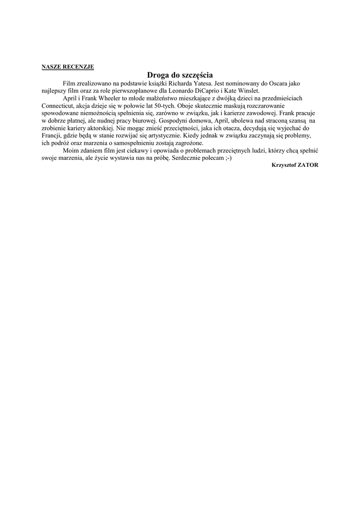 NASZE RECENZJE Droga do szczęścia Film zrealizowano na podstawie ksiąŜki Richarda Yatesa. Jest nominowany do Oscara jako najlepszy film oraz za role pierwszoplanowe dla Leonardo DiCaprio i Kate Winslet. April i Frank Wheeler to młode małŜeństwo mieszkające z dwójką dzieci na przedmieściach Connecticut, akcja dzieje się w połowie lat 50-tych. Oboje skutecznie maskują rozczarowanie spowodowane niemoŜnością spełnienia się, zarówno w związku, jak i karierze zawodowej. Frank pracuje w dobrze płatnej, ale nudnej pracy biurowej. Gospodyni domowa, April, ubolewa nad straconą szansą na zrobienie kariery aktorskiej. Nie mogąc znieść przeciętności, jaka ich otacza, decydują się wyjechać do Francji, gdzie będą w stanie rozwijać się artystycznie. Kiedy jednak w związku zaczynają się problemy, ich podróŜ oraz marzenia o samospełnieniu zostają zagroŜone. Moim zdaniem film jest ciekawy i opowiada o problemach przeciętnych ludzi, którzy chcą spełnić swoje marzenia, ale Ŝycie wystawia nas na próbę. Serdecznie polecam ;-) Krzysztof ZATOR
