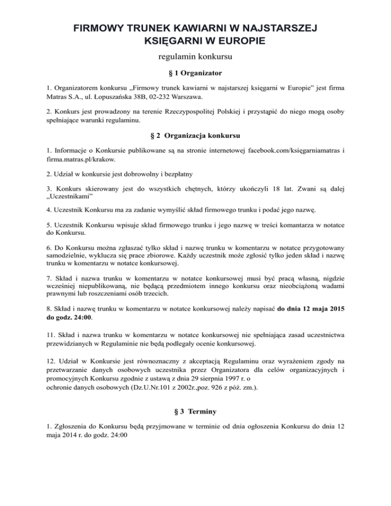 FIRMOWY TRUNEK KAWIARNI W NAJSTARSZEJ KSIĘGARNI W EUROPIE regulamin konkursu § 1 Organizator 1. Organizatorem konkursu „Firmowy trunek kawiarni w najstarszej księgarni w Europie” jest firma Matras S.A., ul. Łopuszańska 38B, 02-232 Warszawa. 2. Konkurs jest prowadzony na terenie Rzeczypospolitej Polskiej i przystąpić do niego mogą osoby spełniające warunki regulaminu. § 2 Organizacja konkursu 1. Informacje o Konkursie publikowane są na stronie internetowej facebook.com/księgarniamatras i firma.matras.pl/krakow. 2. Udział w konkursie jest dobrowolny i bezpłatny 3. Konkurs skierowany jest do wszystkich chętnych, którzy ukończyli 18 lat. Zwani są dalej „Uczestnikami” 4. Uczestnik Konkursu ma za zadanie wymyślić skład firmowego trunku i podać jego nazwę. 5. Uczestnik Konkursu wpisuje skład firmowego trunku i jego nazwę w treści komantarza w notatce do Konkursu. 6. Do Konkursu można zgłaszać tylko skład i nazwę trunku w komentarzu w notatce przygotowany samodzielnie, wyklucza się prace zbiorowe. Każdy uczestnik może zgłosić tylko jeden skład i nazwę trunku w komentarzu w notatce konkursowej. 7. Skład i nazwa trunku w komentarzu w notatce konkursowej musi być pracą własną, nigdzie wcześniej niepublikowaną, nie będącą przedmiotem innego konkursu oraz nieobciążoną wadami prawnymi lub roszczeniami osób trzecich. 8. Skład i nazwę trunku w komentarzu w notatce konkursowej należy napisać do dnia 12 maja 2015 do godz. 24:00. 11. Skład i nazwa trunku w komentarzu w notatce konkursowej nie spełniająca zasad uczestnictwa przewidzianych w Regulaminie nie będą podlegały ocenie konkursowej. 12. Udział w Konkursie jest równoznaczny z akceptacją Regulaminu oraz wyrażeniem zgody na przetwarzanie danych osobowych uczestnika przez Organizatora dla celów organizacyjnych i promocyjnych Konkursu zgodnie z ustawą z dnia 29 sierpnia 1997 r. o ochronie danych osobowych (Dz.U.Nr.101 z 2002r.,poz. 926 z póź. zm.). § 3 Terminy 1. Zgłoszenia do Konkursu będą przyjmowane w terminie od dnia ogłoszenia Konkursu do dnia 12 maja 2014 r. do godz. 24:00 FIRMOWY TRUNEK KAWIARNI W NAJSTARSZEJ KSIĘGARNI W EUROPIE regulamin konkursu 2. Nazwiska Laureatów zostaną opublikowane nie później niż w dniu 13 maja 2015 r. jako treść komentarza w notatce do konkursu Organizatora. 3. O rozstrzygnięciu Konkursu przedstawiciele ustawowi Laureatów zostanie powiadomiony za pośrednictwem wiadomości Facebook. § 4 Ocena 1. Skład i nazwa trunku w komentarzu w notatce konkursowej będzie oceniana przez Komisję Konkursową powołaną przez Organizatora. 2. Zadaniem Komisji Konkursowej jest ocena składu i nazwa trunku w komentarzu w notatce konkursowej oraz wyłonienie wśród Uczestników 3 Laureatów. 3. Decyzje Komisji Konkursowej są ostateczne. § 5 Nagrody 1. Organizator przyzna 3 Laureatom Konkursu wyłonionych przez Komisję Konkursową nagrody: I miejsce, II miejsce, III miejsce. Laureat I miejsca otrzyma Złotą Kartę Stałego Klienta Matras S.A. oraz książkę „Mit Galicji” wyd. MCK , II miejsca książkę „Książka o niczym”, Jon D. Barrow, wyd. Copernicus Center , III miejsca 3 notesy wyd. Austeria. 2. Nagrody zostaną przesłane pocztą zwykłą. O terminie wysłania nagród laureat zostanie poinformowany wiadomością na Facebooku. § 6 Prawa Autorskie 1. Twórcą składu i nazwy trunku w komentarzu w notatce konkursowej, w rozumieniu ustawy z dnia 4 lutego 1994 r. o prawie autorskim i prawach pokrewnych (Dz. U. z 2006 r. Nr 90, poz. 631 z późn. zm.) może być tylko Uczestnik. 2. Przeniesienie autorskich praw majątkowych na określonych polach eksploatacji oraz prawa zezwalania na wykonywanie zależnego prawa autorskiego do skład i nazwy trunku w komentarzu w notatce konkursowej zostało uregulowane w Załączniku nr 2 do Regulaminu Konkursu. 3. Zgłoszenie do Konkursu jest równoznaczne z nieodpłatnym przeniesieniem na Organizatora składu i nazwy trunku w komentarzu w notatce konkursowej. FIRMOWY TRUNEK KAWIARNI W NAJSTARSZEJ KSIĘGARNI W EUROPIE regulamin konkursu § 7 Postanowienia Końcowe 1. Konkurs nie jest „grą losową” w rozumieniu ustawy z 19 listopada 2009 r. o grach hazardowych (Dz. U. Nr 201, poz. 1540 z późn. zm.) 2. Organizator zastrzega sobie prawo do odwołania lub przesunięcia terminów Konkursu oraz zastrzega sobie prawo zmiany Regulaminu Konkursu. Informacja o ewentualnych zmianach zostanie zamieszczona na Facebook/Ksiegarniamatras 3. W sprawach nieuregulowanych w Regulaminie Konkursu decyduje Organizator. Od decyzji Organizatora nie przysługuje odwołanie.