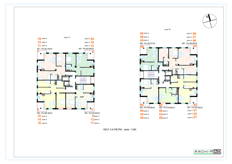 N część "B" 19 15 11 pietro 6 część "A" pietro 5 pietro 4 55 pietro 6 50 pietro 5 45 pietro 4 20 pietro 5 16 pietro 4 12 pietro 6 56 pietro 5 51 pietro 4 46 pietro 6 M9 - Pu=99,26m2 M8 - Pu=43,51m2 41 40 M2 - Pu=62,88m2 M1 - Pu=81,42m2 7 HP 8 HP 6 5 M3 - Pu=86,39m2 10 14 18 pietro 4 pietro 5 pietro 6 M4 - Pu=63,93m2 9 pietro 4 13 pietro 5 17 pietro 6 RZUT 3-6 PIĘTRA skala 1:200 44 43 M5 - Pu=45,89m2 M6 - Pu=34,94m2 M7 - Pu=67,62m2 49 pietro 4 54 pietro 5 59 pietro 6 48 pietro 4 53 pietro 5 58 pietro 6 pietro 4 42 47 52 pietro 6 57 pietro 5