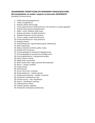 ZAGADNIENIA TEMATYCZNE DO ROZMOWY KWALIFIKACYJNEJ dla kandydatów na studia I stopnia na kierunku GEOGRAFIA (kandydaci ze starą maturą) 1. Źródła informacji geograficznej. 2. Tabela stratygraficzna. 3. Budowa Układu Słonecznego. 4. Teorie: geocentryczna i heliocentryczna i ich znaczenie w rozwoju geografii. 5. Rodzaje odwzorowań kartograficznych. 6. Mapa – cechy i składniki, skala mapy. 7. Budowa atmosfery i jej skład chemiczny. 8. Rozkład temperatur na kuli ziemskiej. 9. Chmury, opady i osady atmosferyczne. 10. Fronty atmosferyczne i masy powietrza. 11. Rodzaje wiatrów. 12. Strefy klimatyczne i typy klimatów (wg W. Okołowicza). 13. Efekt cieplarniany. 14. Wpływ człowieka na klimat, glebę i wodę. 15. Rodzaje skał i ich geneza. 16. Procesy geologiczne zewnętrzne (egzogeniczne). 17. Procesy geologiczne wewnętrzne (endogeniczne). 18. Procesy glebotwórcze. Typy genetyczne gleb. 19. Piętra roślinne a klimat. 20. Obieg wody w przyrodzie. 21. Bilans wodny Ziemi i jego znaczenie dla środowiska. 22. Morza – rodzaje i wielkość. 23. Prądy morskie. 24. Wszechocean. 25. Fauna i flora mórz i oceanów. 26. Wody podziemne – rodzaje i geneza. 27. Wody powierzchniowe – rodzaje i znaczenie. 28. Działalność rzeźbotwórcza rzek. 29. Ustroje rzeczne – typy i klasyfikacja. 30. Jeziora – klasyfikacja i ewolucja. 31. Zlodowacenia w Polsce. 32. Lodowce górskie i lądolody. 33. Działalność rzeźbotwórcza lodowców.