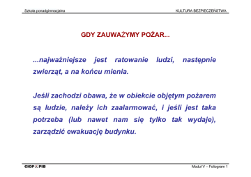 Szkoła ponadgimnazjalna KULTURA BEZPIECZEŃSTWA GDY ZAUWAŻYMY POŻAR... ...najważniejsze jest ratowanie ludzi, następnie zwierząt, a na końcu mienia. Jeśli zachodzi obawa, że w obiekcie objętym pożarem są ludzie, należy ich zaalarmować, i jeśli jest taka potrzeba (lub nawet nam się tylko tak wydaje), zarządzić ewakuację budynku. Moduł V – Foliogram 1 Szkoła ponadgimnazjalna KULTURA BEZPIECZEŃSTWA OBOWIĄZEK ALARMOWANIA O POŻARZE "Kto zauważy pożar, klęskę żywiołową lub inne miejscowe zagrożenie, obowiązany jest niezwłocznie zawiadomić osoby znajdujące się w strefie zagrożenia oraz jednostkę ochrony przeciwpożarowej bądź policję lub wójta albo sołtysa" (Art. 9. Ustawy z dnia 24 sierpnia 1991 r. o ochronie przeciwpożarowej) Moduł V – Foliogram 2 Szkoła ponadgimnazjalna KULTURA BEZPIECZEŃSTWA NUMERY TELEFONÓW SŁUŻB RATOWNICZYCH Z telefonów stacjonarnych - połączenie bezpłatne Straż Pożarna tel. 998 Pogotowie Ratunkowe tel. 999 Policja tel. 997 W niektórych rejonach kraju działają Centra Powiadamiania Ratunkowego skupiające dyspozytorów wszystkich służb ratowniczych. Można się z nimi połączyć dzwoniąc pod każdy z powyższych numerów. W sieciach komórkowych tel. 112 - wszystkie służby ratownicze (w większości aparatów połączenie nie wymaga karty aktywacyjnej ani kodu PIN) CB-radio kanał 9 (wszystkie służby) na hasło "RATUNEK" pierwszeństwo rozmów na wszystkich kanałach !!! Moduł V – Foliogram 3 Szkoła ponadgimnazjalna KULTURA BEZPIECZEŃSTWA WZYWANIE SŁUŻB RATOWNICZYCH Uwaga !!! Nie musisz szukać budki telefonicznej Straż pożarną, pogotowie ratunkowe, policję możesz wezwać z każdego dostępnego aparatu telefonicznego. Moduł V – Foliogram 4 Szkoła ponadgimnazjalna KULTURA BEZPIECZEŃSTWA SKŁADANIE MELDUNKU DO SŁUŻB RATOWNICZYCH • W trakcie wzywania pomocy mów spokojnie i wyraźnie. • Podaj swoje imię i nazwisko. • Powiedz, skąd dzwonisz (nr telefonu, automat telefoniczny itp.). • Określ miejsce, rodzaj i rozmiar zagrożenia. • Powiedz, czy zagrożeni są ludzie. • Nie rozłączaj się pierwszy, odpowiedz na wszystkie pytania dyspozytora. Poczekaj na potwierdzenie zgłoszenia. Moduł V – Foliogram 5 Szkoła ponadgimnazjalna KULTURA BEZPIECZEŃSTWA ZAWIADOMIENIE OSÓB ZNAJDUJĄCYCH SIĘ W STREFIE ZAGROŻENIA W strefie zagrożenia mogą znajdować się ludzie nieświadomi niebezpieczeństwa. Musisz ich zawiadomić o grożącym im niebezpieczeństwie (głosem, syreną alarmową, dzwonkiem). Sprawdź, czy w zagrożonych pomieszczeniach ktoś nie pozostał. Uważaj przy otwieraniu drzwi, gdyż wylatujące z nagrzanych pomieszczeń ogień i gorące gazy pożarowe mogą spowodować oparzenia i zapalenie odzieży. Moduł V – Foliogram 6 Szkoła ponadgimnazjalna KULTURA BEZPIECZEŃSTWA EWAKUACJA ...jest zorganizowanym działaniem zmierzającym do usunięcia ludzi i mienia ze strefy zagrożonej pożarem lub wybuchem. Akcję ewakuacji ludzi podejmuje się z chwilą, gdy zaistniały pożar lub zagrożenie wybuchem może stwarzać dla nich niebezpieczeństwo. W obiektach użyteczności publicznej (a takimi są szkoły) obowiązek rozpoczęcia ewakuacji spoczywa na pracownikach danego obiektu. Moduł V – Foliogram 7 Szkoła ponadgimnazjalna KULTURA BEZPIECZEŃSTWA ZACHOWANIE PODCZAS EWAKUACJI • Przed opuszczeniem pomieszczenia wyłącz urządzenia wentylacyjne i elektryczne. • Opuść obszar zagrożony oznakowaną drogą ewakuacyjną. • Nie używaj windy. • W przypadku zadymienia pomieszczeń poruszaj się jak najbliżej podłogi („na czworakach”) – jest tam chłodniejsze powietrze i mniej dymu. • Po opuszczeniu budynku udaj się na wyznaczone miejsce ewakuacji. Zgromadzenie tam wszystkich uczniów pozwoli ustalić, czy w budynku szkoły nikt nie pozostał. Moduł V – Foliogram 8 Szkoła ponadgimnazjalna KULTURA BEZPIECZEŃSTWA ZNAKI EWAKUACYJNE Kierunek drogi ewakuacyjnej Drzwi ewakuacyjne Kierunek do wyjścia drogi ewakuacyjnej Kierunek do wyjścia drogi ewakuacyjnej schodami w górę Kierunek do wyjścia drogi ewakuacyjnej schodami w dół Moduł V – Foliogram 9 Szkoła ponadgimnazjalna KULTURA BEZPIECZEŃSTWA EWAKUACJA MIENIA W wielu obiektach objętych lub zagrożonych pożarem znajduje się mienie o dużej wartości i ważne dokumenty. Nie są one jednak tak ważne jak ludzkie życie i zdrowie. Zawsze najważniejsze jest ratowanie życia i zdrowia ludzi !!! Moduł V – Foliogram 10 Szkoła ponadgimnazjalna KULTURA BEZPIECZEŃSTWA WARUNKI POWSTANIA POŻARU Do wystąpienia pożaru niezbędne są wszystkie trzy czynniki jednocześnie. Już wyeliminowanie jednego z nich spowoduje ugaszenie pożaru. CIEPŁO POŻAR PALIWO TLEN Moduł V – Foliogram 11 Szkoła ponadgimnazjalna KULTURA BEZPIECZEŃSTWA GASZENIE POŻARÓW Do gaszenia pożarów o niewielkich rozmiarach można przystąpić wyłącznie wtedy, gdy nie będzie to stanowiło zagrożenia własnego życia i zdrowia. Do gaszenia najlepsze i najwygodniejsze w użyciu są gaśnice. Mają one na swojej obudowie wyraźne i duże oznaczenia literowe świadczące gaszenia o tym, jakiego do rodzaju pożaru są przeznaczone. Moduł V – Foliogram 12 Szkoła ponadgimnazjalna KULTURA BEZPIECZEŃSTWA PODZIAŁ POŻARÓW W ZALEŻNOŚCI OD RODZAJU PALĄCEGO SIĘ MATERIAŁU Pożary ciał stałych pochodzenia organicznego, przy spalaniu których występuje zjawisko żarzenia (drewno, papier itp.) Do gaszenia używamy: wody, gaśniczego, dwutlenku węgla piany gaśniczej, proszku Pożary cieczy palnych i substancji stałych topniejących wskutek ciepła (benzyna, rozpuszczalniki, smoła, topiące się tworzywa sztuczne) Do gaszenia używamy: piany gaśniczej, proszku gaśniczego, dwutlenku węgla Pożary gazów palnych (gaz miejski i ziemny, acetylen, propanbutan) Do gaszenia używamy: proszku gaśniczego, dwutlenku węgla E - pożary z grup ABC występujące w obrębie urządzeń pod napięciem. Moduł V – Foliogra