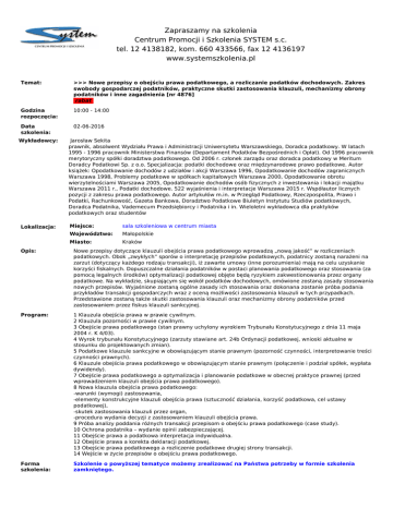 Zapraszamy na szkolenia Centrum Promocji i Szkolenia SYSTEM s.c. tel. 12 4138182, kom. 660 433566, fax 12 4136197 www.systemszkolenia.pl Temat: >>> Nowe przepisy o obejściu prawa podatkowego, a rozliczanie podatków dochodowych. Zakres swobody gospodarczej podatników, praktyczne skutki zastosowania klauzuli, mechanizmy obrony podatników i inne zagadnienia [nr 4876] rabat Godzina rozpoczęcia: 10:00 - 14:00 Data szkolenia: 02-06-2016 Wykładowcy: Lokalizacja: Jarosław JarosławSekita Sekita prawnik, prawnik,absolwent absolwentWydziału WydziałuPrawa Prawai iAdministracji AdministracjiUniwersytetu UniwersytetuWarszawskiego, Warszawskiego,Doradca Doradcapodatkowy. podatkowy.WWlatach latach 1995 1995- -1996 1996pracownik pracownikMinisterstwa MinisterstwaFinansów Finansów(Departament (DepartamentPodatków PodatkówBezpośrednich Bezpośrednichi iOpłat). Opłat).Od Od1996 1996pracownik pracownik merytoryczny merytorycznyspółki spółkidoradztwa doradztwapodatkowego. podatkowego.Od Od2006 2006r.r.członek członekzarządu zarząduoraz orazdoradca doradcapodatkowy podatkowywwMeritum Meritum Doradcy DoradcyPodatkowi PodatkowiSp. Sp.zzo.o. o.o.Specjalizacja: Specjalizacja:podatki podatkidochodowe dochodoweoraz orazmiędzynarodowe międzynarodoweprawo prawopodatkowe. podatkowe.Autor Autor książek: książek:Opodatkowanie Opodatkowaniedochodów dochodówzzudziałów udziałówi iakcji akcjiWarszawa Warszawa1996, 1996,Opodatkowanie Opodatkowaniedochodów dochodówzagranicznych zagranicznych Warszawa Warszawa1998, 1998,Problemy Problemypodatkowe podatkowewwspółkach spółkachkapitałowych kapitałowychWarszawa Warszawa2000, 2000,Opodatkowanie Opodatkowanieobrotu obrotu wierzytelnościami wierzytelnościamiWarszawa Warszawa2005, 2005,Opodatkowanie Opodatkowaniedochodów dochodówosób osóbfizycznych fizycznychzzinwestowania inwestowaniai ilokacji lokacjimajątku majątku Warszawa Warszawa2011 2011r., r.,Podatki Podatkidochodowe. dochodowe.522 522wyjaśnienia wyjaśnieniai iinterpretacje interpretacjeWarszawa Warszawa2015 2015r.r.Współautor Współautorlicznych licznych pozycji pozycjizzzakresu zakresuprawa prawapodatkowego. podatkowego.Autor Autorartykułów artykułówm.in. m.in.wwPrzegląd PrzeglądPodatkowy, Podatkowy,Rzeczpospolita, Rzeczpospolita,Prawo Prawoi i Podatki, Podatki,Rachunkowość, Rachunkowość,Gazeta GazetaBankowa, Bankowa,Doradztwo DoradztwoPodatkowe PodatkoweBiuletyn BiuletynInstytutu InstytutuStudiów Studiówpodatkowych, podatkowych, Doradca DoradcaPodatnika, Podatnika,Vademecum VademecumPrzedsiębiorcy Przedsiębiorcyi iPodatnika Podatnikai iin. in.Wieloletni Wieloletniwykładowca wykładowcadla dlapraktyków praktyków podatkowych podatkowychoraz orazstudentów studentów Miejsce: sala szkoleniowa ww centrum miasta Miejsce: sala szkoleniowa centrum miasta Województwo: Małopolskie Województwo: Małopolskie Miasto: Kraków Miasto: Kraków Opis: Nowe przepisy dotyczące klauzuli obejścia prawa podatkowego wprowadzą „nową jakość” w rozliczeniach podatkowych. Obok „zwykłych” sporów o interpretację przepisów podatkowych, podatnicy zostaną narażeni na zarzut (dotyczący każdego rodzaju transakcji), iż zawarte umowy (inne porozumienia) mają na celu uzyskanie korzyści fiskalnych. Dopuszczalne działania podatników w postaci planowania podatkowego oraz stosowania (za pomocą legalnych środków) optymalizacji podatkowej objęte będą ryzykiem zakwestionowania przez organy podatkowe. Na wykładzie, skupiającym się wokół podatków dochodowych, omówione zostaną zasady stosowania nowych przepisów. Wyjaśnione zostaną ogólne zasady ich stosowania oraz dokonana zostanie próba podania przykładów transakcji gospodarczych wraz z oceną możliwości zastosowania klauzuli w tych przypadkach. Przedstawione zostaną także skutki zastosowania klauzuli oraz mechanizmy obrony podatników przed zastosowaniem przez fiskus klauzuli sankcyjnej. Program: 1 Klauzula obejścia prawa w prawie cywilnym. 2 Klauzula pozorności w prawie cywilnym. 3 Obejście prawa podatkowego (stan prawny uchylony wyrokiem Trybunału Konstytucyjnego z dnia 11 maja 2004 r. K 4/03). 4 Wyrok trybunału Konstytucyjnego (zarzuty stawiane art. 24b Ordynacji podatkowej, wnioski aktualne w stosunku do projektowanych zmian). 5 Podatkowe klauzule sankcyjne w obowiązującym stanie prawnym (pozorność czynności, interpretowanie treści czynności prawnych). 6 Klauzule obejścia prawa podatkowego w obowiązującym stanie prawnym (połączenie i podział spółek, wypłata dywidendy). 7 Obejście prawa podatkowego a optymalizacja i planowanie podatkowe w obecnej praktyce prawnej (przed wprowadzeniem klauzuli obejścia prawa podatkowego). 8 Nowa klauzula obejścia prawa podatkowego: -warunki (wymogi) zastosowania, -elementy konstrukcyjne klauzuli obejścia prawa (sztuczność działania, korzyść podatkowa, cel ustawy podatkowej), -skutek zastosowania klauzuli przez organ, -procedura wydania decyzji z zastosowaniem klauzuli obejścia prawa. 9 Próba analizy poddania różnych transakcji przepisom o obejściu prawa podatkowego (case study). 10 Ochrona podatnika – wydanie opinii zabezpieczającej. 11 Obejście prawa a podatkowa interpretacja indywidualna. 12 Obejście prawa a korekta deklaracji podatkowej. 13 Obejście prawa podatkowego a rozliczenie podatkowe drugiej strony transakcji. 14 Wejście w życie przepisów o obejściu prawa podatkowego. Forma szkolenia: Szkolenie o powyższej tematyce możemy zrealizować na Państwa potrzeby w formie szkolenia zamkniętego. Zainteresowane osoby prosimy o kontakt z naszym biurem tel. 12 413-81-82 Certyfikaty: Cena: Uczestnik otrzymuje certyfikat ukończenia szkolenia CENA DATA REJESTRACJI 390.00 netto zł./osobę (479.70 zł. brutto) do: 16-05-2016 450.00 netto zł./osobę (553.50 zł. brutto) od: 17-05-2016 RABAT 60.00 zł./osobę UWAGA: opłata za szkolenie zwolniona z VAT dla jednostek finansujących udział w szkoleniu w co najmniej 
