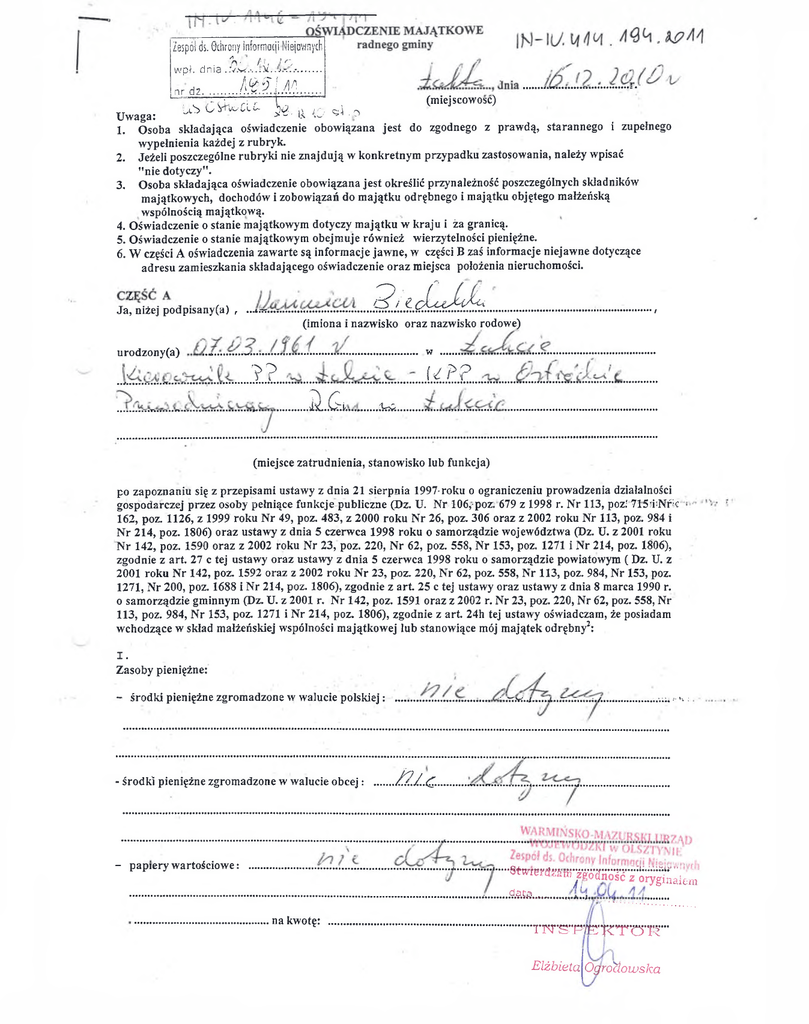 Zespól ds. ©chrony inform acji Niejawnych 'h ■ / >, i o w p ł. d n ia . .v.vź.-.. *\ i . nr dż............ / I M l M U iC fe U 5 ^ , i ,0 (miejscowosc) Uwaga: 1. Osoba składająca oświadczenie obowiązana jest do zgodnego z praw dą, starannego i zupełnego wypełnienia każdej z rubryk. 2. Jeżeli poszczególne rubryki nie znajdują w konkretnym przypadku zastosowania, należy wpisać "nie dotyczy". 3. Osoba składająca oświadczenie obowiązana jest określić przynależność poszczególnych składników majątkowych, dochodów i zobowiązań do m ajątku odrębnego i majątku objętego małżeńską wspólnością majątkową. 4. Oświadczenie o stanie majątkowym dotyczy m ajątku w kraju i ża granicą. 5. Oświadczenie o stanie majątkowym obejmuje również wierzytelności pieniężne. 6. W części A oświadczenia zaw arte są inform acje jaw ne, w części B zaś informacje niejawne dotyczące adresu zamieszkania składającego oświadczenie oraz miejsca położenia nieruchomości. Ja^niźej podpisany(a) , .... 2k<£JA.. ................................... .........- ......... (imiona i nazwisko oraz nazwisko rodowe) .................................... w ............................................................................ urodzony(a) ....* ? ? ić P P ........ A .G .i ................................................ ..... &eik....... (miejsce zatrudnienia, stanowisko lub funkcja) po zapoznaniu się z przepisami ustawy z dnia 21 sierpnia 1997-roku o ograniczeniu prowadzenia działalności gospodarczej przez osoby pełniące funkcje publiczne (Dz. U. N r 106,-poz. 679 z 1998 r. N r 113, poz.! 715?i;Nf;c 162, poz. 1126, z 1999 roku N r 49, poz. 483, z 2000 roku N r 26, poz. 306 oraz z 2002 roku N r 113, poz. 984 i N r 214, poz. 1806) oraz ustawy z dnia 5 czerwca 1998 roku o samorządzie województwa (Dz. U. z 2001 roku N r 142, poz. 1590 oraz z 2002 roku N r 23, poz. 220, N r 62, poz. 558, N r 153, poz. 1271 i N r 214, poz. 1806), zgodnie z art. 27 c tej ustawy oraz ustawy z dnia 5 czerwca 1998 roku o samorządzie powiatowym ( Dz. U. z 2001 roku N r 142, poz. 1592 oraz z 2002 roku N r 23, poz. 220, N r 62, poz. 558, N r 113, poz. 984, N r 153, poz. 1271, N r 200, poz. 1688 i N r 214, poz. 1806), zgodnie z art. 25 c tej ustawy oraz ustawy z dnia 8 marca 1990 r. o samorządzie gminnym (Dz. U. z 2001 r. N r 142, poz. 1591 oraz z 2002 r. Nr 23, poz. 220, N r 62, poz. 558, Nr 113, poz. 984, N r 153, poz. 1271 i N r 214, poz. 1806), zgodnie z art. 24h tej ustawy oświadczam, że posiadam wchodzące w skład małżeńskiej wspólności majątkowej lub stanowiące mój m ajątek odrębny2: I. Zasoby pieniężne: - środki pieniężne zgromadzone w walucie polskiej: - środki pieniężne zgromadzone w walucie o b cej: - papiery w artościow e: ........................ __.........................................................■ .¿ 2 l.c .......... Stwterasrftłn- f godność z oryginałem ..<?J.te..w............................................ , na kwotę: '■ m s T P E K T O r r Elżbieta Ogrodowska 1 . Dom o powierzchni: ...(.Ł l Ó........... m2, o wartości: ...... ......................................... 2 i..C tytuł praw ny: ..................... ............................................................................. .............................. 2 - . J'7 / ¿s ¿3* 2 . Mieszkanie o powierzchni: ......................... m , o w artości: ..¿.„..i...?................. tytuł p raw n y : .................................................................................................. 3. Gospodarstwo rolne: \ rodzaj gospodarstw a: ........................ . powierzchnia: ,/^ t <~ o w artości: .................................................................................................. rodzaj zabudow y: ..................................................................................... tytuł praw ny: ............................................................................................. Z tego tytułu osiągnąłem(ęłam) w roku ubiegłym przychód i dochód w wysokości: .................................................................. ........................... 4. Inne nieruchomości pow ierzchnia: .........iC .....} .......... ......................................k;v.£.v................................... o w artości: ............3 ..s£ ?....^p X ..'.,...... .CiLi.. -. A tytuł p ra w n y : .................. N S DL 1 . Posiadam udziały w spółkach handlowych z udziałem gminnych osób prawnych lub przedsiębiorców, w których uczestniczą takie osoby - należy podać i liczbę imitenta udziałów: ¿ t e k U L ............... udziały te stanowią pakiet większy niż 10% udziałów w spółce: WARMIŃSKO-MAZURSKI URZĄD ......... .............................................................................................................W.QJLWÓliZh'i..iK.aii§Z;iTN1E Zespół ds. Ochrony Inform acji Niejawnych Z tego tytułu osiągnąłem(ęłam) w roku ubiegłym dochód w wysokości: Stw ierdzam zgodność z oryginałem d a t a .......................... A k , Q h , A . 1 . ElżbietaOgM dąwska 2. Posiadam udziały w innych spółkach handlowych - należy podać^liwhę i emitenta udziałów: .............................................. ......... J Z tego tytułu osiągnąłem(ęłam) w roku ubiegłym dochód w wysokości: IV . 1. Posiadam akcje w spółkach handlowych z udziałem gminnych osób prawnych lub przedsiębiorców, w których uczestniczą takie osoby - należy podać liczbę i emitenta akcji: ................................ ............................. akcje te stanowią pakiet większy niż 10% akcji w spółce: Z tego tytułu osiągnąłem(ęłam) w roku ubiegłym dochód w wysokości: 2 . Posiadam akcje w innych spółkach handlowych - należy podać liczbę i emitenta akcji: V. Nabyłem(am) (nabył mój małżonek, z wyłączeniem mienia przynależnego do jego majątku odrębnego) od Skarbu Państwa