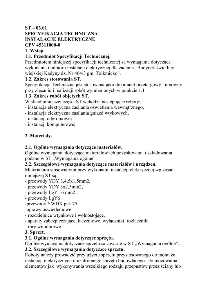ST – 03.01 SPECYFIKACJA TECHNICZNA INSTALACJE ELEKTRYCZNE CPV 45311000-0 1. Wstęp. 1.1. Przedmiot Specyfikacji Technicznej. Przedmiotem niniejszej specyfikacji technicznej są wymagania dotyczące wykonania i odbioru instalacji elektrycznej dla zadania „Budynek świetlicy wiejskiej Kadyny dz. Nr 464/3 gm. Tolkmicko”. 1.2. Zakres stosowania ST. Specyfikacja Techniczna jest stosowana jako dokument przetargowy i umowny przy zlecaniu i realizacji robót wymienionych w punkcie 1.1 1.3. Zakres robót objętych ST. W skład niniejszej części ST wchodzą następujące roboty: - instalacja elektryczna zasilania oświetlenia wewnętrznego, - instalacja elektryczna zasilania gniazd wtykowych, - instalacji odgromowej - instalacji komputerowej 2. Materiały. 2.1. Ogólne wymagania dotyczące materiałów. Ogólne wymagania dotyczące materiałów ich pozyskiwania i składowania podano w ST „Wymagania ogólne”. 2.2. Szczegółowe wymagania dotyczące materiałów i urządzeń. Materiałami stosowanymi przy wykonaniu instalacji elektrycznej wg zasad niniejszej ST są: - przewody YDY 3,4,5x1,5mm2, - przewody YDY 3x2,5mm2, - przewody LgY 16 mm2 , - przewody LgY6 -przewody YWDX pek 75 -oprawy oświetleniowe: - rozdzielnice wtynkowe i wolnostojące, - aparaty zabezpieczające, łączeniowe, wyłączniki, rozłączniki - rury winidurowe 3. Sprzet. 3.1. Ogólne wymagania dotyczące sprzętu. Ogólne wymagania dotyczace sprzetu sa zawarte w ST „Wymagania ogólne”. 3.2. Szczegółowe wymagania dotyczace sprzetu. Roboty należy prowadzić przy użyciu sprzętu przystosowanego do montażu instalacji elektrycznych oraz drobnego sprzętu budowlanego. Do mocowania elementów jak wykonywania wszelkiego rodzaju przepustów przez ściany lub stropy stosować wiertarki lub młoty udarowe. W przypadku gdy konieczne jest użycie sprzętu specjalistycznego do instalacji urządzeń należy wówczas postępować zgodnie z wytycznymi otrzymanymi od producenta danego sprzętu. Urządzenia stosowane do wykonania instalacji elektrycznej należy użytkowa zgodnie z ich przeznaczeniem. 4. Transport. 4.1. Ogólne wymagania dotyczace transportu. Ogólne zasady transportu sa zawarte w ST „Wymagania ogólne”. 4.2. Szczegółowe wymagania dotyczace transportu. Transport powinien zapewniać: - stabilność pozycji załadowywanych materiałów, - zabezpieczenie materiałów przed ich uszkodzeniem, - kontrole załadunku i wyładunku, Wszystkie kable przewozić w oryginalnych opakowaniach w takiej pozycji aby nie spowodować nadmiernego ich zginania i odkształcania od postaci w której zostały one pakowane. Stosować zalecenia i wymagania producenta odnośnie transportu kabli. Kable i przewody w zwojach nie moga byc rzucane i przeciągane po podłożu, lecz musza byc przenoszone. Transport kabli i przewodów przeprowadzić w taki sposób by nie spowodować uszkodzenia izolacji żył miedzianych. Wszelkiego rodzaju elementy służace do wykonywania konstrukcji koryt i drabinek kablowych przewozic w oryginalnych opakowaniach w pozycji poziomej tak by nie spowodować odkształceń i uszkodzen. Osprzet elektryczny przewozic w opakowaniach oryginalnych, zbiorczych tak by uniemożliwic wzajemne ich przesuwanie sie. Wszystkie oprawy oswietleniowe bezwzględnie transportować w oryginalnych opakowaniach. Należy przestrzegać zaleceń producenta odnośnie załadunku, transportu jak i wyładunku opraw oświetleniowych. Oprawy należy przewozić w taki sposób by uniemożliwic ich wzajemne przemieszczenia sie. Oprawy składać w pozycji poziomej w taki sposób by nie uszkodzić żadnych elementów. W szczególności należy zwrócić uwagę na transport opraw wyposażonych w elementy szklane tak by nie spowodować uszkodzeń powłoki lub stłuczen. Rozdzielnice elektryczne ( główna i pietrowe ) transportować w pozycji poziomej lub pionowej tak by nie uszkodzic elementów obudowy. Elementy służce do montażu (uchwyty, montażowe kołki rozporowe, opaski kablowe itp.) przewozić w oryginalnych opakowaniach zbiorczych. Przy przewozie należy przestrzegać przepisów obowiązujących w publicznym transporcie drogowym i kołowym. 5. Wykonanie robót 5.1. Ogólne warunki wykonania robót. Ogólne warunki wykonania robót zawarte sa w ST „Wymagania ogólne”. 5.2. Szczegółowe zasady wykonania robót. Rozdzielnice elektryczne. Rozdzielnice wyposażyć w wyłącznik główny umożliwiający rozłączenie wszystkich obwodów zasilanych z danej rozdzielni oraz zabezpieczenia poszczególnych obwodów podłączonych do danej rozdzielnicy. Wszystkie rozdzielnice elektryczne powinny być trwałe przytwierdzone do podłoża oraz zabezpieczone przed dostępem osób niepowołanych . Prowadzenie kabli zasilających. Wszystkie przewody zasilające poszczególne rozdzielnice (WLZ) należy układać w rurach winidurowych. We wszystkich pomieszczeniach komunikacyjnych ,Rurki montować przy pomocy wsporników naściennych. Kable zasilające rozdzielnice powinny byc trwałe zamocowane do koryt kablowych przy pomocy opasek samozaciskowych lub uchwytów montażowych tak aby istniała możliwość rozmieszczenia. . W miejscach wyprowadzenia kabli zasilających z koryta do rozdzielni kable układać w uprzednio wykonanych bruzdach. Po zamontowaniu kabli bruzdy należy trwale zabezpieczyć masa gipsowa. W miejscach gdzie kable prowadzone będą na tynku należy zastosować uchwyty dystansowe, które trwałe przytwierdza kabel do danej powierzchni. Należy unikać prowadzenia kabli w pobliżu wszelkich instalacji wodnokanalizacyjnych, gazowych i innych instalacji teletechnicznych. Wszystkie wejścia kabli WLZ do rozdzielnic należy wykonać zgodnie z DTR danej rozdzielnicy i zaleceniami producenta. Zakończenie kabli zasilających powinno być wykonane w sposób uniemożliwiający późniejsza ingerencje osób niepowołanych. Instalacja elektryczna zasilania oświetlenia wewnętrznego. W pomieszczeniach oprawy oświetleniowe montować za pomocą 
