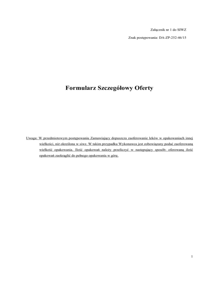 Załącznik nr 1 do SIWZ Znak postępowania: DA-ZP-252-46/15 Formularz Szczegółowy Oferty Uwaga: W przedmiotowym postępowaniu Zamawiający dopuszcza zaoferowanie leków w opakowaniach innej wielkości, niż określona w siwz. W takim przypadku Wykonawca jest zobowiązany podać zaoferowaną wielkość opakowania. Ilość opakowań należy przeliczyć w następujący sposób: oferowaną ilość opakowań zaokrąglić do pełnego opakowania w górę. 1 PAKIET Nr 1 Lp. 1 Nazwa leku Nazwa własna Dawka, wielkość opakowania Misoprostol 200mcg x 5 dopochwowch j.m. Ilość op 2 Cena jedn. brutto Wartość brutto systemów terapeutycznych Wartość brutto pakietu: ................................. zł Zastosowano stawkę VAT: .......... % Słownie: .................................................................. .................................................................... /podpis i pieczątka upoważnionego przedstawiciela/ 2 PAKIET Nr 2 Lp. Nazwa leku Nazwa własna Dawka, wielkość opakowania j.m. Ilość 1 Bromocriptine 2,5mg x 30tabl op 16 2 Pipemidic acid.200mg x 20tabl op 2 3 Metildigoxin 100mcg x 30tabl op 5 4 Lincomycin 0,5 g x 12 kaps op 3 Wartość brutto pakietu: ................................. zł Cena jedn. brutto Wartość brutto Zastosowano stawkę VAT: .......... % Słownie: .................................................................. .................................................................... /podpis i pieczątka upoważnionego przedstawiciela/ 3 PAKIET Nr 3 Lp. 1 Nazwa leku Nazwa własna Dawka, wielkość opakowania Glyceryl trinitrate 10mg/10ml x 10amp Wartość brutto pakietu: ................................. zł j.m. Ilość op 100 Cena jedn. brutto Wartość brutto Zastosowano stawkę VAT: .......... % Słownie: .................................................................. .................................................................... /podpis i pieczątka upoważnionego przedstawiciela/ 4 PAKIET Nr 4 Lp. 1 Nazwa leku Nazwa własna Dawka, wielkość opakowania Lincomycin 600mg/2ml x amp im.iv Wartość brutto pakietu: ................................. zł j.m. Ilość fiol 630 Cena jedn. brutto Wartość brutto Zastosowano stawkę VAT: .......... % Słownie: .................................................................. .................................................................... /podpis i pieczątka upoważnionego przedstawiciela/ 5 PAKIET Nr 5 Lp. Nazwa leku Nazwa własna Dawka, wielkość opakowania j.m. Ilość 1 Oxycodoni hydrochloridum 10mg/ml x 10amp op 360 2 Oxycodoni hydrochloridum 5mg x 60tabl. o przedłużonym uwalnianiu op 20 3 Oxycodoni hydrochloridum 10mg x 60tabl. o przedłużonym uwalnianiu op 40 4 Oxycodoni hydrochloridum 20mg x 60tabl. o przedłużonym uwalnianiu op 40 5 Oxycodoni hydrochloridum 40mg x 60tabl. o przedłużonym uwalnianiu op 20 6 Oxycodoni hydrochloridum 80mg x 60tabl. o przedłużonym uwalnianiu op 20 7 Oxycodoni hydrochloridum 1mg/ml - 250ml fl 120 Wartość brutto pakietu: ................................. zł Cena jedn. brutto Wartość brutto Zastosowano stawkę VAT: .......... % Słownie: .................................................................. .................................................................... /podpis i pieczątka upoważnionego przedstawiciela/ 6 PAKIET Nr 6 Lp. Nazwa leku Nazwa własna j.m. Dawka , wielkość opakowania 1 Urapidyl 100mg/20ml x 5amp Wartość brutto pakietu: ................................. zł op Ilość Cena jedn. zamawiana brutto Wartość brutto 400 Zastosowano stawkę VAT: .......... % Słownie: .................................................................. .................................................................... /podpis i pieczątka upoważnionego przedstawiciela/ 7 PAKIET Nr 7 Lp. 1 Nazwa leku Nazwa własna Dawka, wielkość opakowania Sufentanil 50mcg/ml-5ml x 5amp Wartość brutto pakietu: ................................. zł j.m. Ilość op 80 Cena jedn. brutto Wartość brutto Zastosowano stawkę VAT: .......... % Słownie: .................................................................. .................................................................... /podpis i pieczątka upoważnionego przedstawiciela/ 8 PAKIET Nr 8 Lp. 1 Nazwa leku Nazwa własna Dawka, wielkość opakowania Materiał wiskoelastyczny 2% roztwór hydroksypropylometylocelulozy; objętość ampułkostrzykawki 2,5 ml, lepkość - 5.000mPa-s, osmoralność- 265-300mOsmol/l, pH - 6,8-7,6 Wartość brutto pakietu: ................................. zł j.m. Ilość szt. 40 Cena jedn. brutto Wartość brutto Zastosowano stawkę VAT: .......... % Słownie: .................................................................. .................................................................... /podpis i pieczątka upoważnionego przedstawiciela/ 9