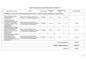 OFERTY NA REALIZACJĘ ZADAŃ PUBLICZNYCH W ROKU 2011r. Lp. I. 1 2 3 4 Nazwa zadania / nr sprawy Oferent Termin zadania Kwota zadania (w zł) Wnioskowana kwota (w zł) % Uwagi wydziału EZ. Profilaktyka i ochrona zdrowia –Edukacyjna opieka wychowawcza - wysokość środków przeznaczona na zadania 8 000 zł „Szkolenie kobiet z zakresu samokontroli piersi”. EZ.524.1.2011 „Spartakiada Zdrowia Promowanie Idei Honorowego Dawstwa Krwi wśród dzieci i młodzieży na terenie Powiatu Szczycieńskiego”. EZ.524.2.2011 „Olimpiada Zdrowy Styl Życia promowanie zasad zdrowego stylu życia wśród dzieci i młodzieży na terenie Powiatu Szczycieńskiego”. EZ.524.3.2011 „Promowanie Idei Honorowego Dawstwa Krwi wśród społeczeństwa Powiatu Szczycieńskiego poprzez organizację obchodów Dni HDK”. EZ.524.4.2011 Stowarzyszenie Na Rzecz Rozwoju Wsi Szymany, 12 – 100 Szczytno Szymany 12 01.06.2011r. – 04.12.2011 r. 3 600 zł 1 600 zł 44,44 0 Polski Czerwony Krzyż Warmińsko – Mazurski Zarząd Okręgowy w Olsztynie, 10 – 527 Olsztyn ul. Partyzantów 82 03.06.2011 r. – 15.07.2011r. 3 350 zł 1 500 zł 45 1 500,00 Polski Czerwony Krzyż Warmińsko – Mazurski Zarząd Okręgowy w Olsztynie, 10 – 527 Olsztyn ul. Partyzantów 82 03.10.2011r. – 15.12.2011r. 2 050 zł 900 zł 44 900,00 Polski Czerwony Krzyż Warmińsko – Mazurski Zarząd Okręgowy w Olsztynie, 10 – 527 Olsztyn ul. Partyzantów 82 02.11.2011 r. – 20.12.2011 r. 3 550 zł 1 500 zł 42 1 500,00 Kwota wnioskowana Środki rozdysponowane Rezerwa 5 500 zł 3 900, 00 4 100,00 str.1