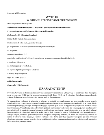 Sygn. akt VIRCa 194/13 WYROK W IMIENIU RZECZYPOSPOLITEJ POLSKIEJ Dnia 02 października 2013 roku Sąd Okręgowy w Olsztynie VI Wydział Cywilny Rodzinny w składzie: Przewodniczący: SSO Jolanta Biernat-Kalinowska Sędziowie: SO Elżbieta Schubert SR del do SO Natalia Rzewuska (spr.) Protokolant: st. sekr. sąd. Agnieszka Grandys po rozpoznaniu w dniu 02 października 2013 roku w Olsztynie na rozprawie sprawy z powództwa T. C. przeciwko małoletnim W. C. i A. C. zastąpionym przez ustawową przedstawicielkę M. C. o obniżenie alimentów na skutek apelacji powoda T. C. od wyroku Sądu Rejonowego w Olsztynie z dnia 27 maja 2013 roku sygn. akt III RC 309/13 oddala apelację. Sygn. akt VI RCa 194/13 UZASADNIENIE Powód T. C. wniósł o obniżenie alimentów zasądzonych w wyroku Sądu Okręgowego w Olsztynie z dnia 8 sierpnia 2012 r. w sprawie VI RC 537/12 na rzecz jego małoletnich dzieci W. C. i A. C. z kwot po 800 zł miesięcznie, łącznie 1.600 zł do kwot po 400 zł miesięcznie, łącznie po 800 zł miesięcznie. W uzasadnieniu wskazał, iż alimenty w obecnej wysokości są nieadekwatne do usprawiedliwionych potrzeb małoletnich oraz przewyższają jego możliwości zarobkowe i majątkowe. Jednocześnie podkreślił, iż w czasie, kiedy małoletni przebywają pod jego opieką (według jego wyliczeń 30% czasu w ciągu roku) pokrywa on wszelkie koszty ich utrzymania. Uzasadniając nieadekwatność potrzeb małoletnich w stosunku do przysługujących im alimentów powód obliczył, że koszt utrzymania każdego z małoletnich wynosi około 700 zł miesięcznie, w co nie należy wliczać kosztów opiekunki do dzieci, wyjazdów wakacyjnych, ferii zimowych, a także dodatkowych zajęć pozalekcyjnych, zakupu książek, zabawek, gier oraz wydatków na opiekę medyczną. Podniósł, że dzieci nie uczęszczają obecnie na żadne dodatkowe płatne zajęcia, a wszelkie wakacje i ferie do tej pory były organizowane przez powoda. Wskazał równie na radykalną zmianą w swojej sferze majątkowej, wiążącą się ze zmniejszeniem jego miesięcznych zarobków, które obecnie wynoszą 5.880 zł. Pozwani małoletni W. C. i małoletnia A. C. reprezentowani przez matkę M. C. w odpowiedzi na pozew wnieśli o jego oddalenie w całości oraz o zasądzenie na ich rzecz kosztów procesu według norm przepisanych. W uzasadnieniu pozwani podnieśli, iż w okresie od wydania wyroku rozwodowego nie uległa zmianie ani sytuacja małoletnich, ani też dochody powoda. Wskazali również, iż powód już w trakcie sprawy rozwodowej kwestionował uzasadnione potrzeby małoletnich, a niniejsze powództwo jest tylko polemiką z ustaleniami dokonanymi przez Sąd Okręgowy. Zdaniem matki małoletnich aktualne potrzeby małoletnich nie uległy zmianie. W dalszym ciągu dzieci uczęszczają na dodatkowe zajęcia, a dodatkowa opieka osoby trzeciej była także konieczna w czasie, kiedy strony mieszkały jeszcze razem. Sytuacja zawodowa powoda i osiągane przez niego dochody również nie uległy zmianie od czasu wspólnego pożycia rodziców małoletnich, a tym bardziej od czasu zakończenia sprawy rozwodowej. Wyrokiem z dnia 27 maja 2013 r. Sąd Rejonowy w Olsztynie oddalił powództwo. Sąd Rejonowy ustalił, że powód jest pracownikiem naukowym w stopniu doktora, pracującym między innymi na Uniwersytecie G. oraz w (...) Szkole Wyższej im. J. R.. Jego miesięczne zarobki z tych dwóch źródeł wynoszą około 5.880 zł netto. W związku z pracą na Uniwersytecie G. powodowi przysługuje dodatkowa trzynasta pensja. Powód mieszka obecnie w G.. Na miesięczne koszty utrzymania powoda składają się m. in. się koszty dojazdów do pracy, koszt hotelu asystenckiego. Powód przestał ponosić jakikolwiek wydatki związane z utrzymaniem domu w O., a także przestał dokładać się do spłat rat kredytu zaciągniętego na ten dom. Wydatki te ponosi obecnie w całości przedstawicielka ustawowa pozwanych. Rodzice małoletnich nie dokonali jeszcze podziału majątku wspólnego. Powód spędza z dziećmi średnio jeden weekend w miesiącu. W czasie kontaktu z małoletnimi powód zapewnia im różne atrakcje np. wyjścia do kina, na basen, do restauracji. Powód spędził z dziećmi również część ferii zimowych. Powód, tak jak w poprzednim czasie, leczy się na chorobę związaną ze zwyrodnieniem kręgosłupa oraz na astmę. Ma również problemy ze wzrokiem, co wymaga konsultacji specjalistycznych i zakupu niezbędnych środków profilaktycznych. Małoletni W. C. uczęszcza do szkoły podstawowej w G.. Dodatkowo chodzi na zajęcia taneczne. Małoletni uczęszcza również na dodatkowe zajęcia organizowane przez szkołę. W tym roku przystąpił do pierwszej komunii. Małoletni jest również alergikiem oraz wymaga leczenia przez specjalistę ortodontę. Comiesięczne leki alergiczne dla małoletniego kosztują około 50-100 zł. Koszt comiesięcznych wizyt u specjalisty ortodonty i dentysty wynosi około 150 zł. Małoletnia A. C. uczęszcza do przedszkola w G., którego koszt wynosi w zależności od miesiąca od około 300 do 360 zł miesięcznie. Dodatkowo chodzi na zajęcia taneczne oraz gimnastykę korekcyjną, rytmikę, robotykę, a także zajęcia z języka angielskiego, których łączny koszt to około 1.100 zł miesięcznie. Małoletnia wymaga również opieki dentystycznej i ortopedycznej związanej z wadą w budowie ścięgna A., z czym wiąże się potrzeba noszenia specjalistycznego obuwia, a także przyszły zabieg medyczny. Matka pozwanych M. C. zatrudniona jest w charakterze naukowym na Uniwersytecie (...)- (...). Prowadzi również indywidualną praktykę lekarską. Jej miesięczne dochody wynoszą średnio około 13.000 zł brutto. W ostatnim czasie dochody matki z tytułu pracy w szpitalu zmalały, albowiem miała mniej dyżurów. Po wyprowadzeniu się powoda poświęca ona więcej czasu dzieciom, a nadto w ostatnich miesiącach dużo czasu przeznaczała na naukę do egzaminu na II stopie