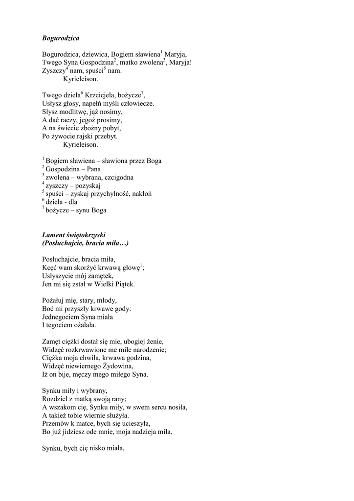 Bogurodzica Bogurodzica, dziewica, Bogiem sławiena1 Maryja, Twego Syna Gospodzina2, matko zwolena3, Maryja! Zyszczy4 nam, spuści5 nam. Kyrieleison. Twego dziela6 Krzcicjela, bożycze7, Usłysz głosy, napełń myśli człowiecze. Słysz modlitwę, jąż nosimy, A dać raczy, jegoż prosimy, A na świecie zbożny pobyt, Po żywocie rajski przebyt. Kyrieleison. 1 Bogiem sławiena – sławiona przez Boga Gospodzina – Pana 3 zwolena – wybrana, czcigodna 4 zyszczy – pozyskaj 5 spuści – zyskaj przychylność, nakłoń 6 dziela - dla 7 bożycze – synu Boga 2 Lament świętokrzyski (Posłuchajcie, bracia miła…) Posłuchajcie, bracia miła, Kcęć wam skorżyć krwawą głowę1; Usłyszycie mój zamętek, Jen mi się zstał w Wielki Piątek. Pożałuj mię, stary, młody, Boć mi przyszły krwawe gody: Jednegociem Syna miała I tegociem ożalała. Zamęt ciężki dostał się mie, ubogiej żenie, Widzęć rozkrwawione me miłe narodzenie; Ciężka moja chwila, krwawa godzina, Widzęć niewiernego Żydowina, Iż on bije, męczy mego miłego Syna. Synku miły i wybrany, Rozdziel z matką swoją rany; A wszakom cię, Synku miły, w swem sercu nosiła, A takież tobie wiernie służyła. Przemów k matce, bych się ucieszyła, Bo już jidziesz ode mnie, moja nadzieja miła. Synku, bych cię nisko miała, Niecoć bych ci wspomagała Twoja głowka krzywo wisa, tęć bych ja podparła; Krew po tobie płynie, tęć bych ja utarła; Picia wołasz, piciać bych ci dała, Ale nie lza2 dosiąc twego świętego ciała. O anjele Gabryjele, Gdzie jest ono twe wesele, Cożeś mi go obiecował tako barzo wiele, A rzekęcy: „Panno, pełna jeś miłości!” A ja pełna smutku i żałości. Sprochniało we mnie ciało i moje wszytki kości. Proścież Boga, wy miłe i żądne maciory3, By wam nad dziatkami nie były takie to pozory, Jele ja nieboga ninie dziś zeźrzała Nad swym, nad miłym Synem krasnym, Iż on cirpi męki nie będąc w żadnej winie. Nie mam ani będę mieć jinego, Jedno ciebie, Synu, na krzyżu rozbitego. 1 kcęć wam skarżyć krwawą głowę – chcę się wam poskarżyć nie lza – nie można 3 żądne maciory – potrzebujące matki 2 Rozmowa mistrza Polikarpa ze Śmiercią Polikarpus, tak wezwany, Mędrzec wieliki, mistrz wybrany, Prosił Boga o to prawie, By uźrzał śmierć w jej postawie. Gdy się moglił Bogu wiele, Ostał wszech ludzi w kościele, Uźrzał człowieka nagiego, Przyrodzenia niewieściego, Obraza wieimi skaradego, Łoktuszą przepasanego. Chuda, blada, żołte lice Liści się jako miednica; Upadł ci jej koniec nosa, Z oczu płynie krwawa rosa; Przewiązała głowę chustą, Jako samojedź krzywousta; Nie było warg u jej gęby, Poziewając skrzyta zęby; Miece oczy zawracając, Groźną kosę w ręku mając; Goła głowa, przykra mowa, Ze wszech stron skarada postawa Wypięła żebra i kości, Groźne siecze przez lutości. Mistrz widząc obraz skarady, Żołte oczy, żywot blady, Groźne się tego przelękną!, Padł na ziemię, eże steknął. Gdy leżał wznak jako wiła, Śmierć do niego przemowiła: - Czemu się tako barzo lękasz? Wrzekomoś zdrow, a [w]żdy stękasz! Pan Bog tę rzecz tako nosił, Iżeś go o to barzo prosił, Abych ci się ukazała, Wszytkę swą moc wzjawiła; Otoż ci przed tobą stoję, Oglądaj postawę moje: Każdemu się tak ukażę, Gdy go żywota zbawię. Nie lękaj się mię tym razem, Iż mię widzisz przed obrazem; Gdy przyde, namilejszy, k tobie, Tedy barzo zeckniesz sobie: Zableszczysz na strony oczy, Eż ci z ciała pot poskoczy; Rzucęć się, jako kot na myszy, Aż twe sirce ciężko wdyszy. Otchoceć się z miodem tarnek, Gdyć przyniosę jadu garnek Musisz ji pić przez dzięki; Gdy pożywiesz wielikiej męki, Będziesz mieć dosyć tesnice, Ot będziesz swej miłośnice. Ostań tego wszech, tobie wiele, Przez dzięki cię z nią rozdzielę. Mow ze mną, boć mam działo, Gdy o się ze mną mowić chciało;.. Magister respondit: Mistrz przemowił wielmi skromnie: Lęknąłem się, eż nic po mnie. Ta mi rzecz barzo niemiła, Iżeś mię tako postraszyła; By była co przykrego przemowiła, Zerwałaby się we mnie każda żyła; Nagle by mię umorzyła I duszę by wypędziła. Proszę ciebie, ostąp mało, Boć nie wiem, coć mi się stało: Mgleję wszytek i bladzieję. Straciłem zdrowie i nadzieję; Racz rzucić od siebie kosę, Ać swoję głowę podniosę! Mors dicit: Darma, mistrzu, twoja mowa, Tegom ci uczynić nie gotowa; Dzirżę kosę na reistrze, Siekę doktory i mistrze, Zawżdy ją gotową noszę, Przez dzięki noclegu proszę. Wstań ku mnie, możesz mi wierzać, Nie chcęć się dzisia zniewierzać! Wstał mistrz jedwo lelejąc się, Drżą mu nogi, przelęknął się. Magister dicit: Miła Śmierci, gdzieś się wzięła, Dawno liś się urodziła? Rad bych wiedział do ostatka, Gdzie twoj ociec albo matka. Mors dicit: Gdy stworzył Bog człowieka, Iżby był żyw eż do wieka, Stworzył Bog Jewę z kości Adamowi ku radości. Dał jemu moc nad źwierzęty, By panował jako święty; Podał jemu ryby z morza Chcąc go zbawić wszego gorza; Polecił mu rajskie sady Chcąc ji zbawić wszej biady. To wszytko w jego moc dał, Jedno mu drzewo zakazał, By go owszejki nie ruszał Ani się na nie pokuszał, Rzeknąc jemu: "Jedno ruszysz, Tedy pewno umrzeć musisz!" Ale zły duch Jewę zdradził, Gdy jej owoc ruszyć radził. Ewa się ułakomiła, Śmiałość uczyniła; W ten czas się ja poczęła; Gdy Ewa jabłko ruszyła; Adamowi jebłka dała, A ja w onem jebłk[u] była. Adam mię w jebłce ukusił, Przeto przez mię umrzeć musił; W tem Boga barzo obraził, Wszytko swe plemię zaraził. Magister dicit: Mila Śmirci, racz mi wzjewić, Przecz chcesz ludzie żywota zbawić, Czemu twą łaskę stracili. Zać co złego uczynili! Chcem do ciebie poczty nosić, Aby się dała przeprosić; Dał bych dobry kołacz upiec, Bych mogł przed tobą uciec. Mors dicit: Chowaj sobie poczty swoje, Rozdrażn