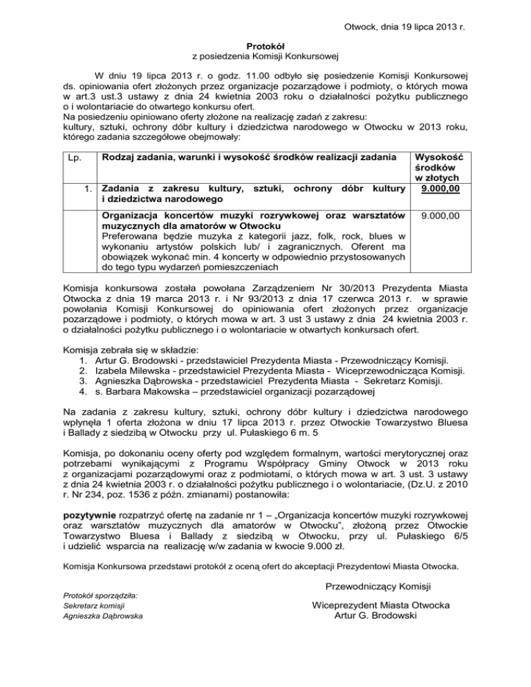 Otwock, dnia 19 lipca 2013 r. Protokół z posiedzenia Komisji Konkursowej W dniu 19 lipca 2013 r. o godz. 11.00 odbyło się posiedzenie Komisji Konkursowej ds. opiniowania ofert złożonych przez organizacje pozarządowe i podmioty, o których mowa w art.3 ust.3 ustawy z dnia 24 kwietnia 2003 roku o działalności pożytku publicznego o i wolontariacie do otwartego konkursu ofert. Na posiedzeniu opiniowano oferty złożone na realizację zadań z zakresu: kultury, sztuki, ochrony dóbr kultury i dziedzictwa narodowego w Otwocku w 2013 roku, którego zadania szczegółowe obejmowały: Lp. Rodzaj zadania, warunki i wysokość środków realizacji zadania Wysokość środków w złotych 9.000,00 1. Zadania z zakresu kultury, sztuki, ochrony dóbr kultury i dziedzictwa narodowego Organizacja koncertów muzyki rozrywkowej oraz warsztatów muzycznych dla amatorów w Otwocku Preferowana będzie muzyka z kategorii jazz, folk, rock, blues w wykonaniu artystów polskich lub/ i zagranicznych. Oferent ma obowiązek wykonać min. 4 koncerty w odpowiednio przystosowanych do tego typu wydarzeń pomieszczeniach 9.000,00 Komisja konkursowa została powołana Zarządzeniem Nr 30/2013 Prezydenta Miasta Otwocka z dnia 19 marca 2013 r. i Nr 93/2013 z dnia 17 czerwca 2013 r. w sprawie powołania Komisji Konkursowej do opiniowania ofert złożonych przez organizacje pozarządowe i podmioty, o których mowa w art. 3 ust 3 ustawy z dnia 24 kwietnia 2003 r. o działalności pożytku publicznego i o wolontariacie w otwartych konkursach ofert. Komisja zebrała się w składzie: 1. Artur G. Brodowski - przedstawiciel Prezydenta Miasta - Przewodniczący Komisji. 2. Izabela Milewska - przedstawiciel Prezydenta Miasta - Wiceprzewodnicząca Komisji. 3. Agnieszka Dąbrowska - przedstawiciel Prezydenta Miasta - Sekretarz Komisji. 4. s. Barbara Makowska – przedstawiciel organizacji pozarządowej Na zadania z zakresu kultury, sztuki, ochrony dóbr kultury i dziedzictwa narodowego wpłynęła 1 oferta złożona w dniu 17 lipca 2013 r. przez Otwockie Towarzystwo Bluesa i Ballady z siedzibą w Otwocku przy ul. Pułaskiego 6 m. 5 Komisja, po dokonaniu oceny oferty pod względem formalnym, wartości merytorycznej oraz potrzebami wynikającymi z Programu Współpracy Gminy Otwock w 2013 roku z organizacjami pozarządowymi oraz z podmiotami, o których mowa w art. 3 ust. 3 ustawy z dnia 24 kwietnia 2003 r. o działalności pożytku publicznego i o wolontariacie, (Dz.U. z 2010 r. Nr 234, poz. 1536 z późn. zmianami) postanowiła: pozytywnie rozpatrzyć ofertę na zadanie nr 1 – „Organizacja koncertów muzyki rozrywkowej oraz warsztatów muzycznych dla amatorów w Otwocku”, złożoną przez Otwockie Towarzystwo Bluesa i Ballady z siedzibą w Otwocku, przy ul. Pułaskiego 6/5 i udzielić wsparcia na realizację w/w zadania w kwocie 9.000 zł. Komisja Konkursowa przedstawi protokół z oceną ofert do akceptacji Prezydentowi Miasta Otwocka. Przewodniczący Komisji Protokół sporządziła: Sekretarz komisji Agnieszka Dąbrowska Wiceprezydent Miasta Otwocka Artur G. Brodowski
